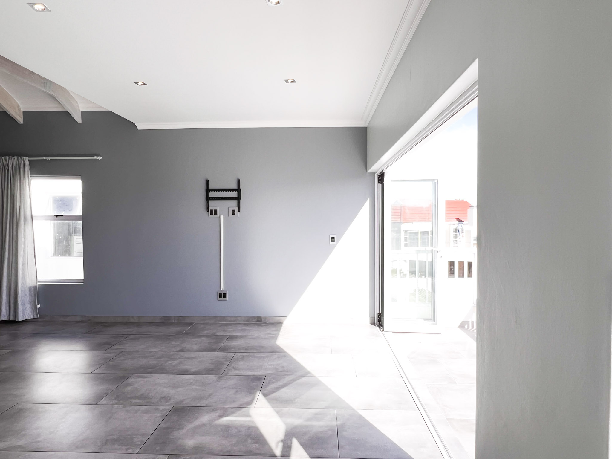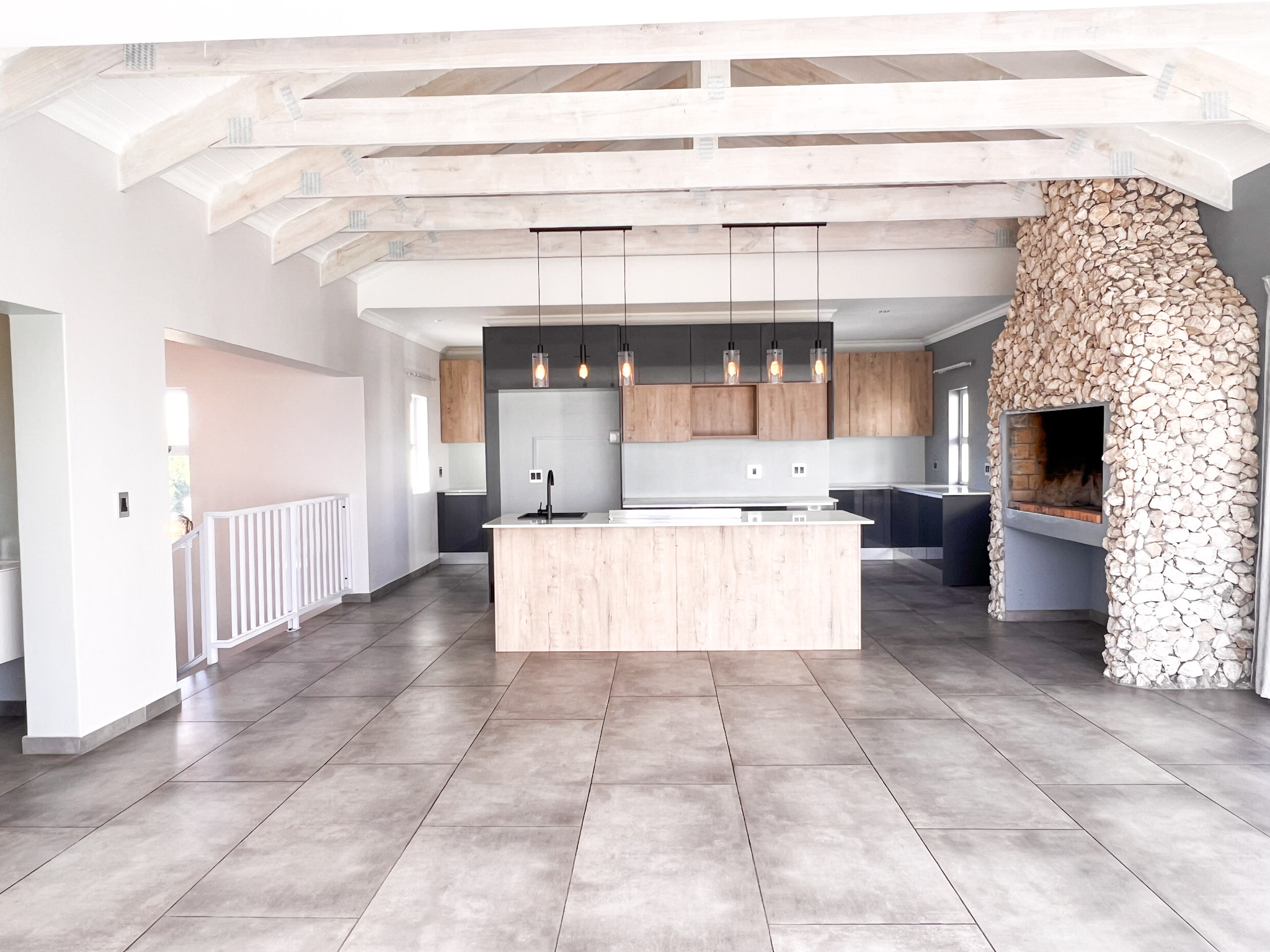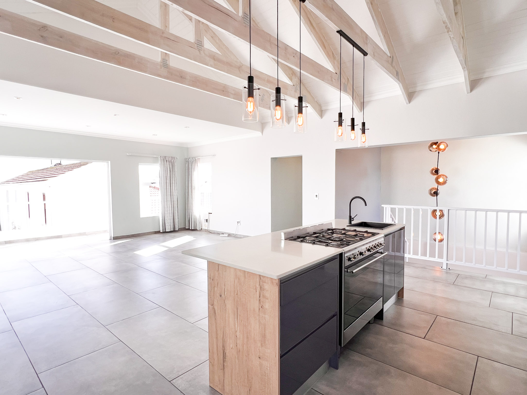 Open-plan living space with exposed trusses, adding a touch of architectural charm