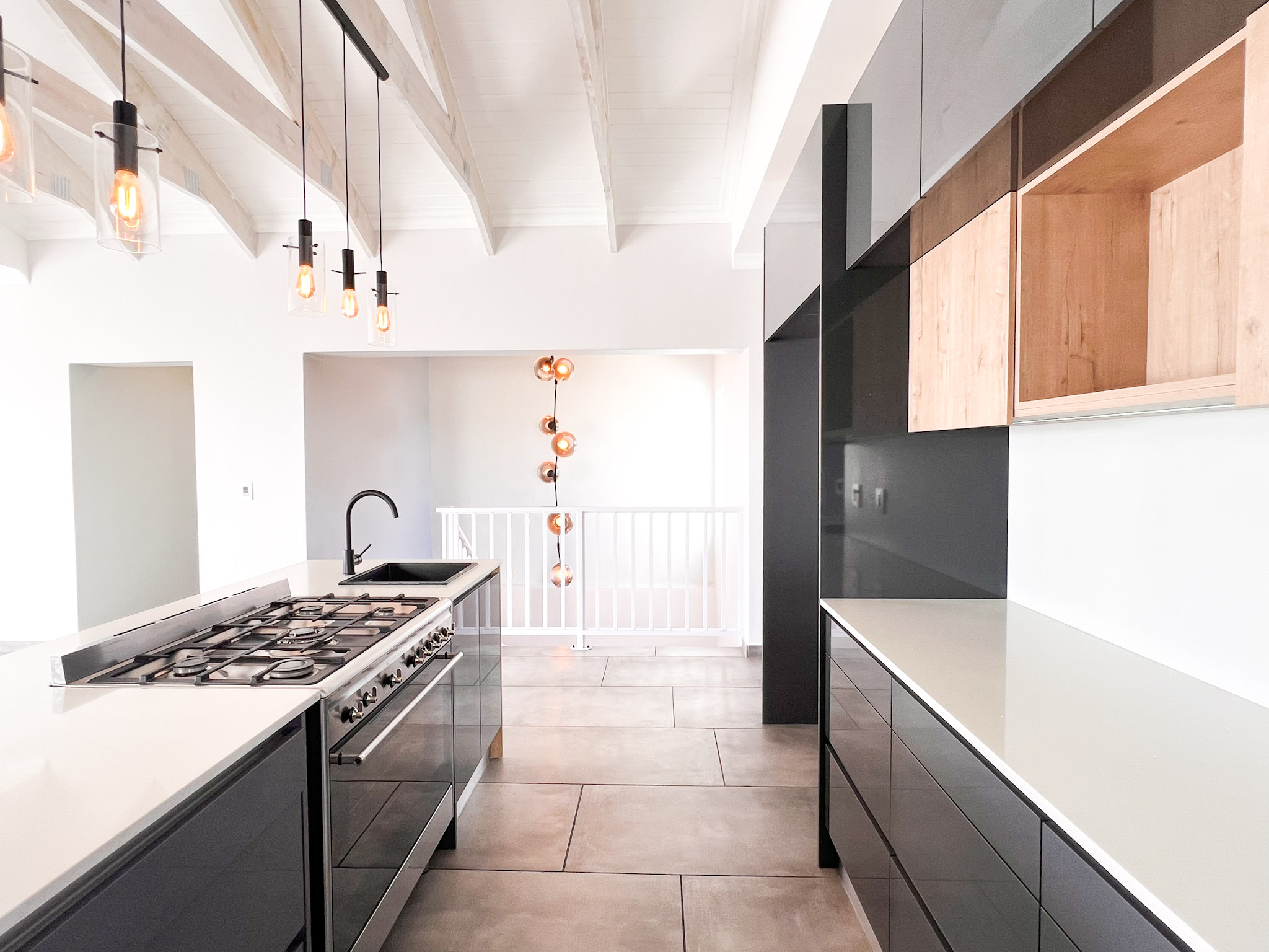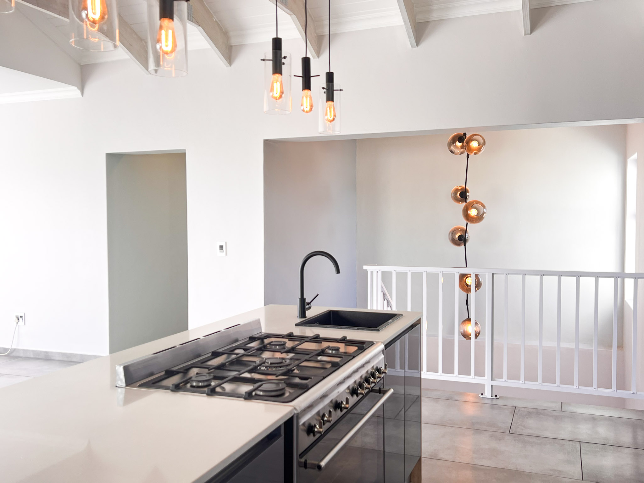 Modern kitchen with gas stove, prep bowl, and ample counter space