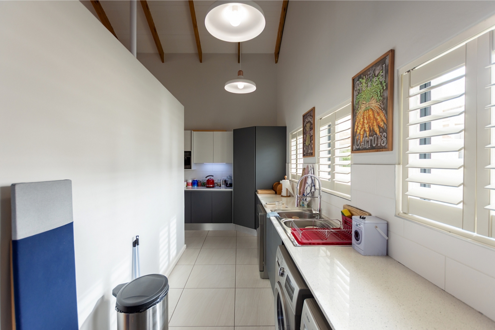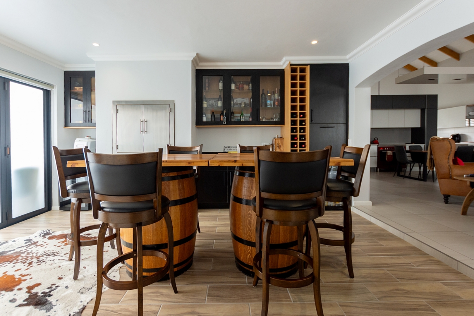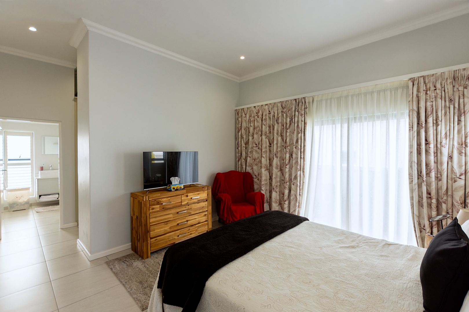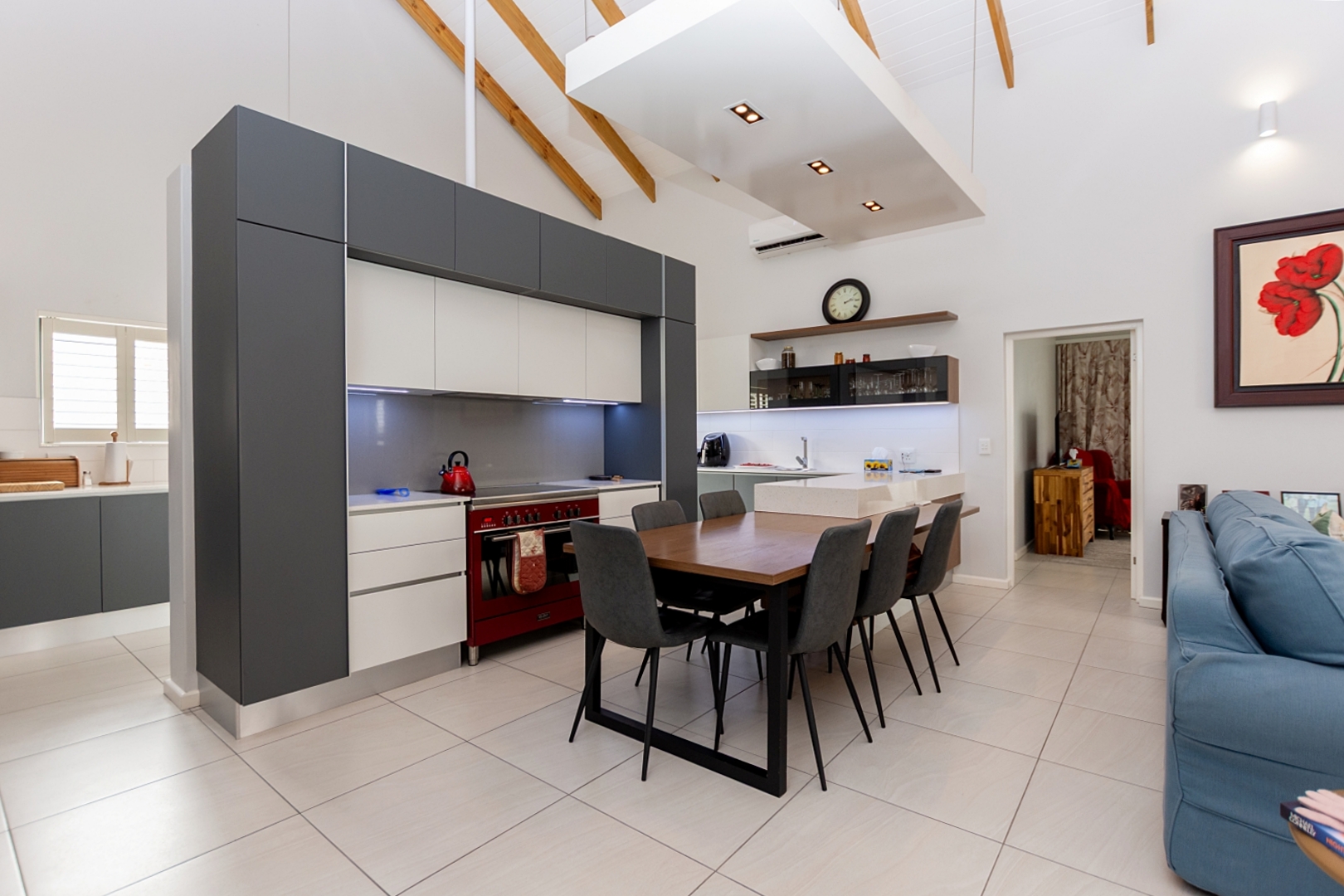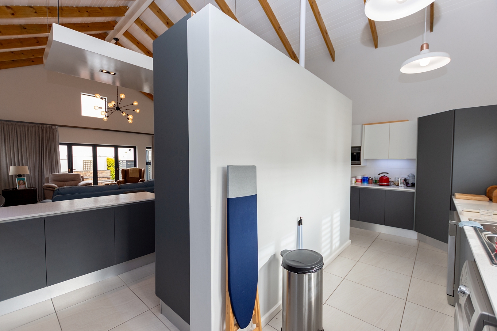 The open-plan lounge and dining area is a true highlight, boasting a stylish layout perfect for entertaining. A modern kitchen complements the space, complete with a scullery and walk-in pantry for extra functionality.