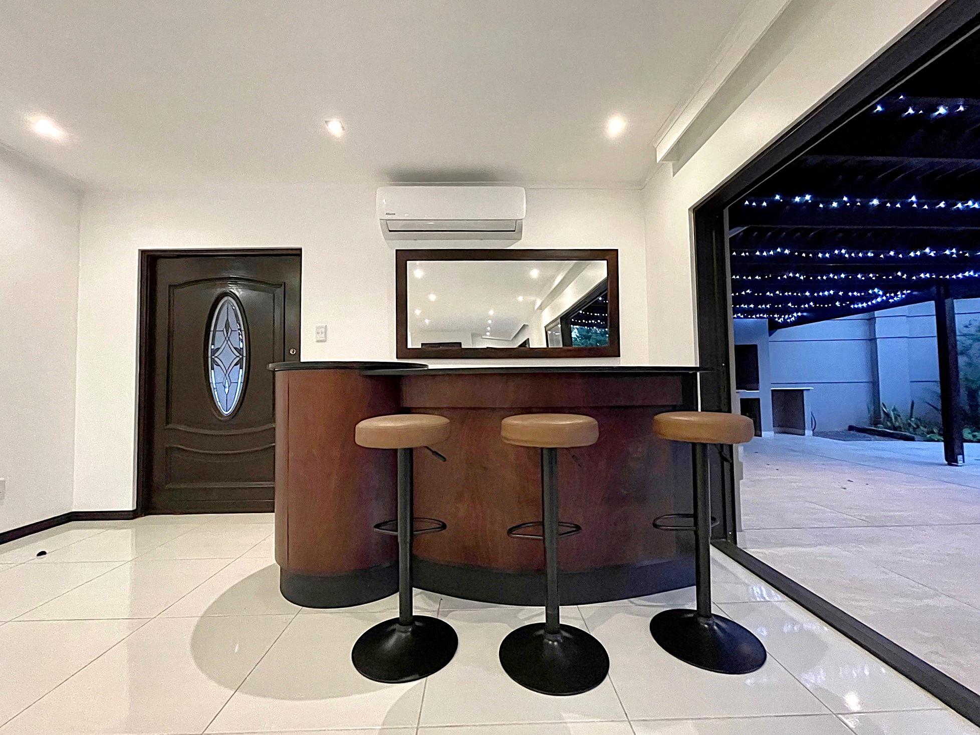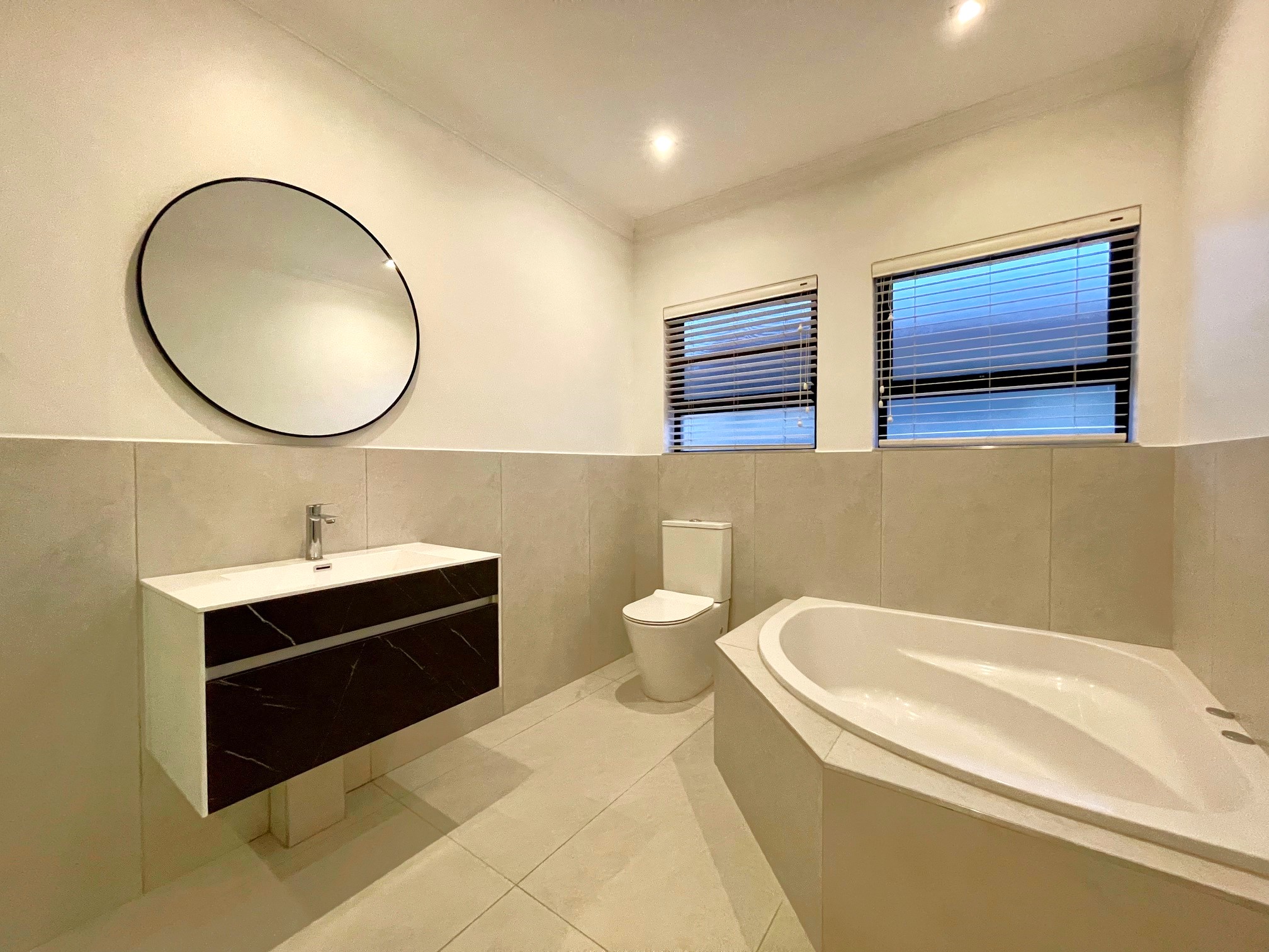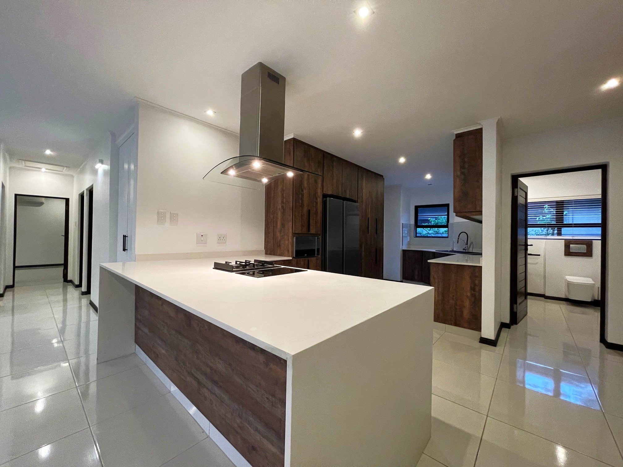 The open-plan living spaces are light-filled and inviting, with a seamless flow between the lounge, dining, and designer kitchen. High-quality finishes and a soothing neutral palette create a sense of calm sophistication, while large glass doors open to a covered patio overlooking the private garden, built in braai and sparkling pool — the ideal setting for elegant entertaining alfresco dinning and tranquil outdoor living.