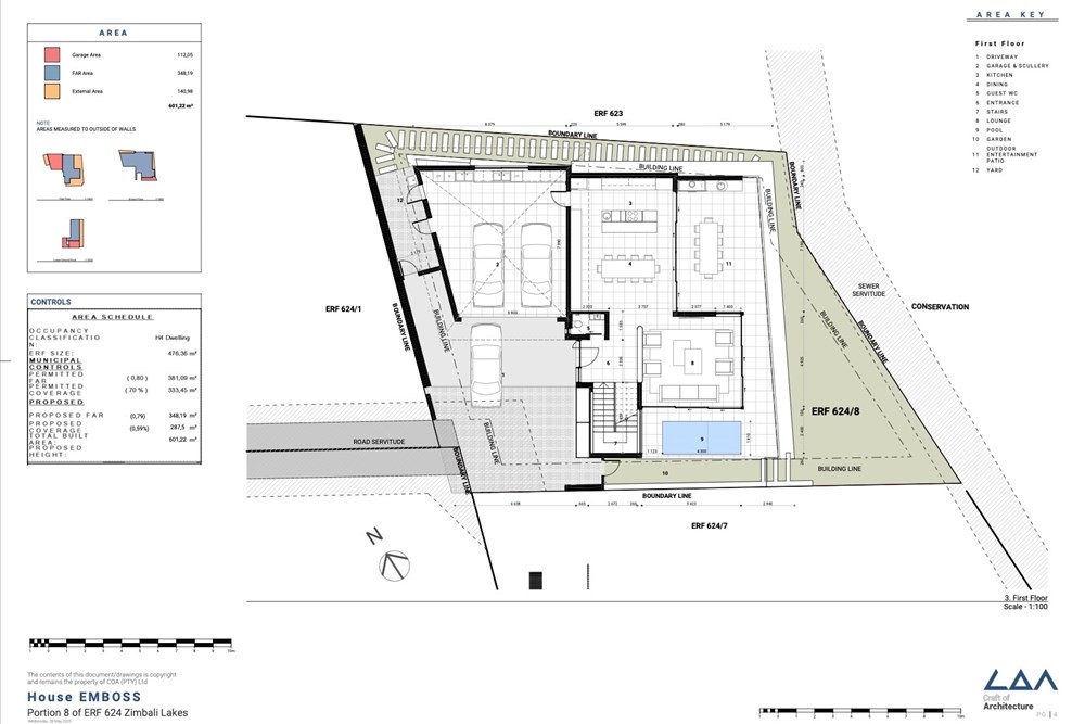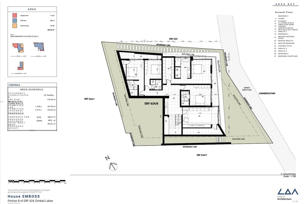 Property Features5 bedrooms, all en suite (including a master suite with dressing room and private patio)Multiple lounges across different levels for formal and casual livingGourmet kitchen with modern finishes, scullery, and drying yardOutdoor entertainment spaces including a boma and covered patiosSwimming pool surrounded by landscaped gardensCinema room for private screeningsTriple garage plus additional parkingCentral courtyard for natural light and air flow