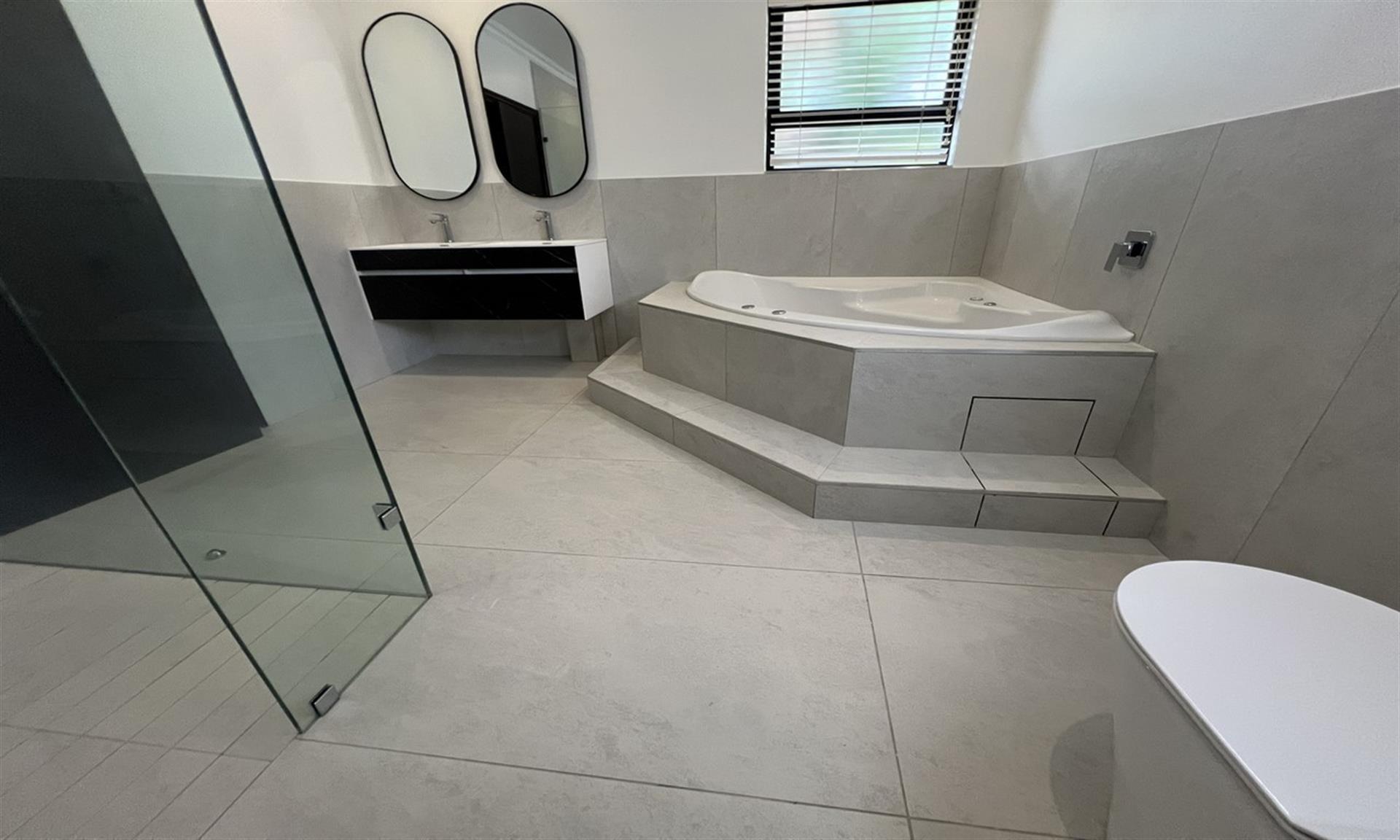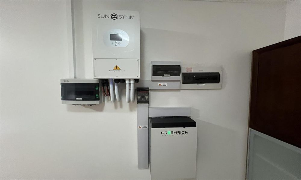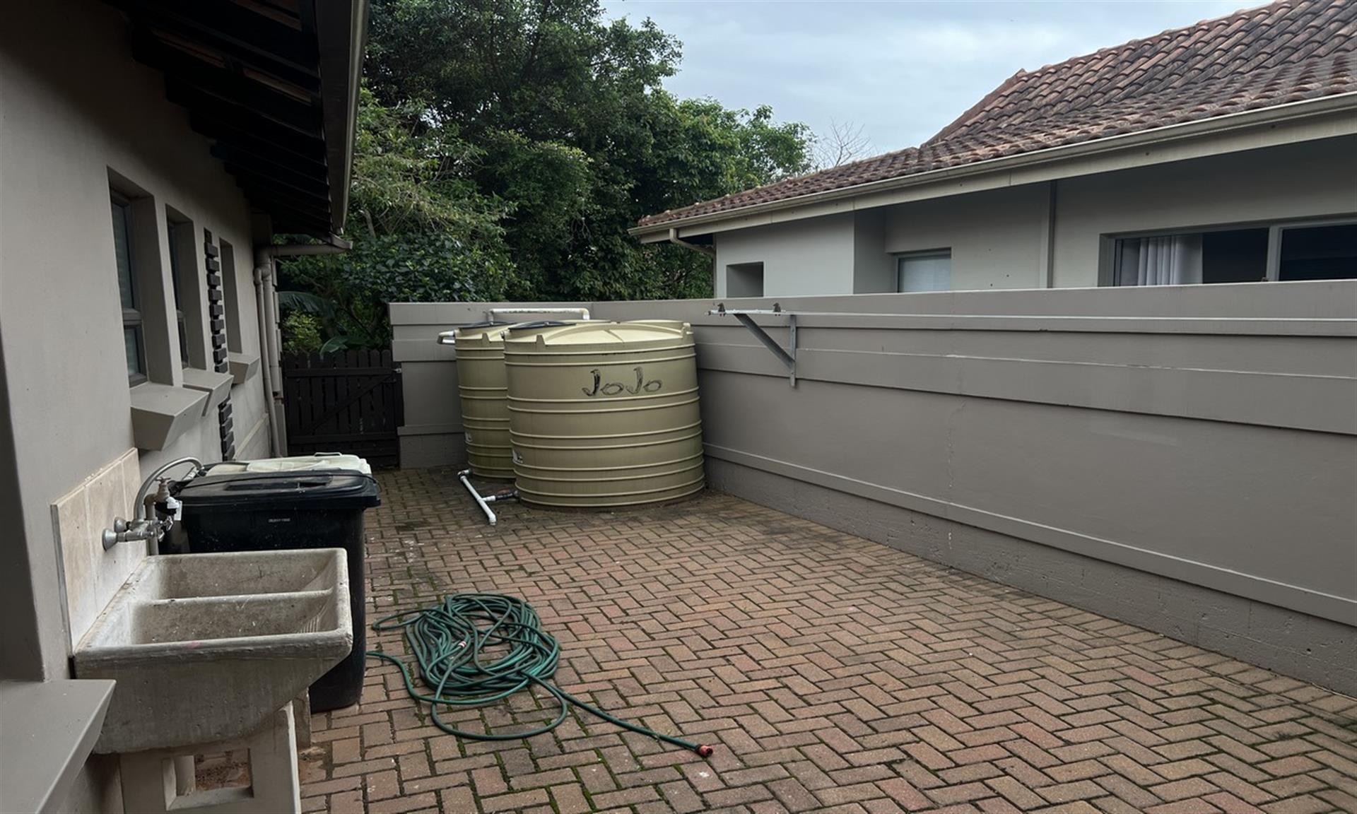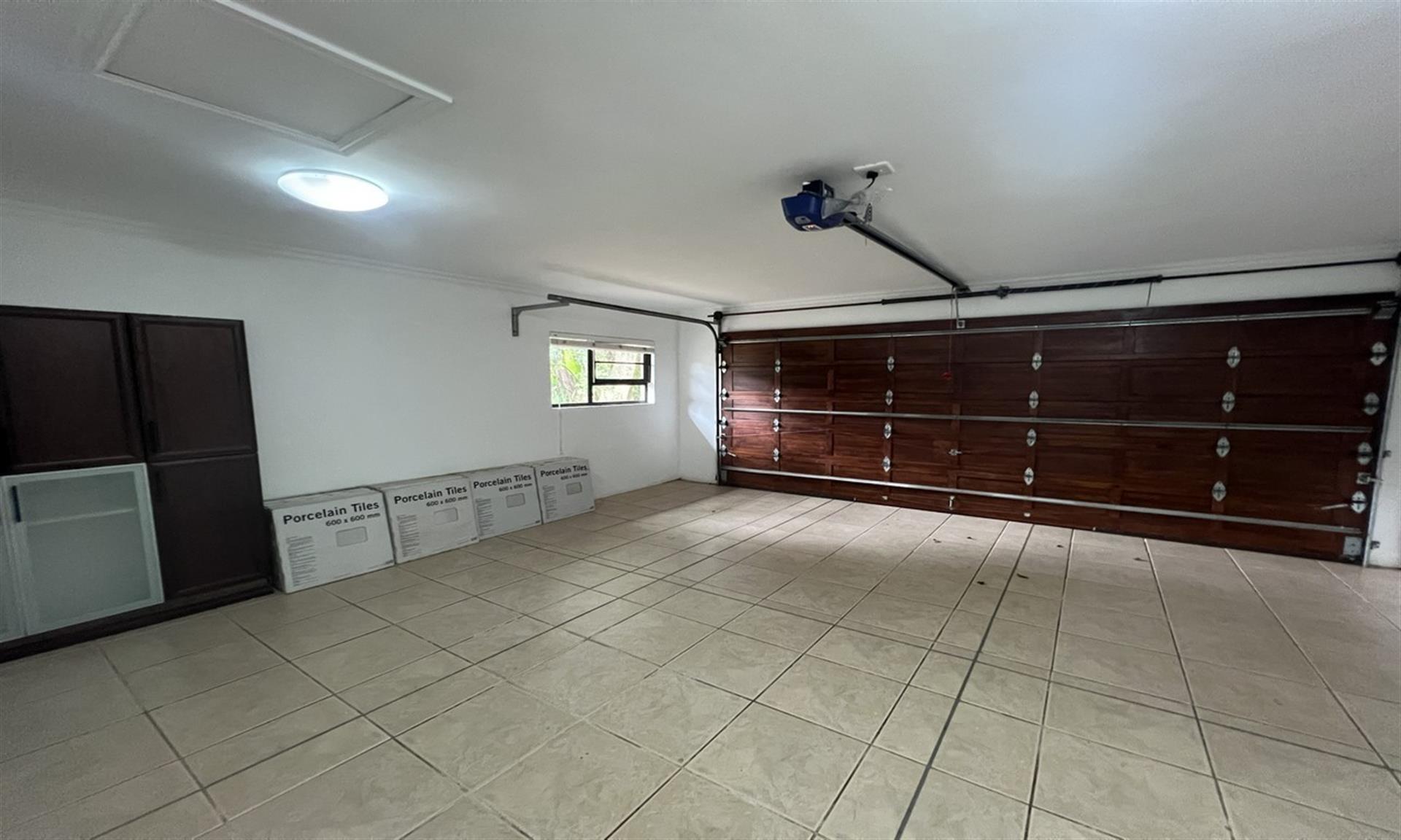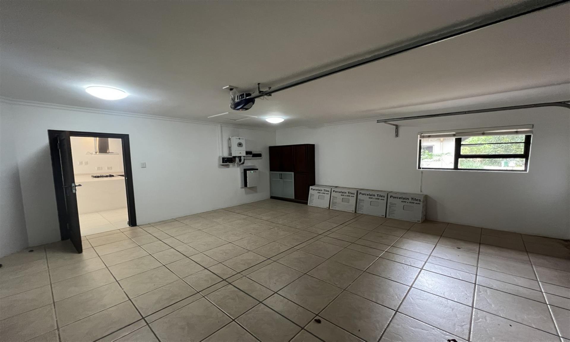 Practical modern features include a solar backup system with panels, inverter, and battery, ensuring uninterrupted power supply. The double automated garage houses the system neatly, while rainwater harvesting is managed via two 2,200-litre tanks with a pump connected to the toilets and an outdoor tap for garden irrigation.