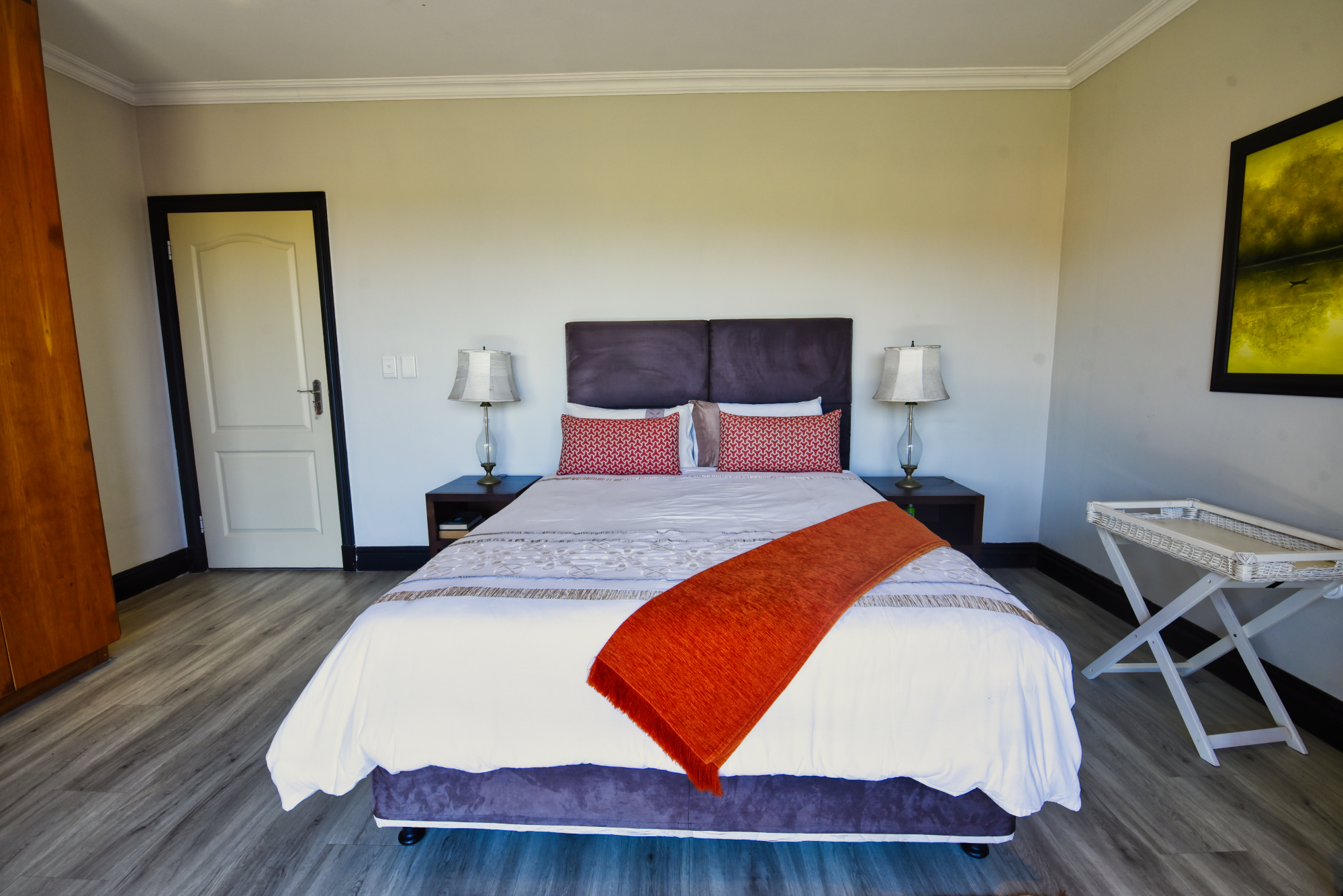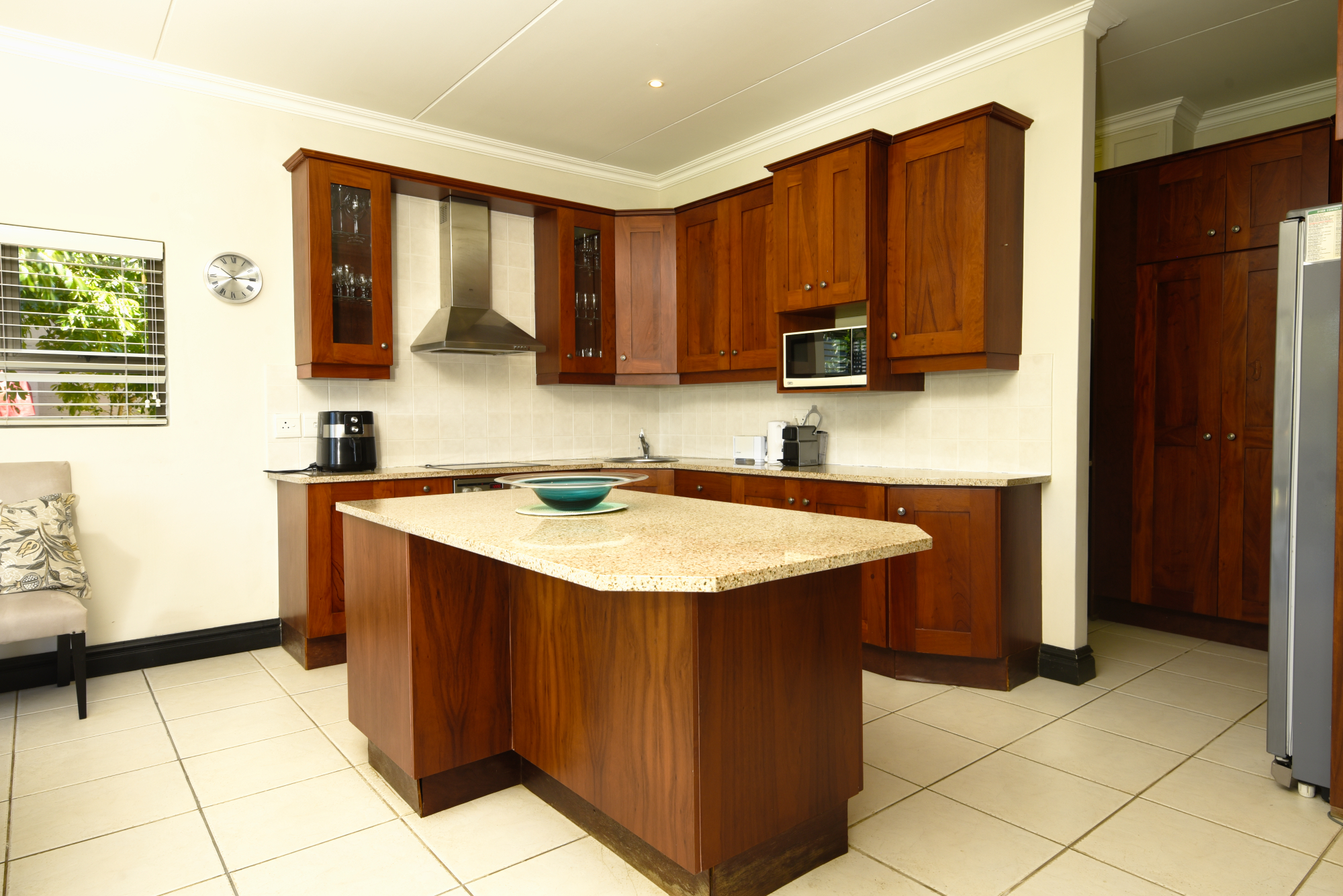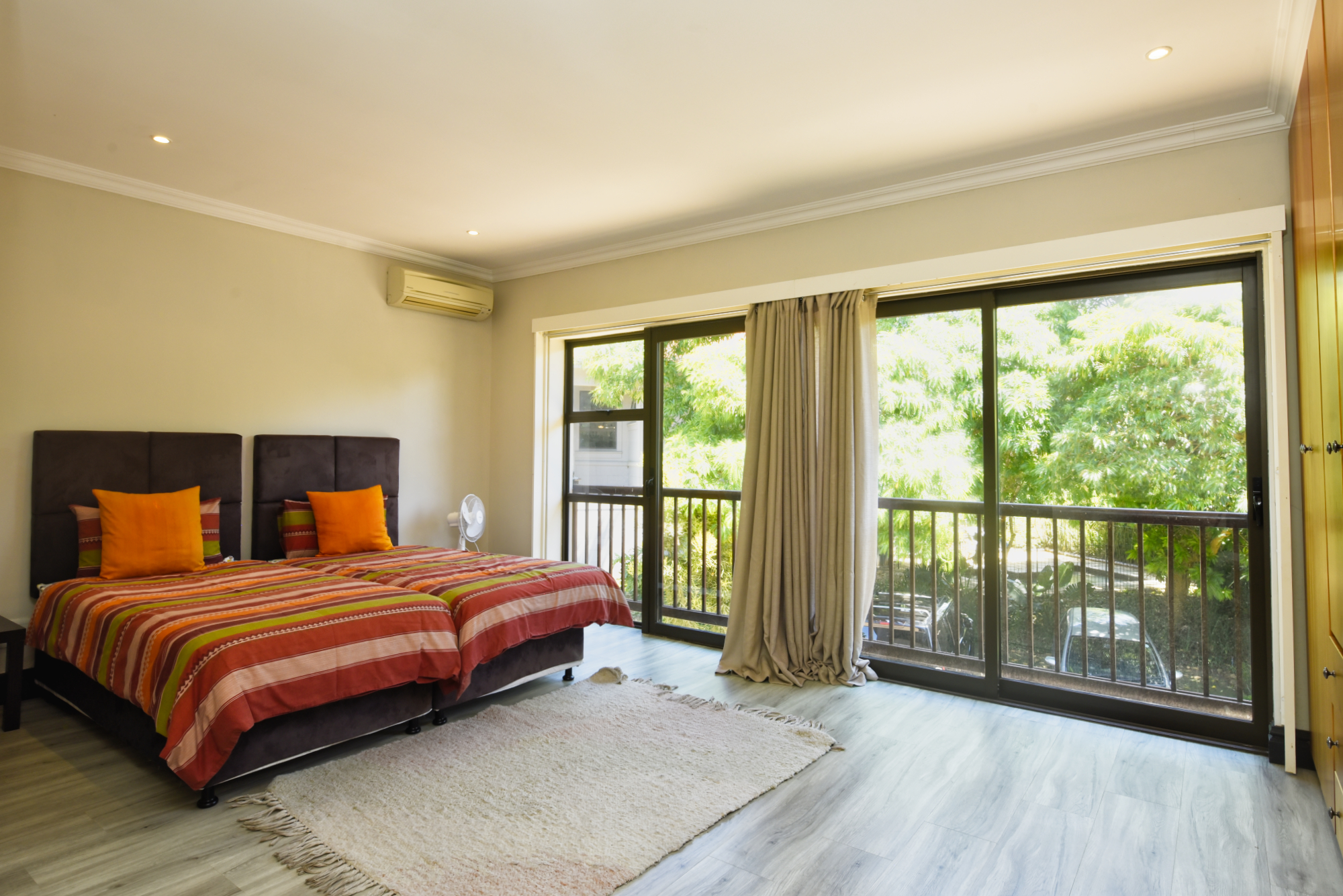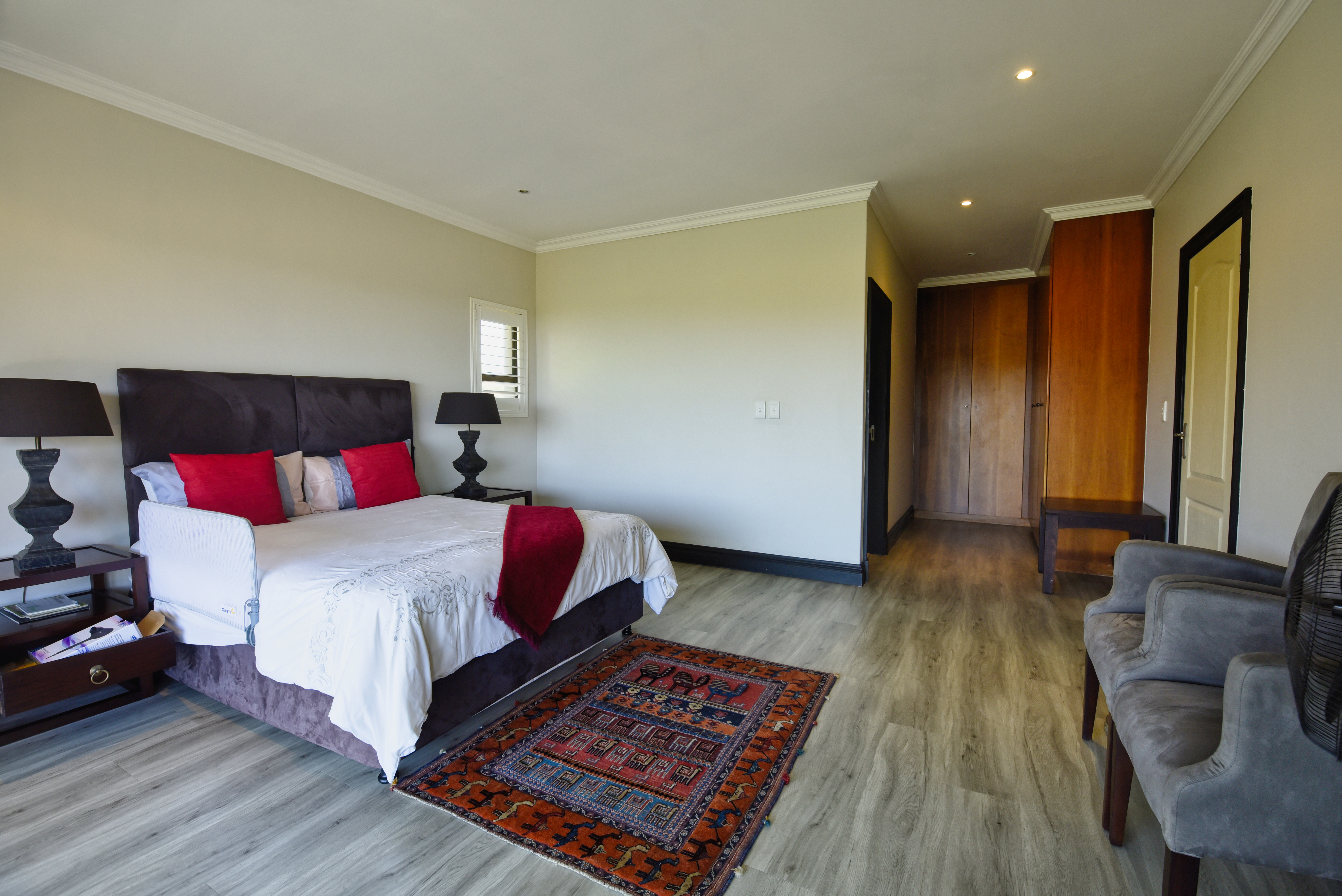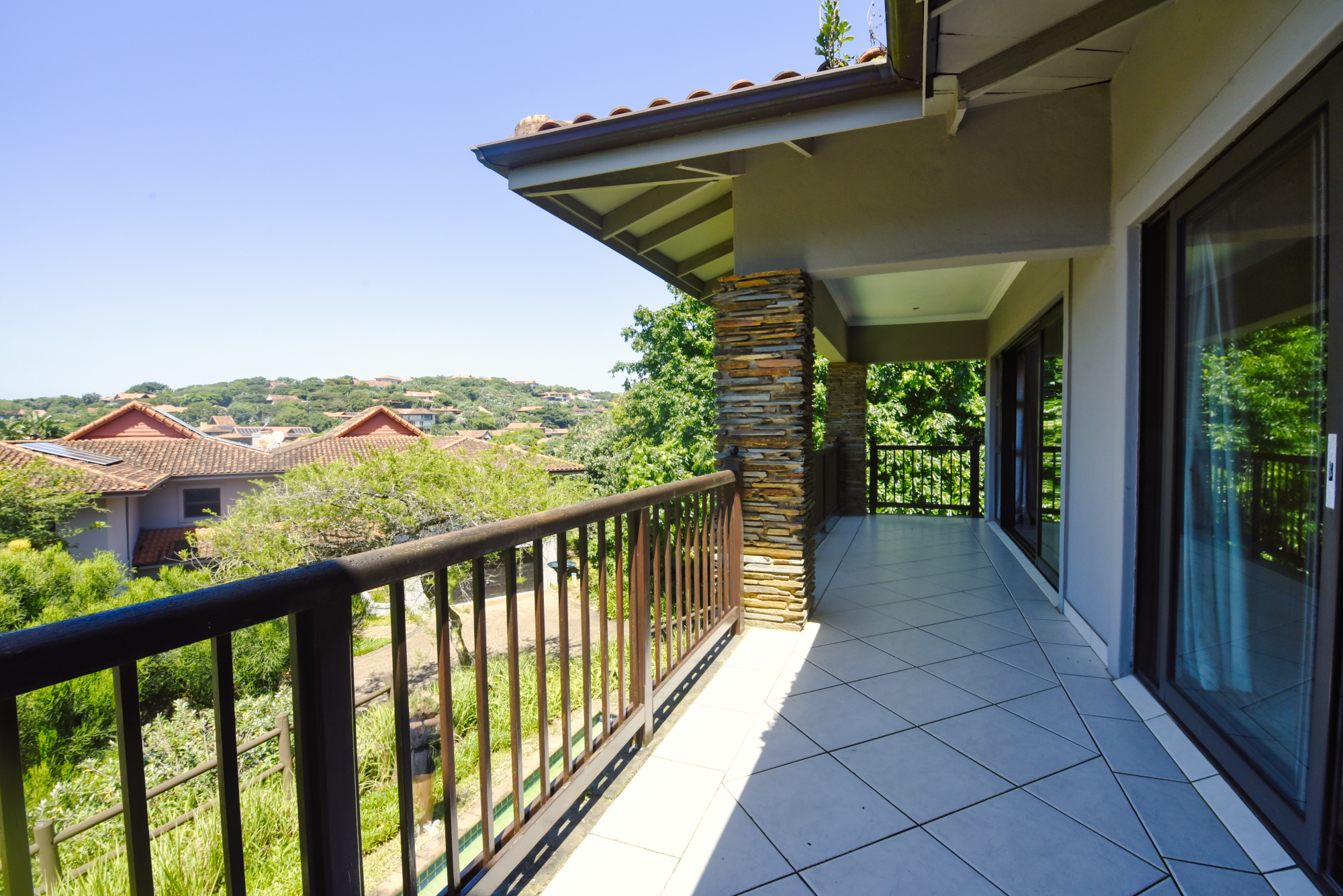All accommodation is situated on the upper level. The main en-suite bedroom, along with an additional bedroom, opens out to capture elevated estate vistas and distant ocean views, while a generously sized family bedroom enjoys its own private balcony. American-style shutters throughout the bedrooms add a timeless finish and enhance privacy and light control.
