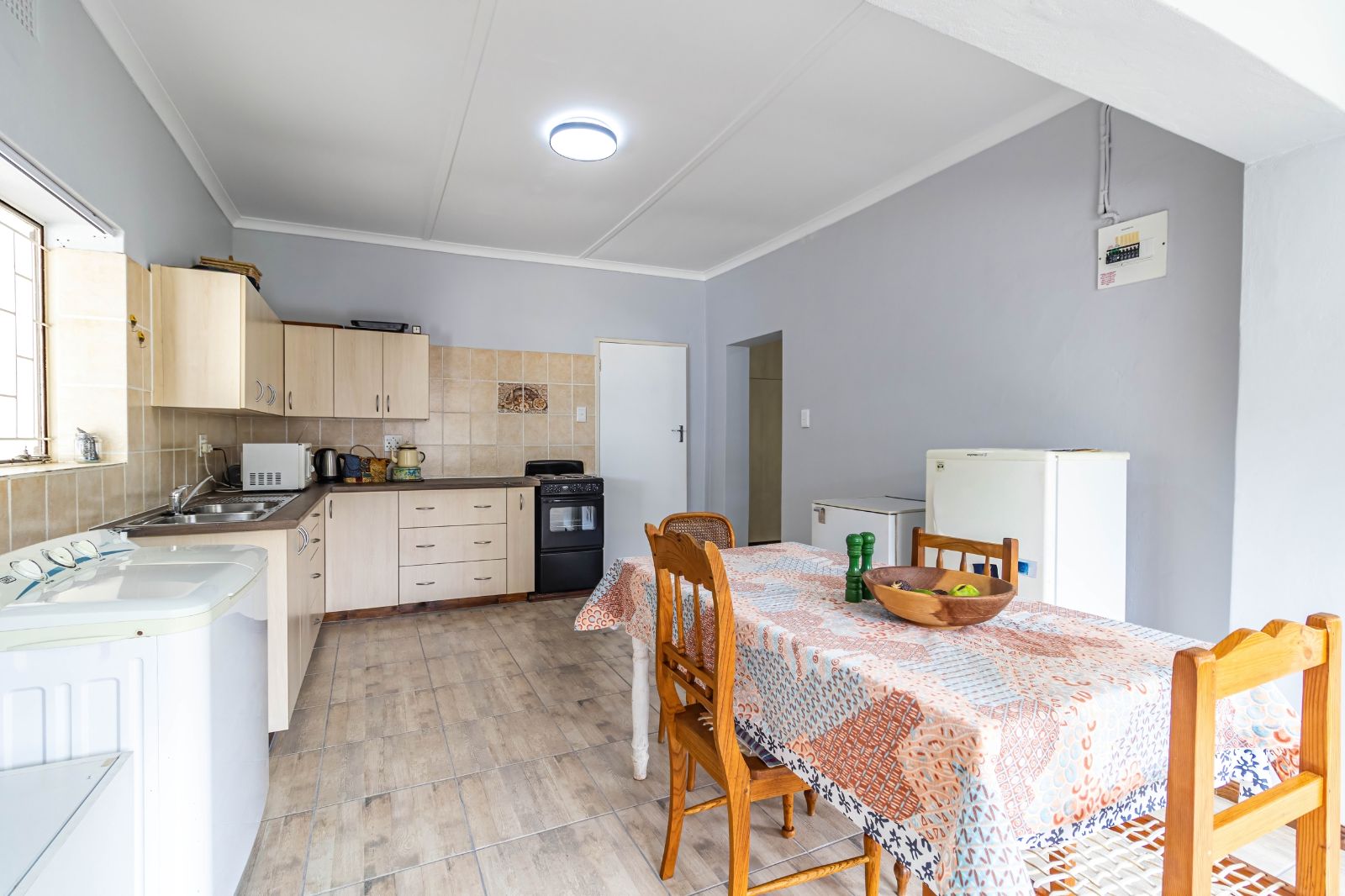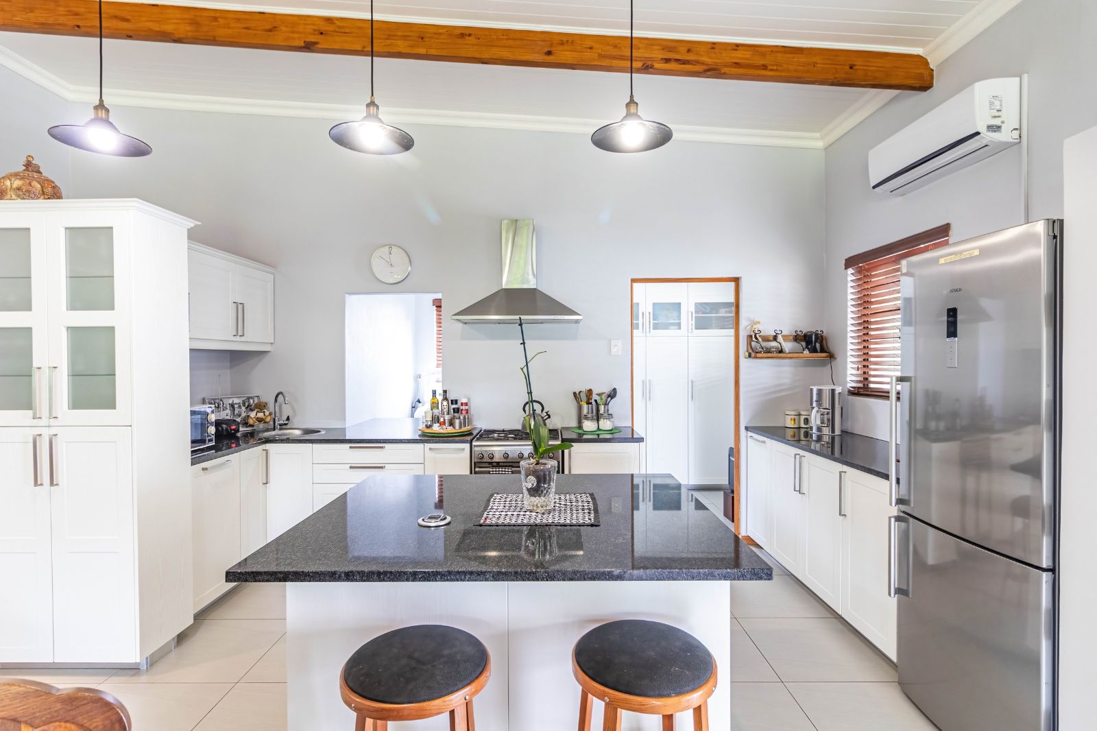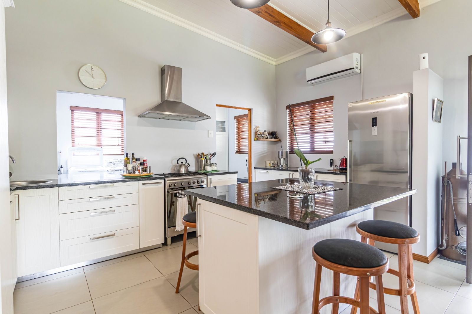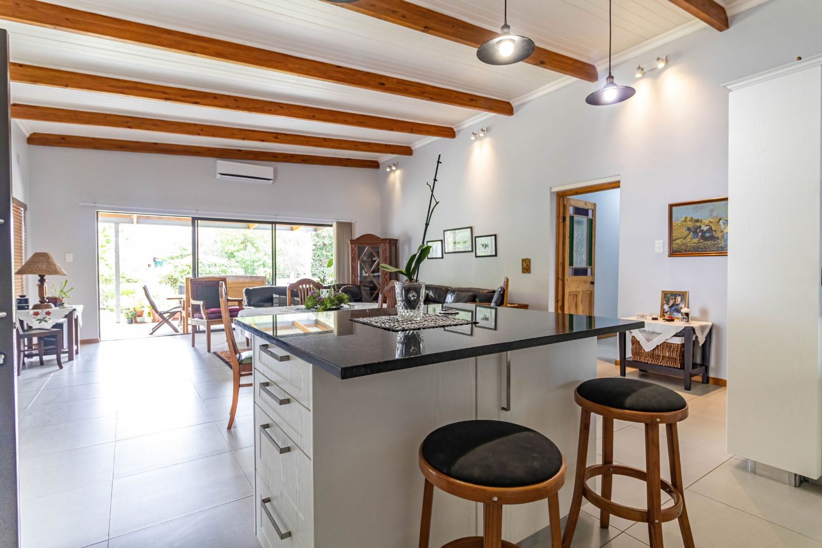The main residence features four generously sized bedrooms, all designed with comfort in mind, and three bathrooms, including a well-appointed main en-suite. The home flows beautifully with a modern and spacious open-plan kitchen, lounge, and dining area, creating a warm and inviting central living space ideal for family life and entertaining. Two air conditioners ensure year-round comfort, while the separate scullery keeps the kitchen practical and clutter-free.