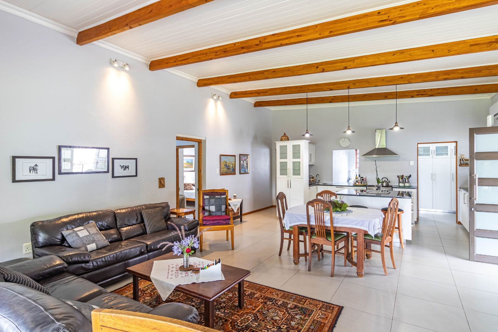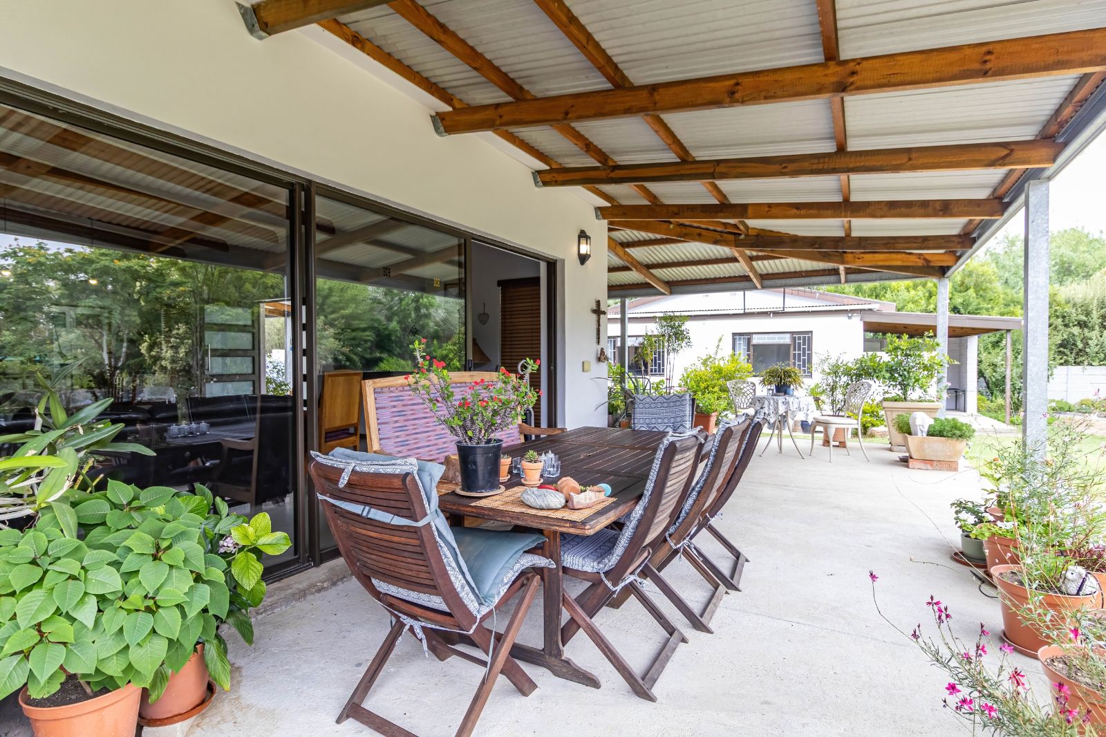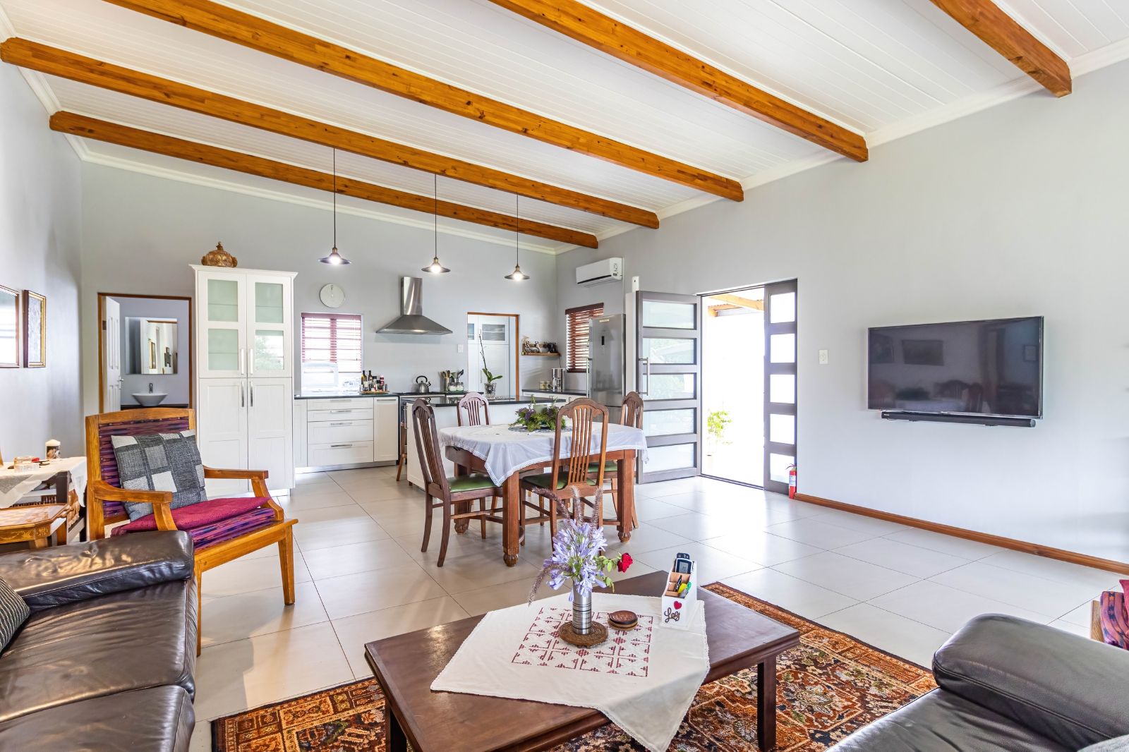 The lounge opens seamlessly onto a spectacular 76 m2 L-shaped patio (stoep) — a standout feature of the home. This expansive outdoor area is perfect for relaxed meals, morning coffee, or evening sundowners while taking in the panoramic views of the Olifants Mountains. It’s a space that truly captures the essence of Porterville living.