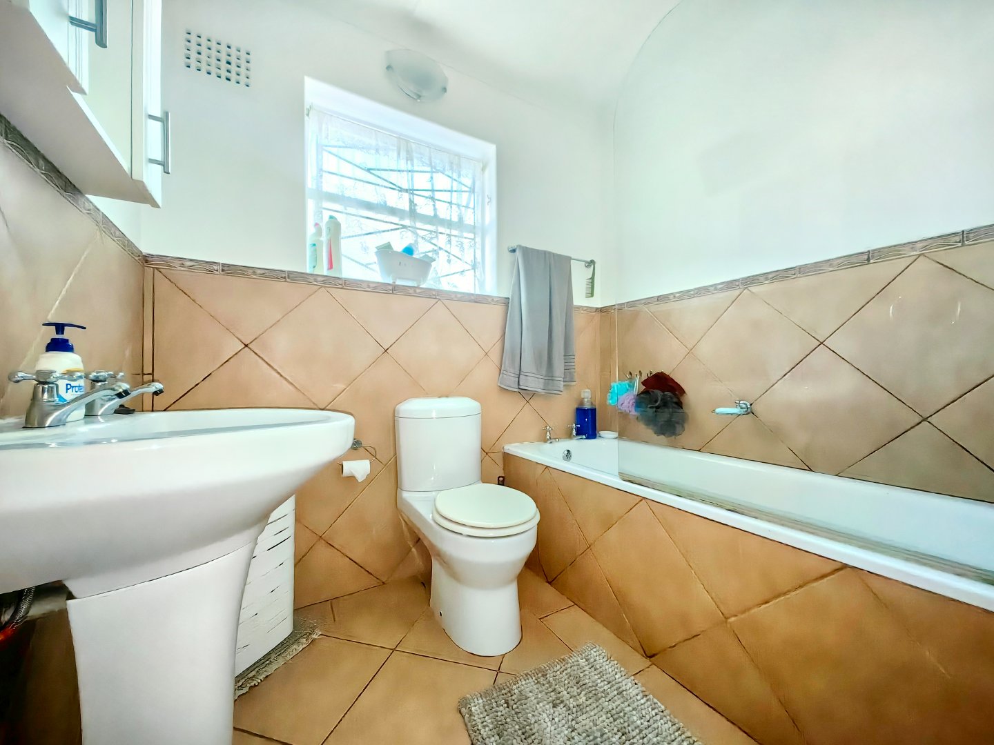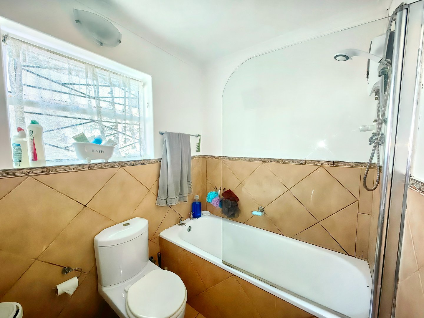 - Tiled bathroom with shower over bath and instant water heater