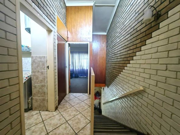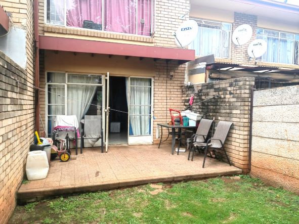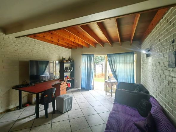 This unit offers 2 bedrooms with built-in cupboards and 1 bathroom upstairs. Downstairs is an open plan kitchen, living and dining area that leads out to the small garden, and 1 covered parking.