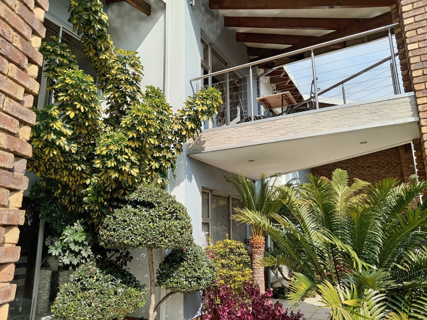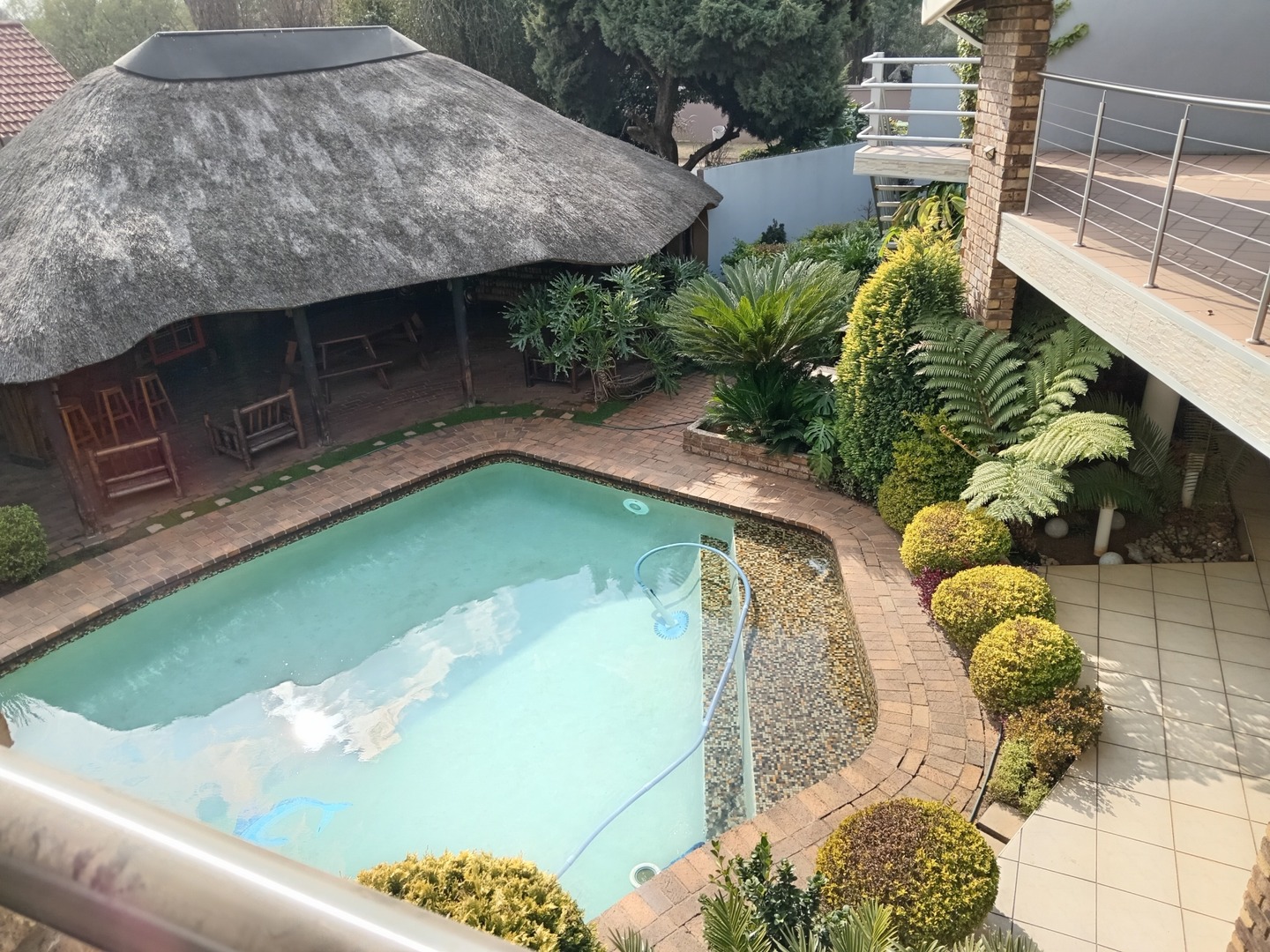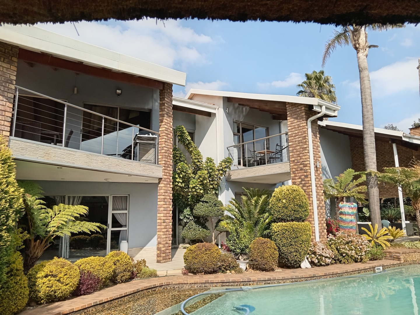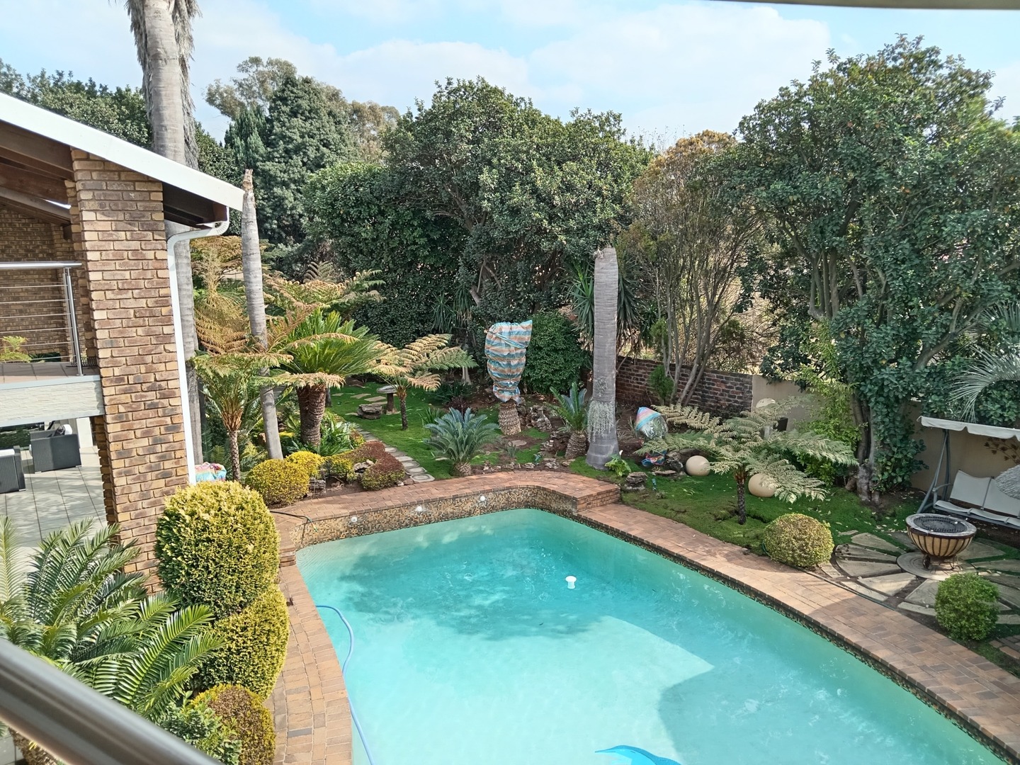 Nestled behind a charming facade of warm face brick and tasteful paintwork, this exquisite home exudes an air of timeless elegance. Stepping through the front door, you're greeted by a spacious living area adorned with plush furnishings and adorned with tasteful artworks, creating an inviting atmoshere for both relaxation and entertainment. The kitchen is equipped with state-of-the-art appliances and sleek countertops, perfect for culinary enthusiasts and casual family meals. Outside, the landscape unfolds into a sanctuary of peace and beauty. A meticulously landscaped garden, resplendent with vibrant blooms and shaded by mature trees, wraps around a sparkling blue pool.