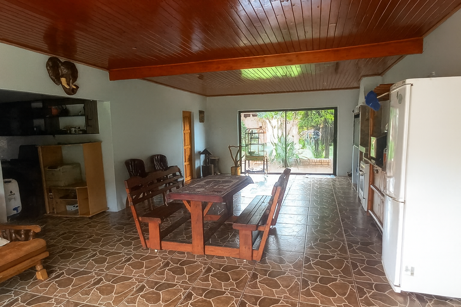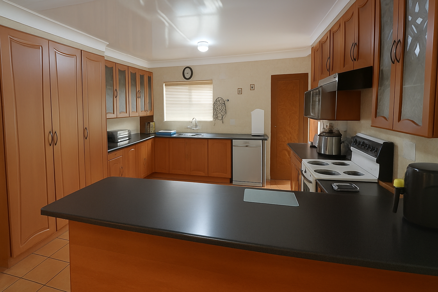 From here you enter the main part of the house - the kitchen is very spacious with ample, very neat storage units, laminate counter tops and separate stove! The kitchen is open plan with the dining room and lounge area. The lounge has sliding doors that open up to the expansive garden.
