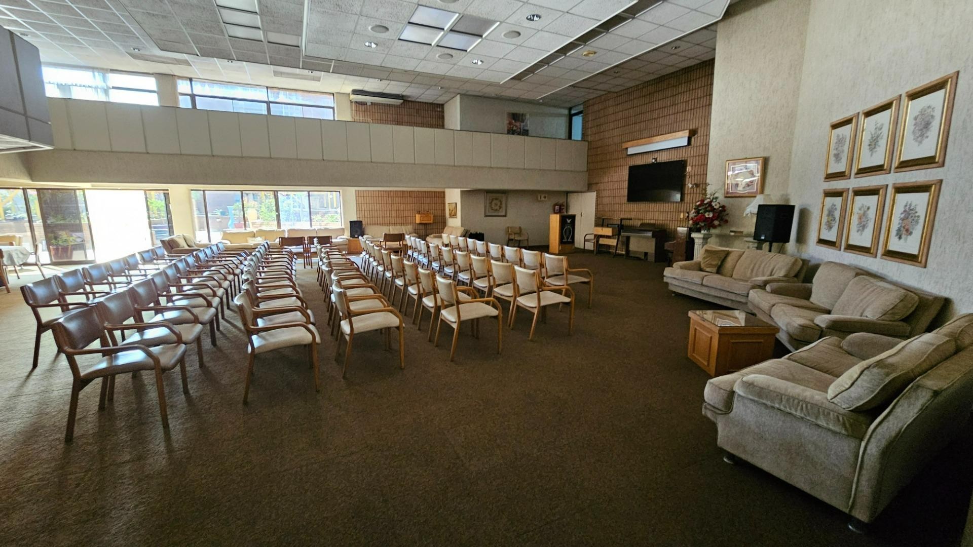 Community activities including church services, Bible study, Rumi Cub, weekly tea & coffee gatherings, and bingo
