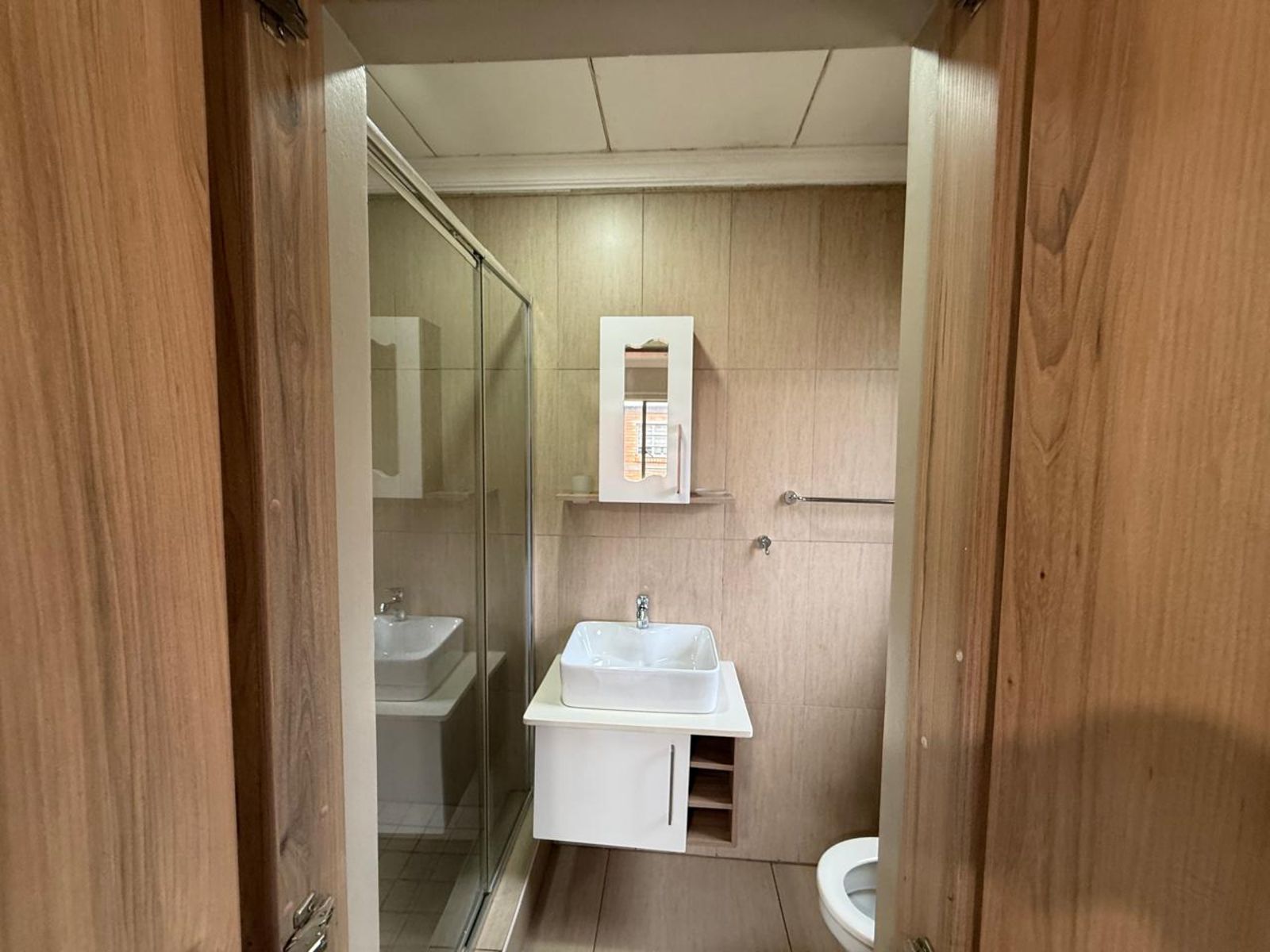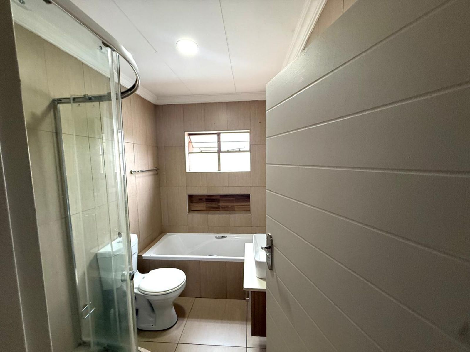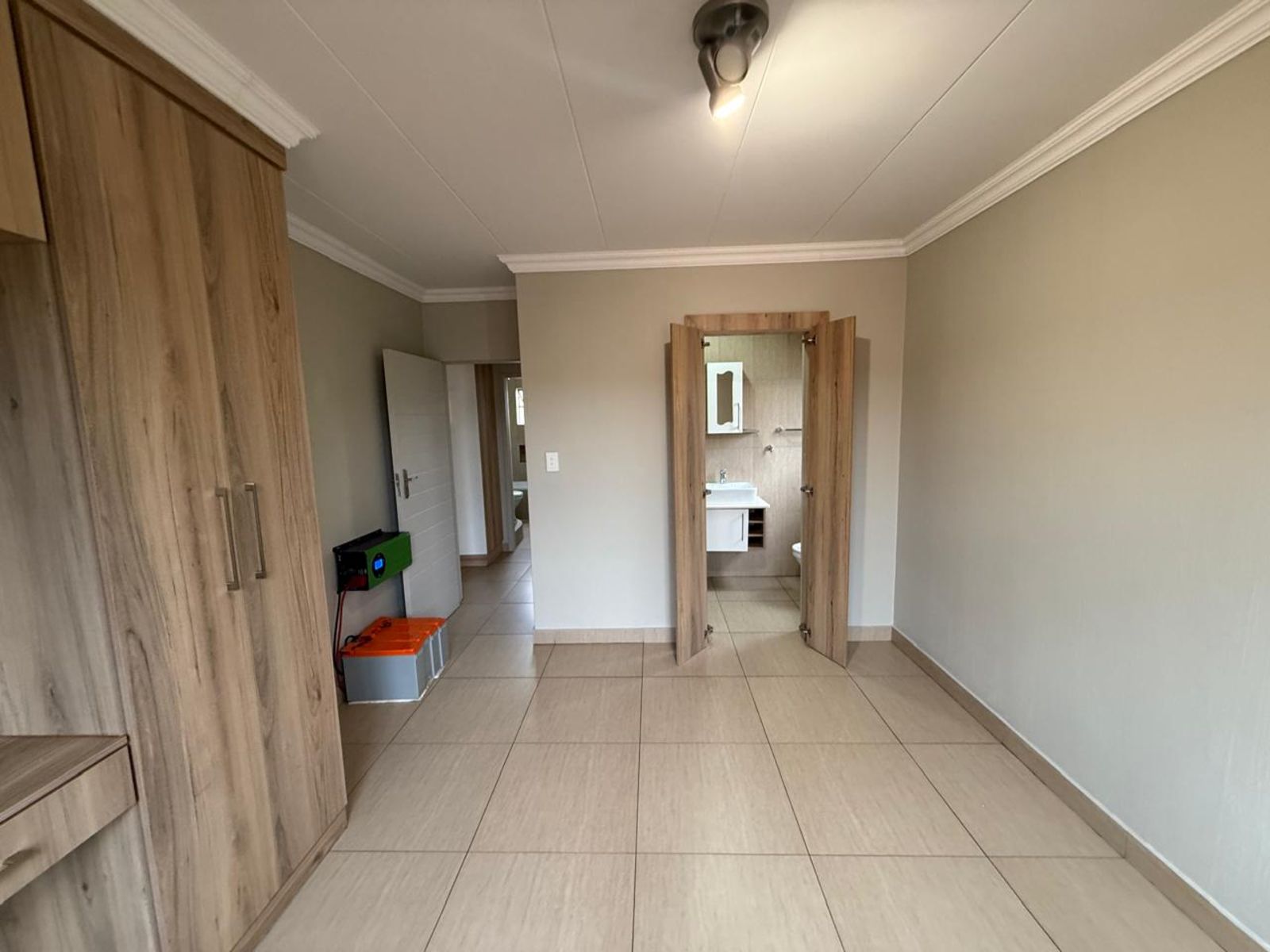 The house has a pantry and the first bathroom is a full bathroom with a shower and bathtub. The second room is a full room with cupboard space. The 3rd room is the main bedroom with an en-suite.
