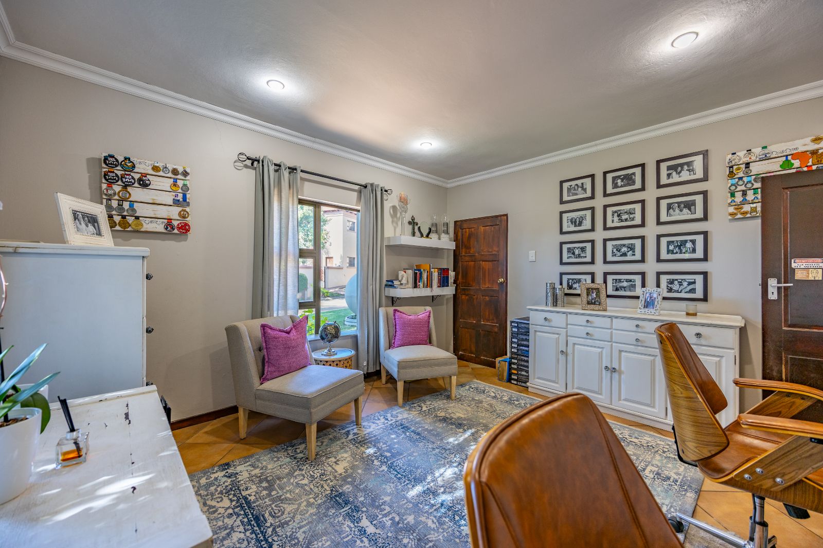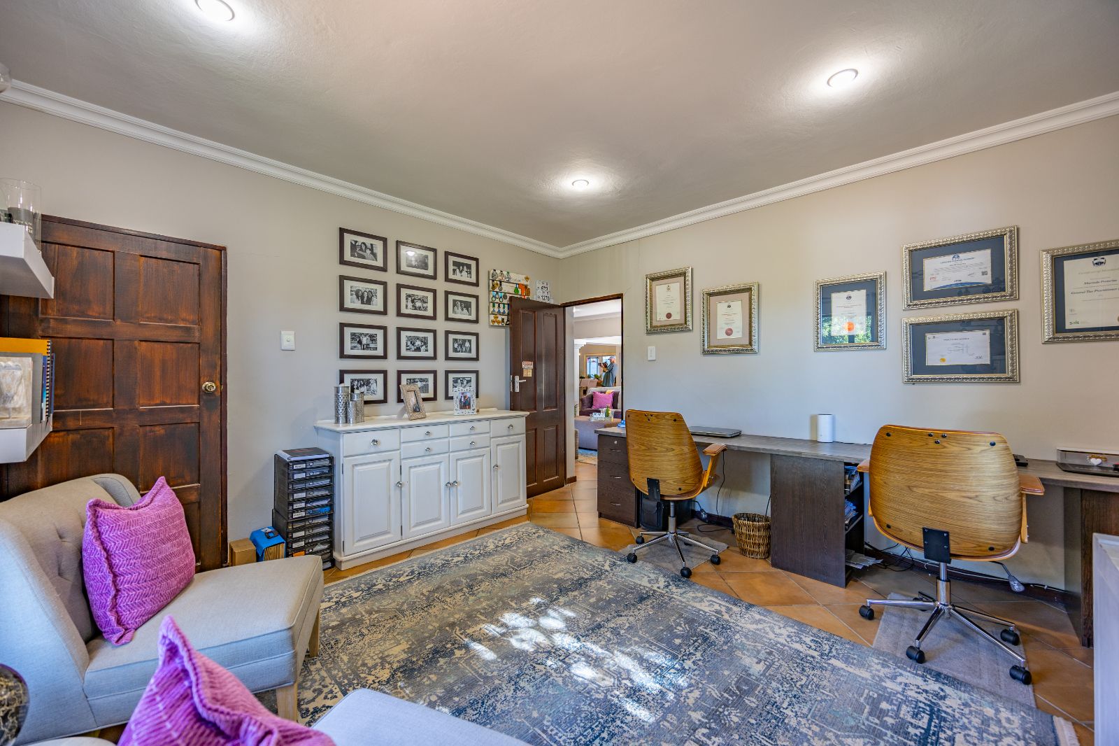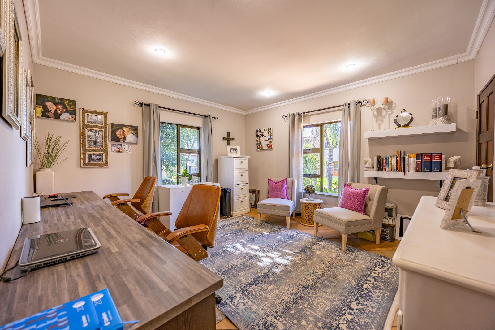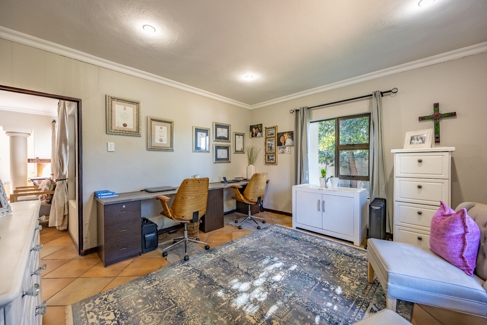 The layout of the living areas is open-plan, yet well-defined with subtle structural elements like pillars and careful room placement. Natural light floods the home, giving every room a bright, airy feel. The family Room leads into a large, fully equipped office with built-in desks and its own private entrance — perfect for those who want to run a business from home without giving clients access to the rest of the house.