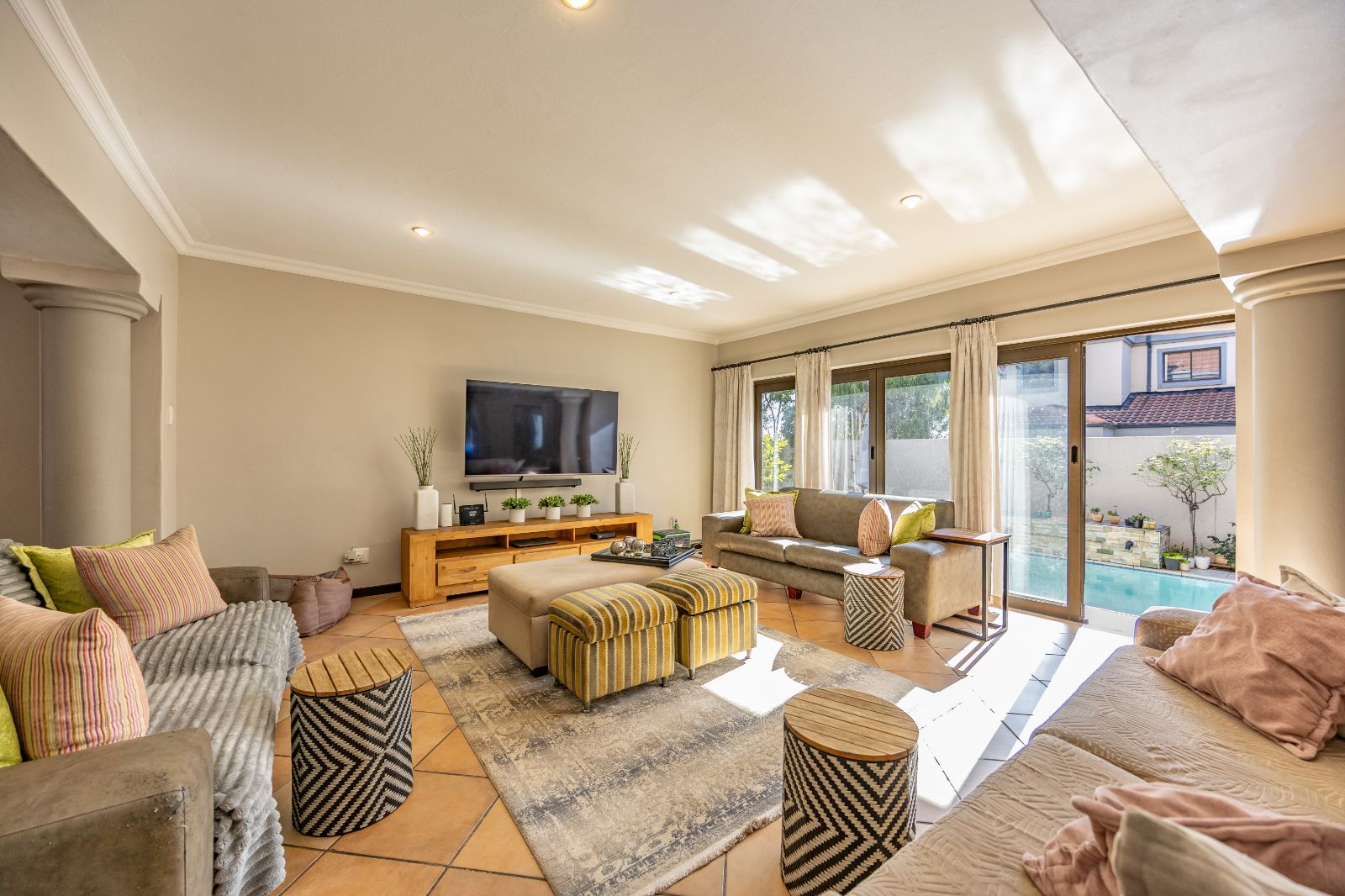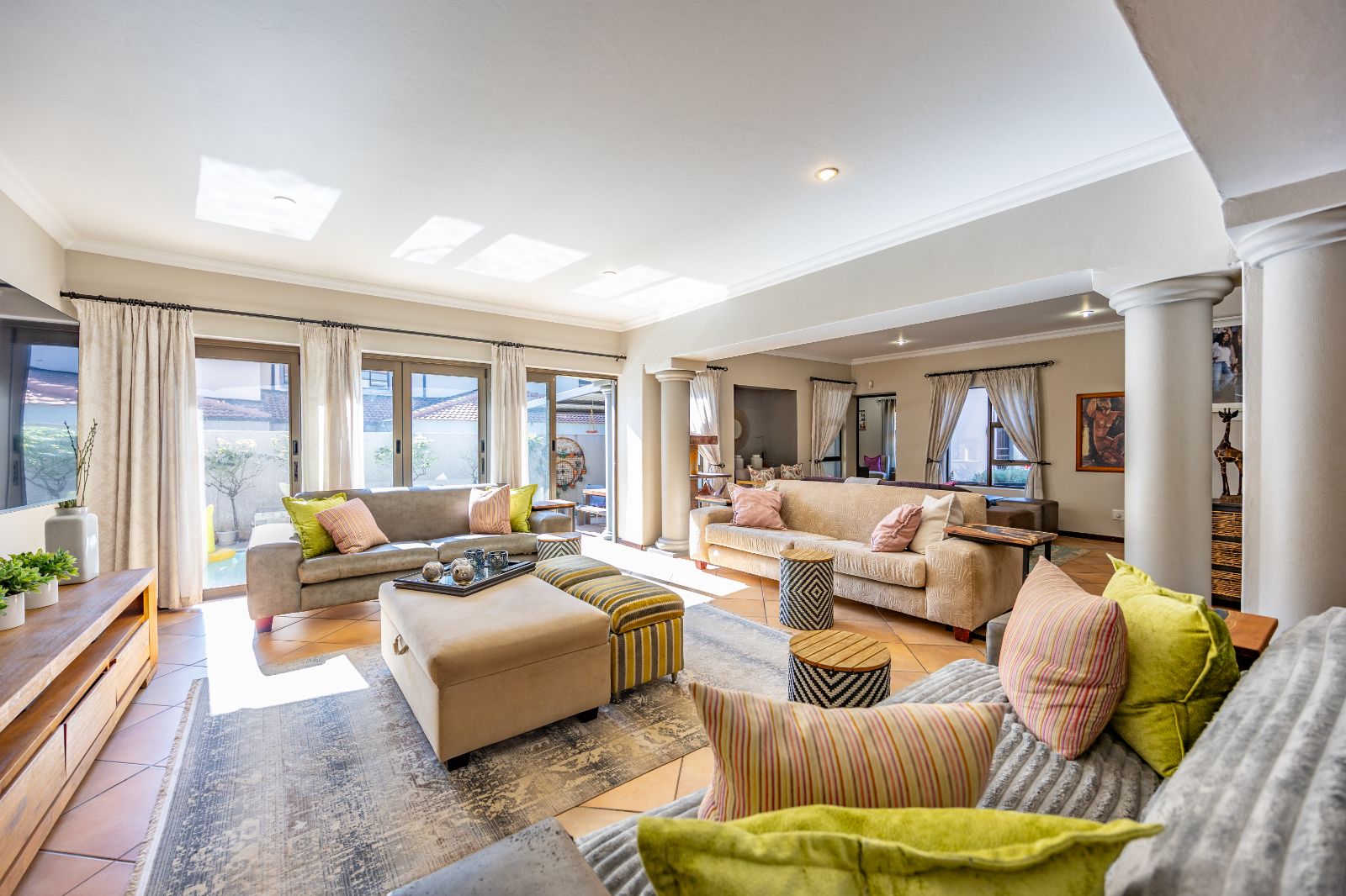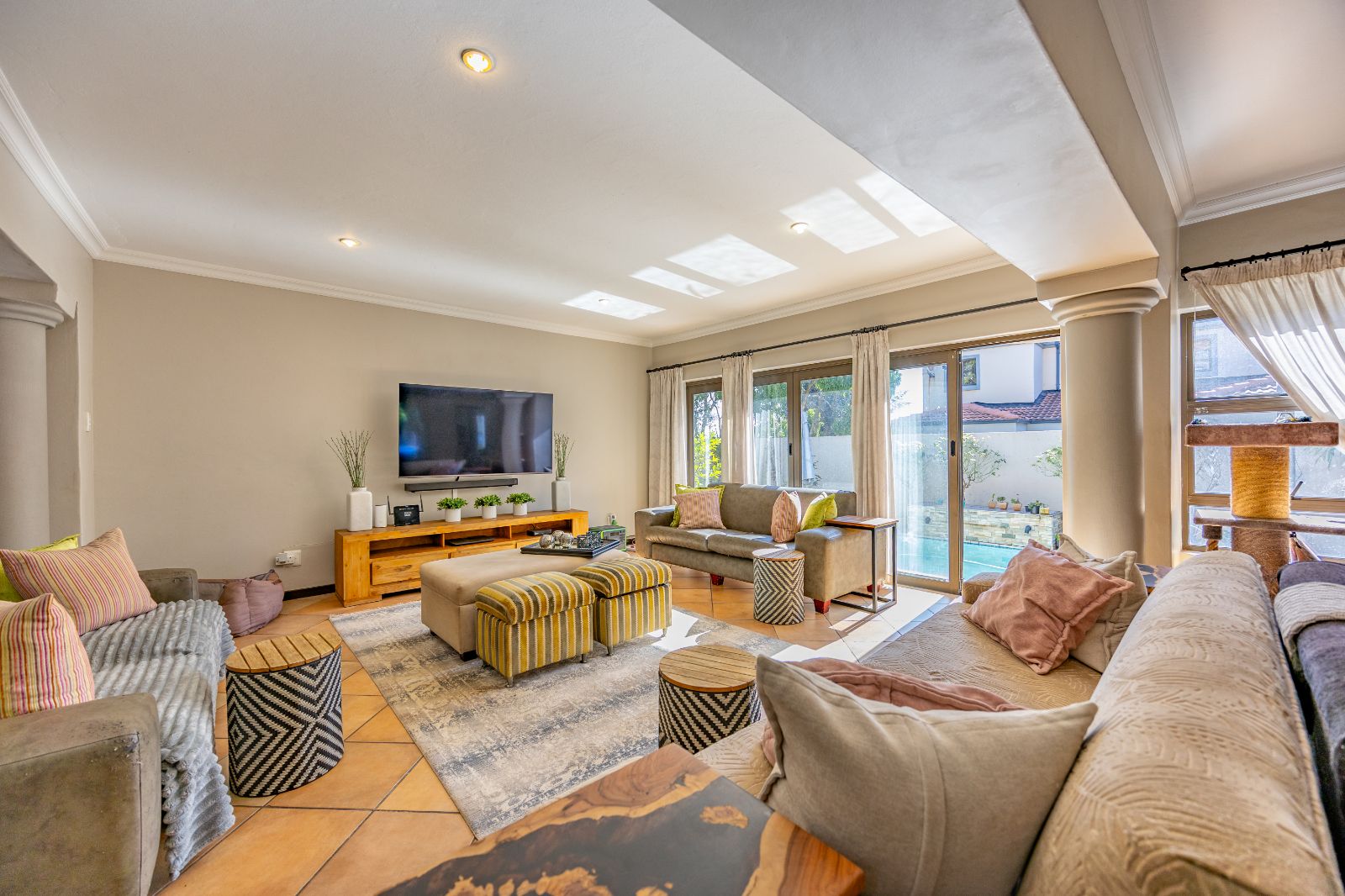 The second lounge flows naturally from the dining area and opens through sliding doors to the outdoor entertainment space.