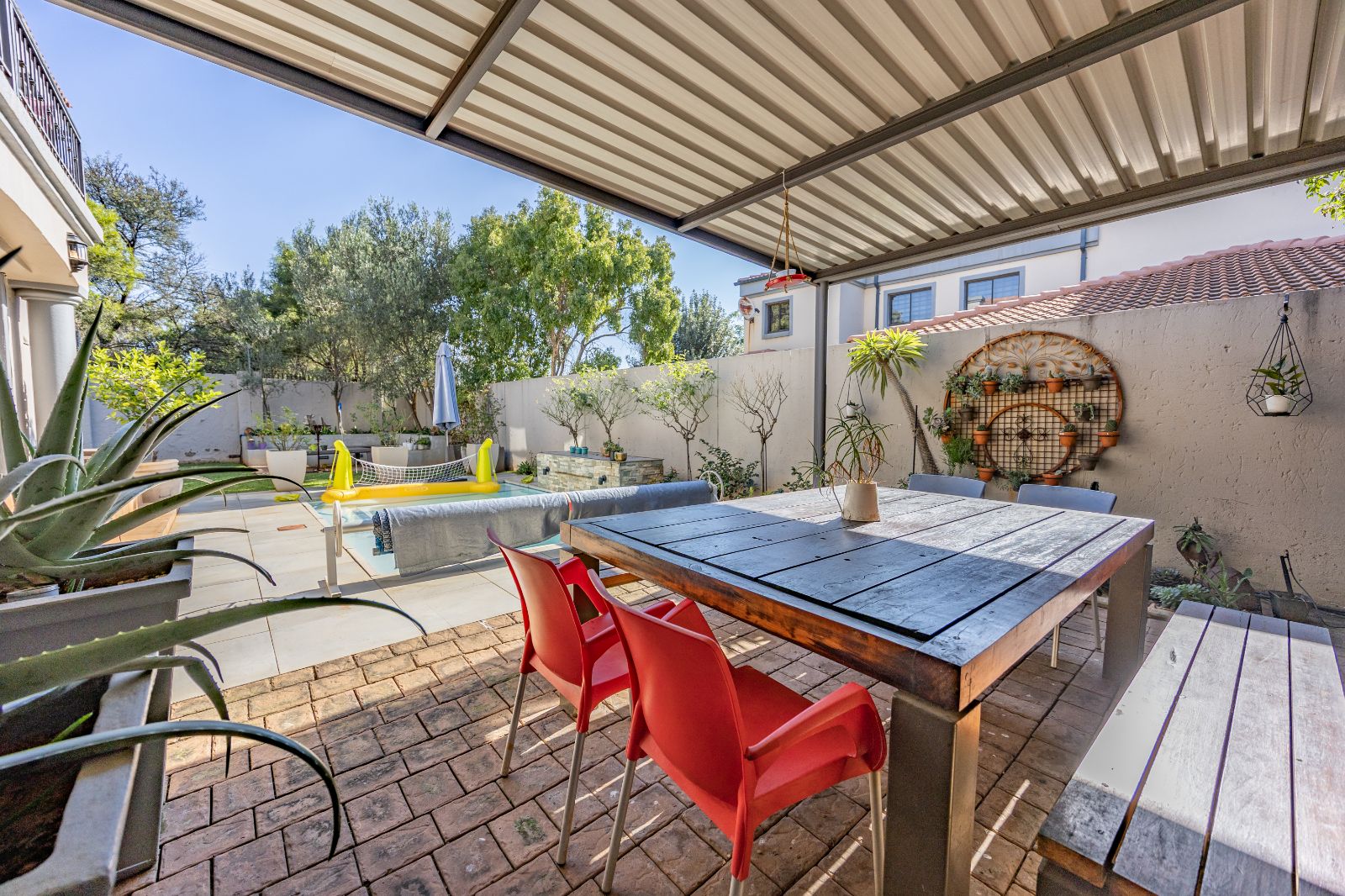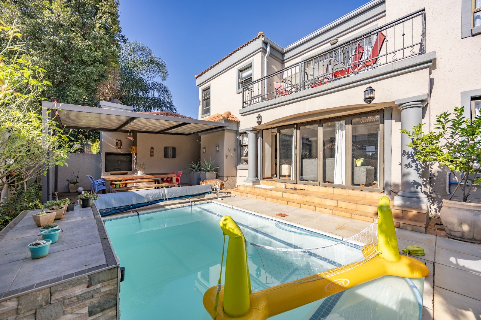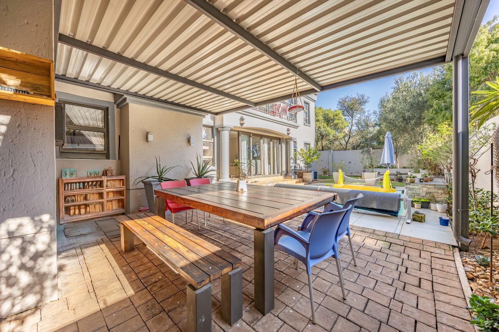 A covered patio with a built-in braai overlooks a sparkling medium-sized pool, while a cozy BOMA in the corner of the garden sets the scene for relaxed evenings with friends and family.