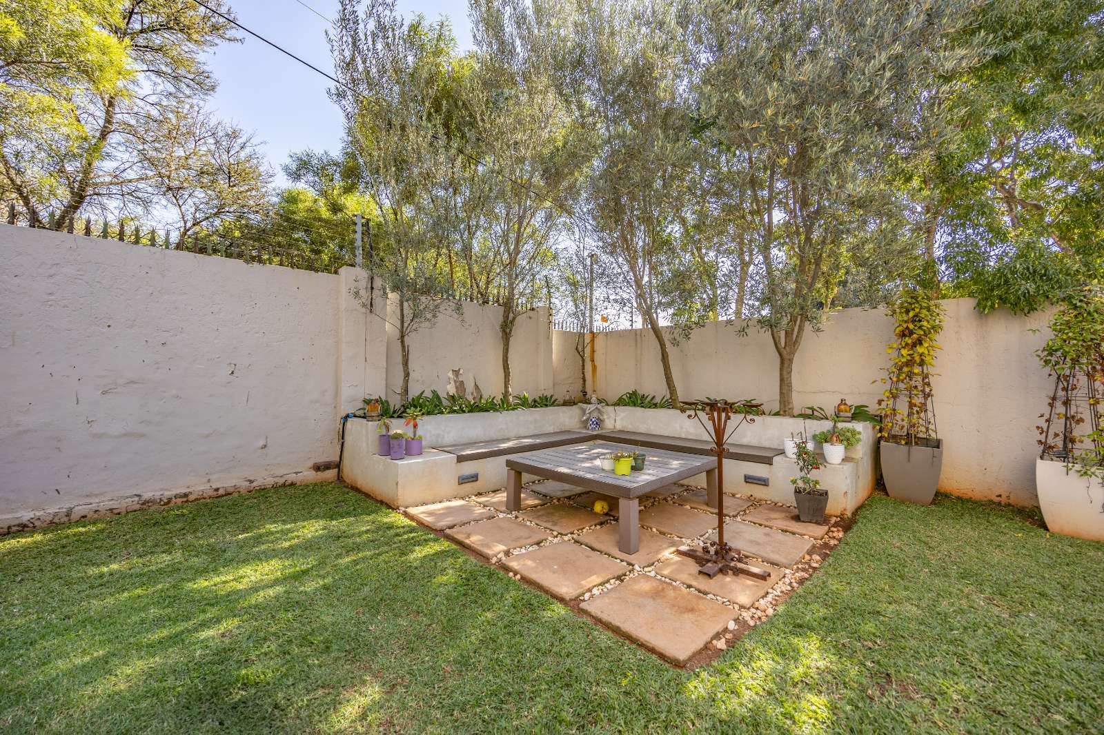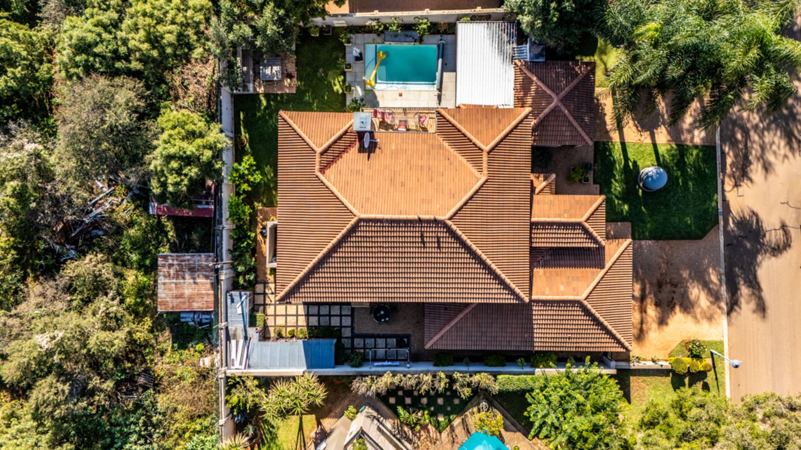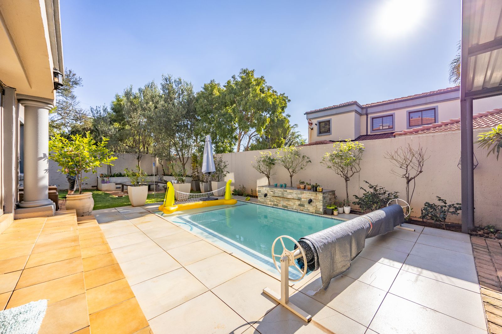 A covered patio with a built-in braai overlooks a sparkling medium-sized pool, while a cozy BOMA in the corner of the garden sets the scene for relaxed evenings with friends and family.