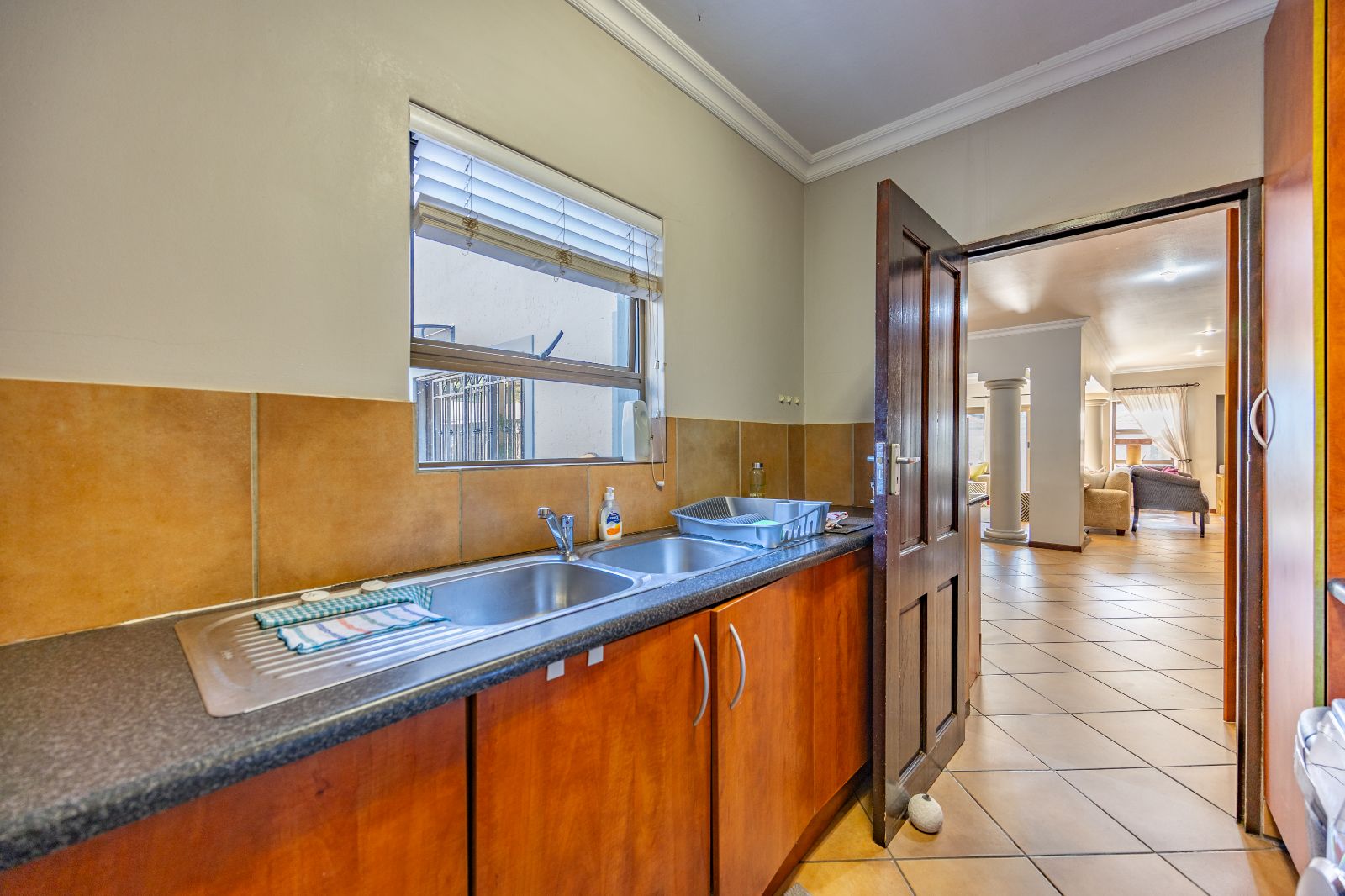 The kitchen is both practical and stylish, with granite countertops, a freestanding Bosch gas hob and electric oven, and a separate scullery/laundry area with space for three appliances. The kitchen overlooks the dining room, which opens out to the backyard where you'll find a courtyard and a spacious cattery — a rare feature for pet lovers.