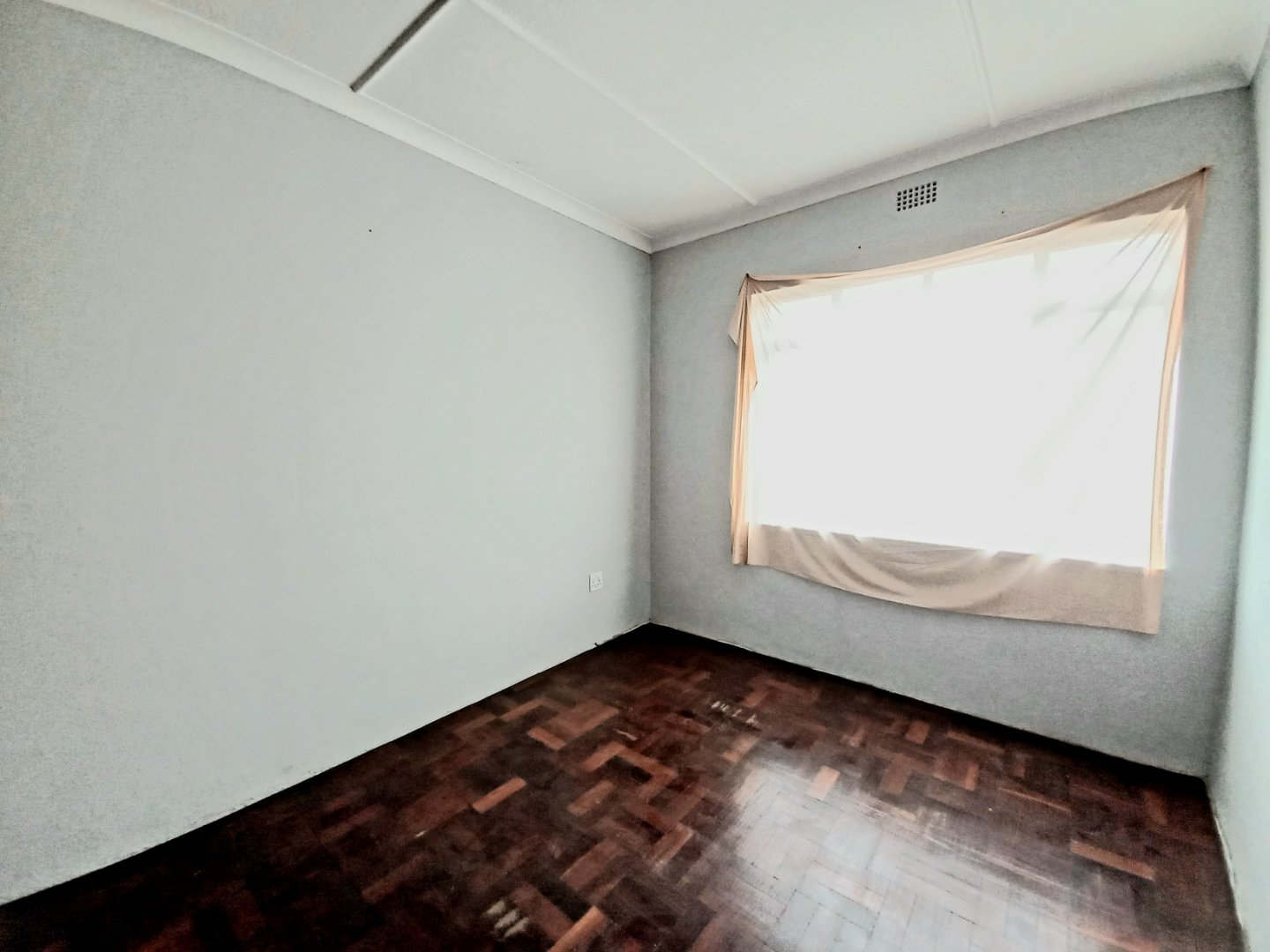 First bedroom with parquet floors and built-in cupboards