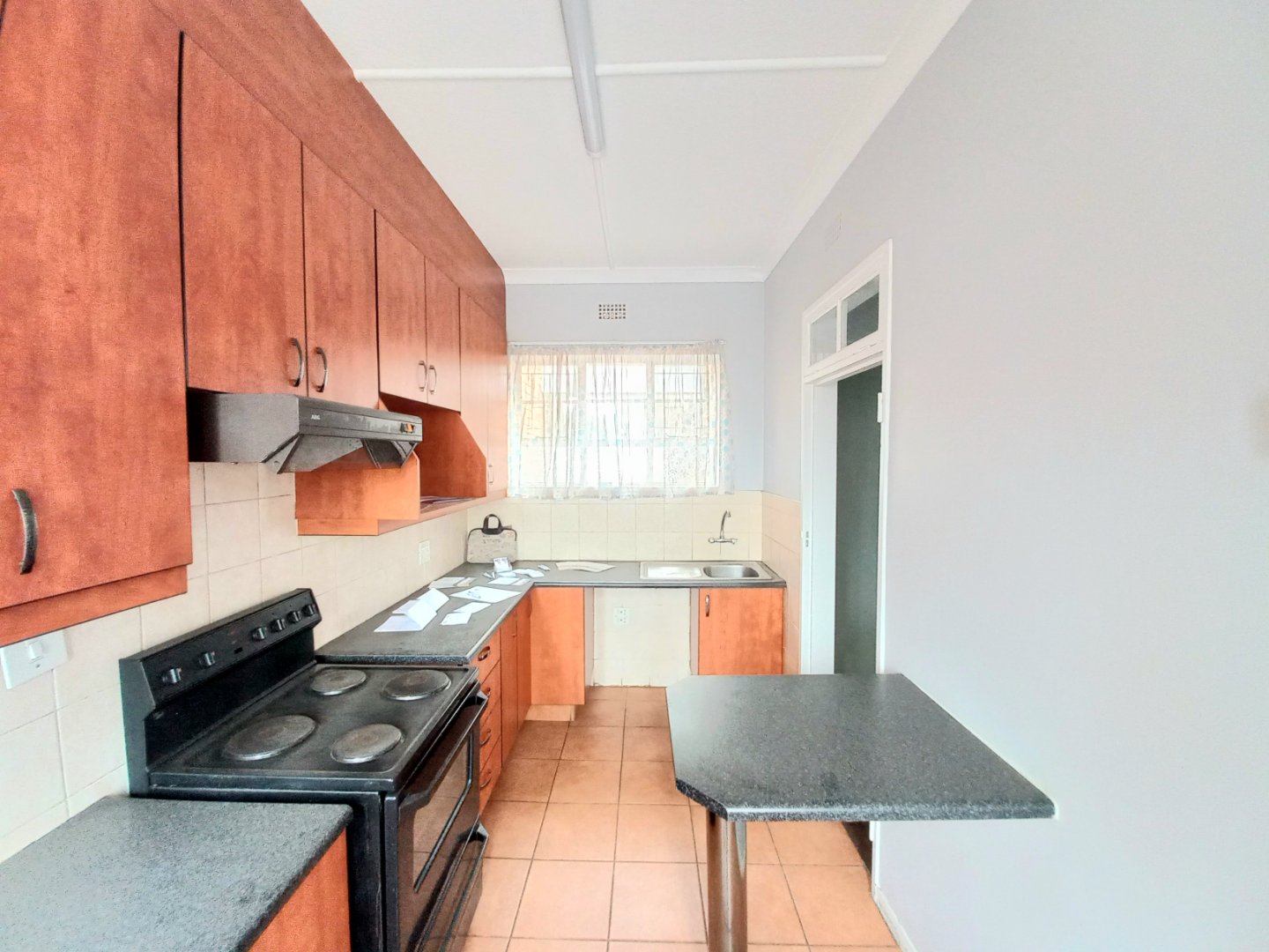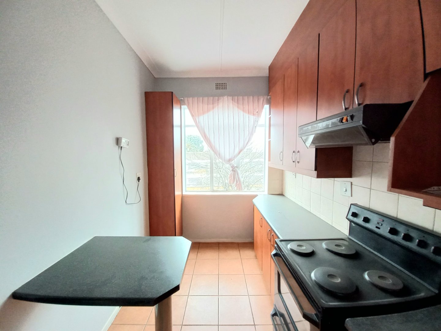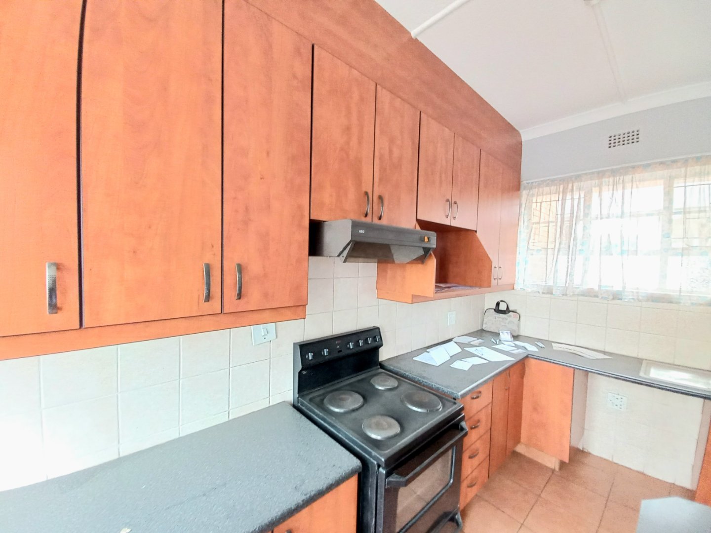 Tiled kitchen with breakfast nook, electric stove, extractor fan, and ample cupboards