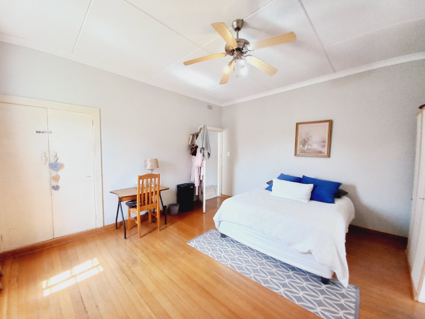 Main bedroom with wooden floors, ceiling fan, built-in cupboards, and modern en-suite bathroom (bath, shower, basin, toilet)