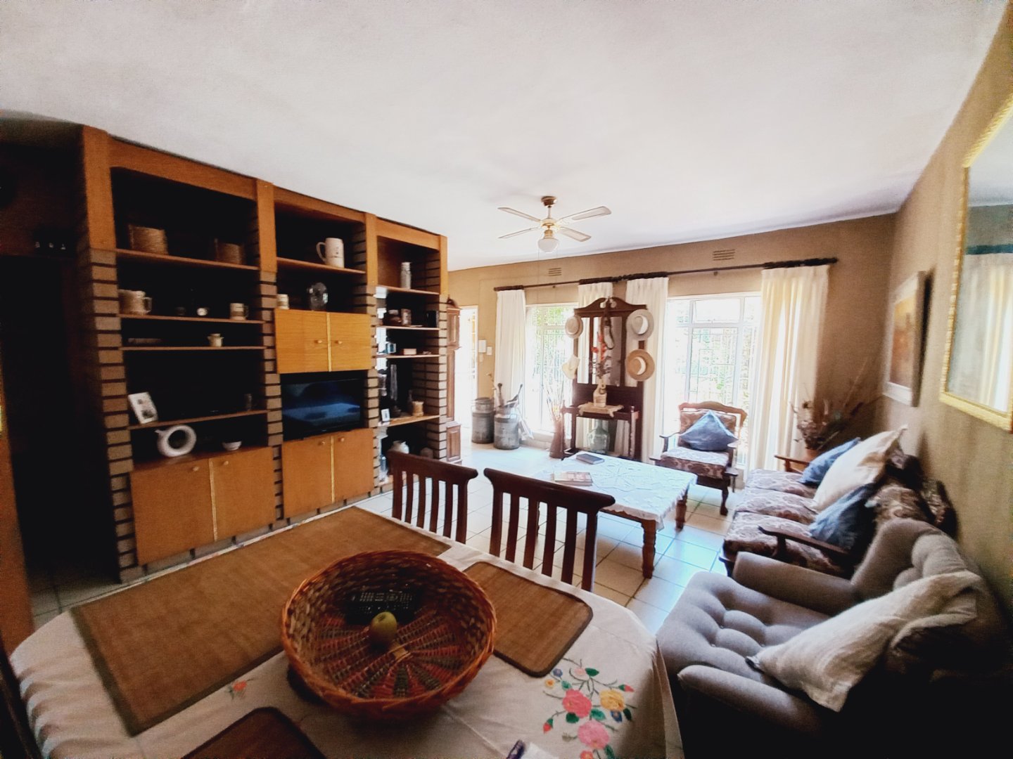 Open-plan tiled lounge and dining area with fitted wall unit, under-lighting, ceiling fan, and large windows for natural light