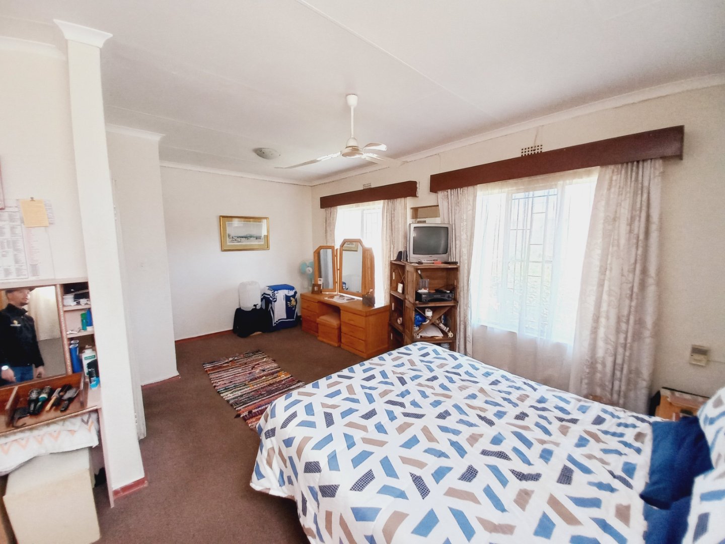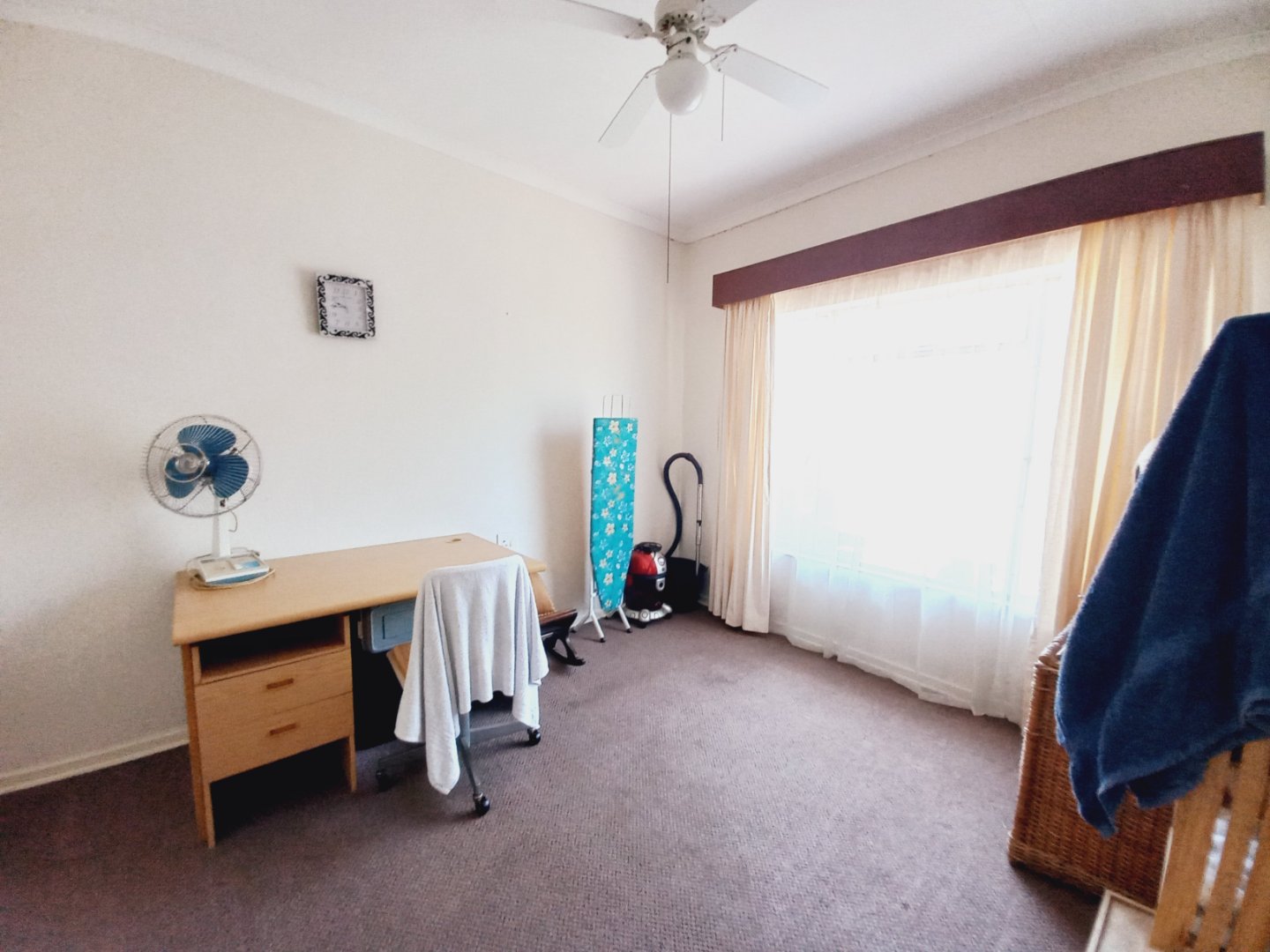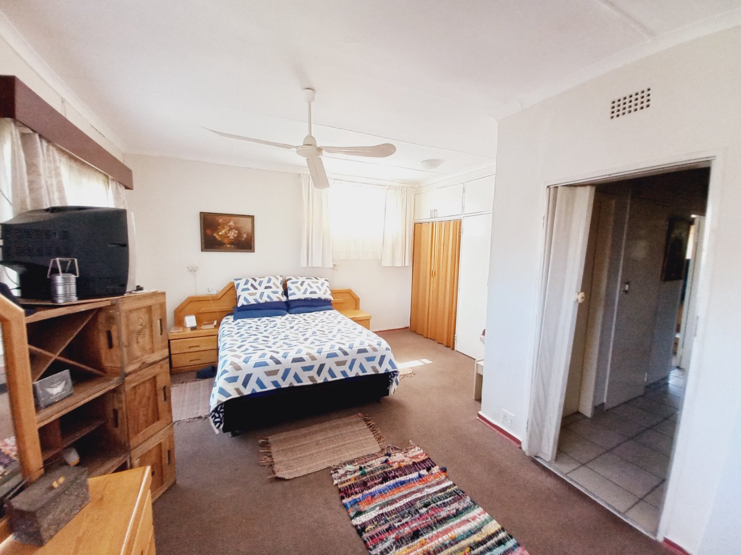 Upstairs features two spacious, carpeted bedrooms with ample built-in cupboards and ceiling fans