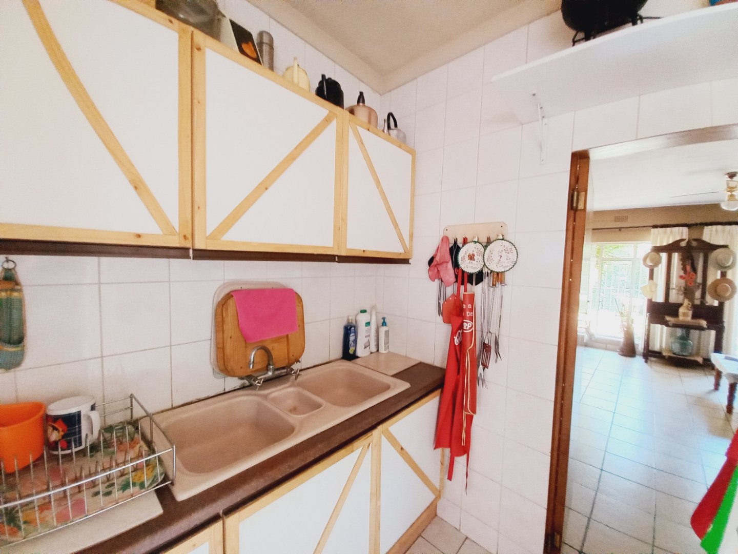 Neat tiled kitchen with wooden cupboards, melamine tops, gas stove, extractor fan, double sink, and plumbing for dishwasher and washing machine