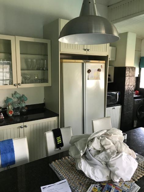 Well-Equipped Kitchen: Island, built-in cupboards, electric stove, eye-level oven, and space for a double-door fridge!