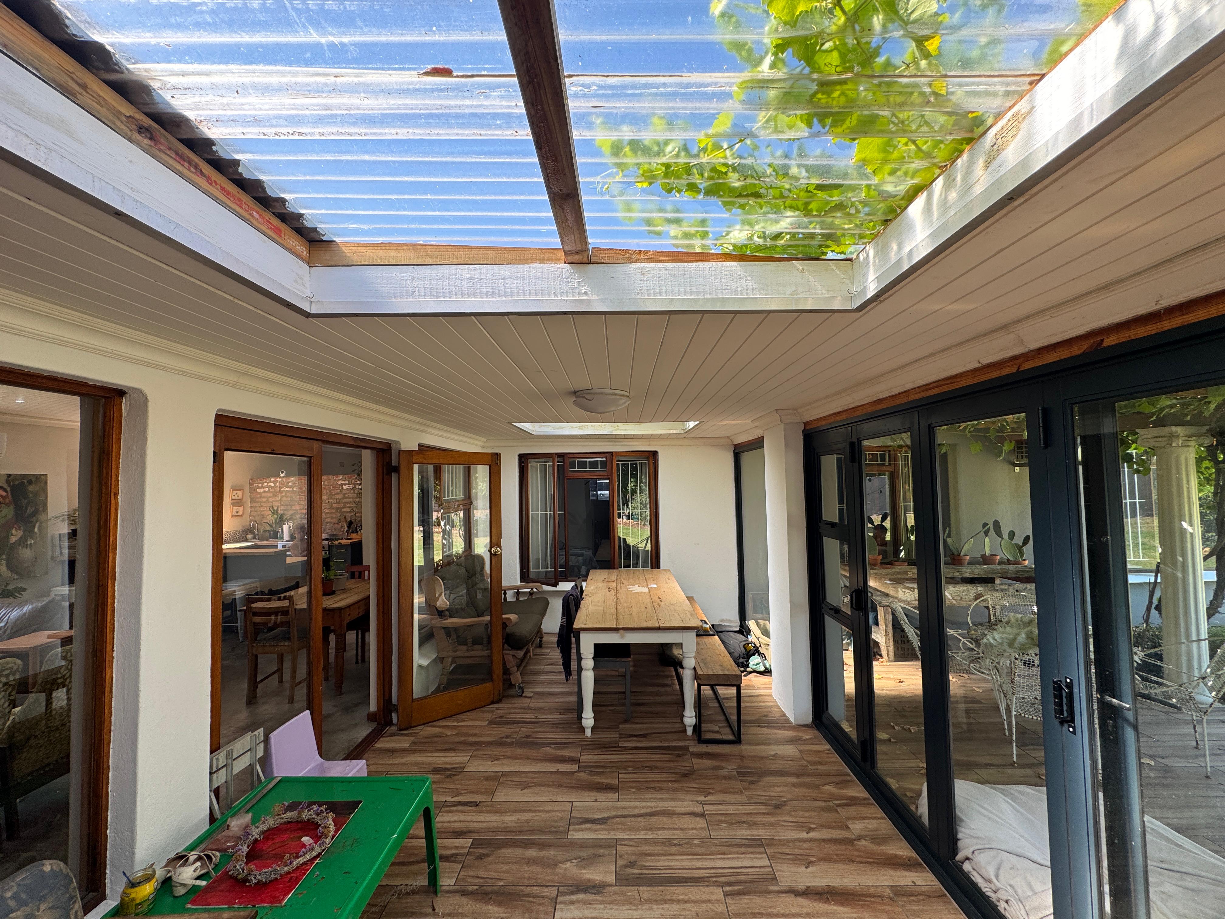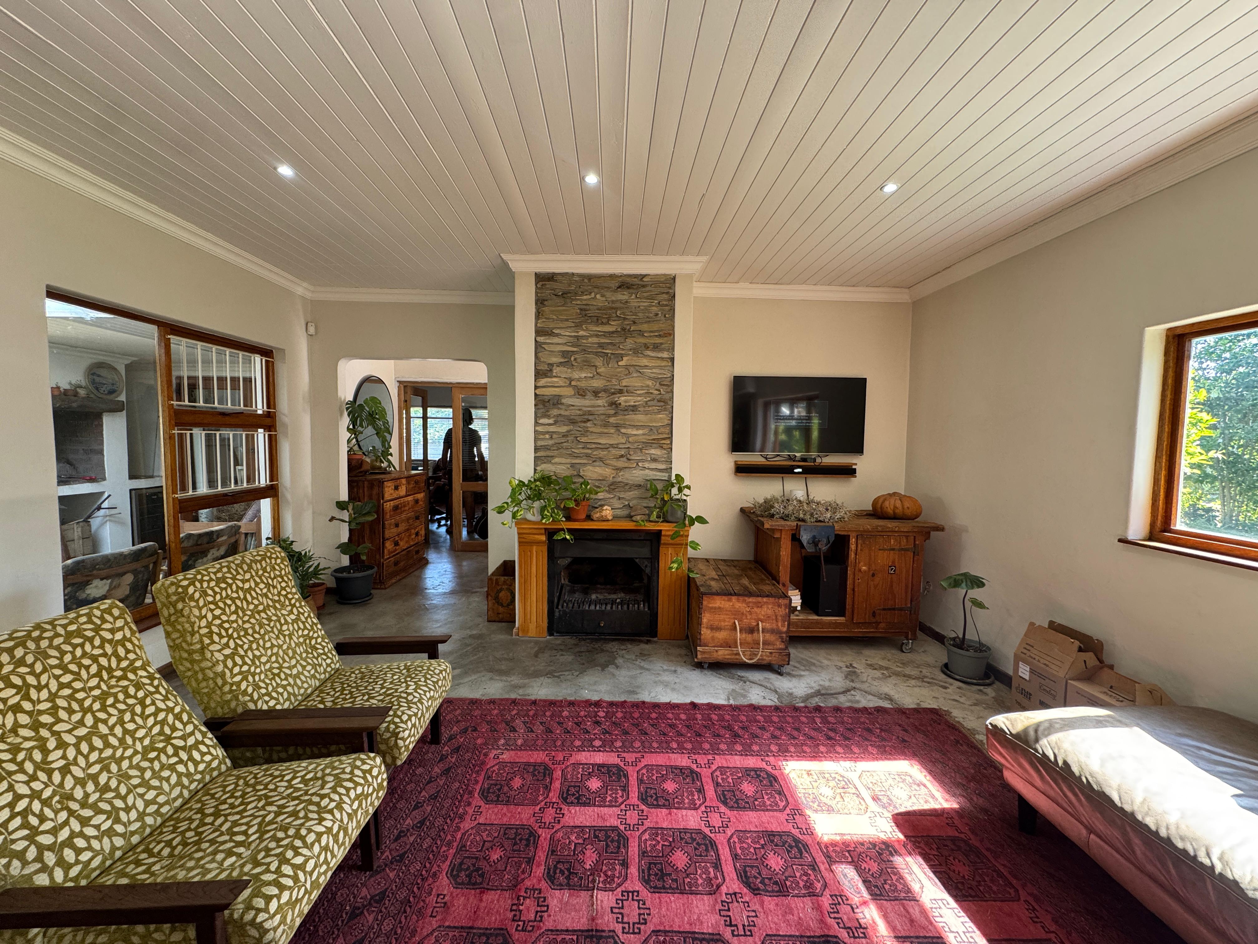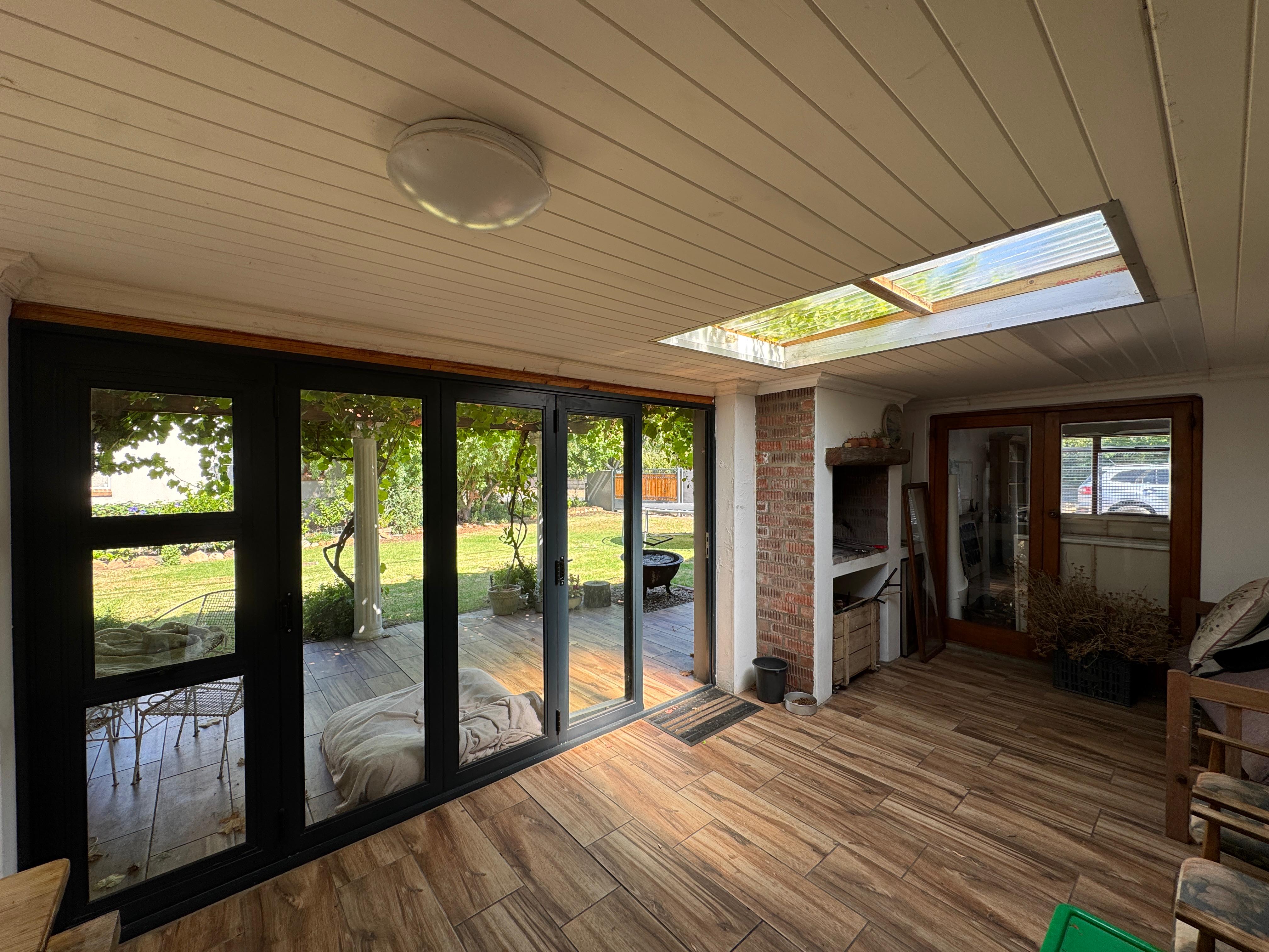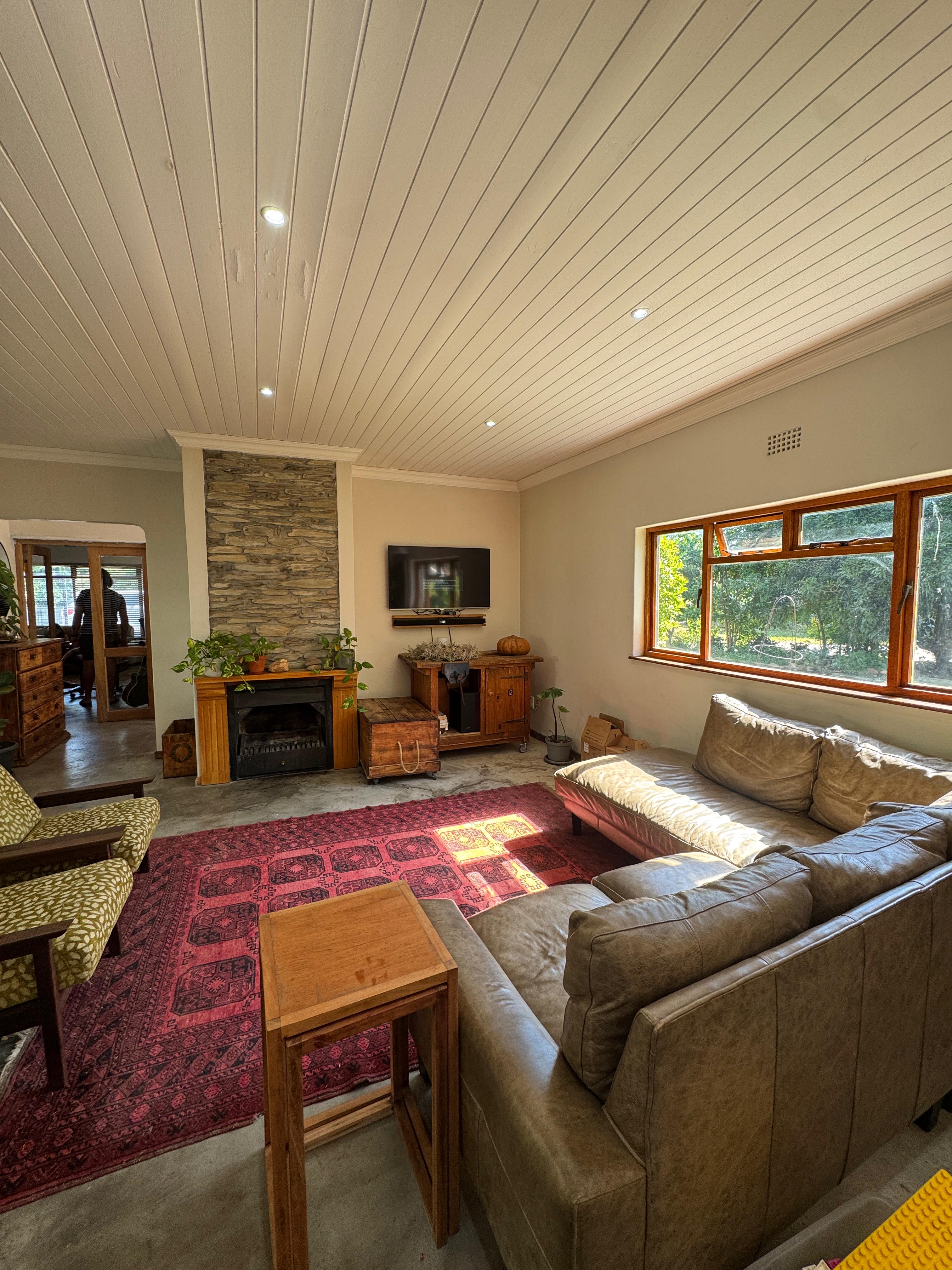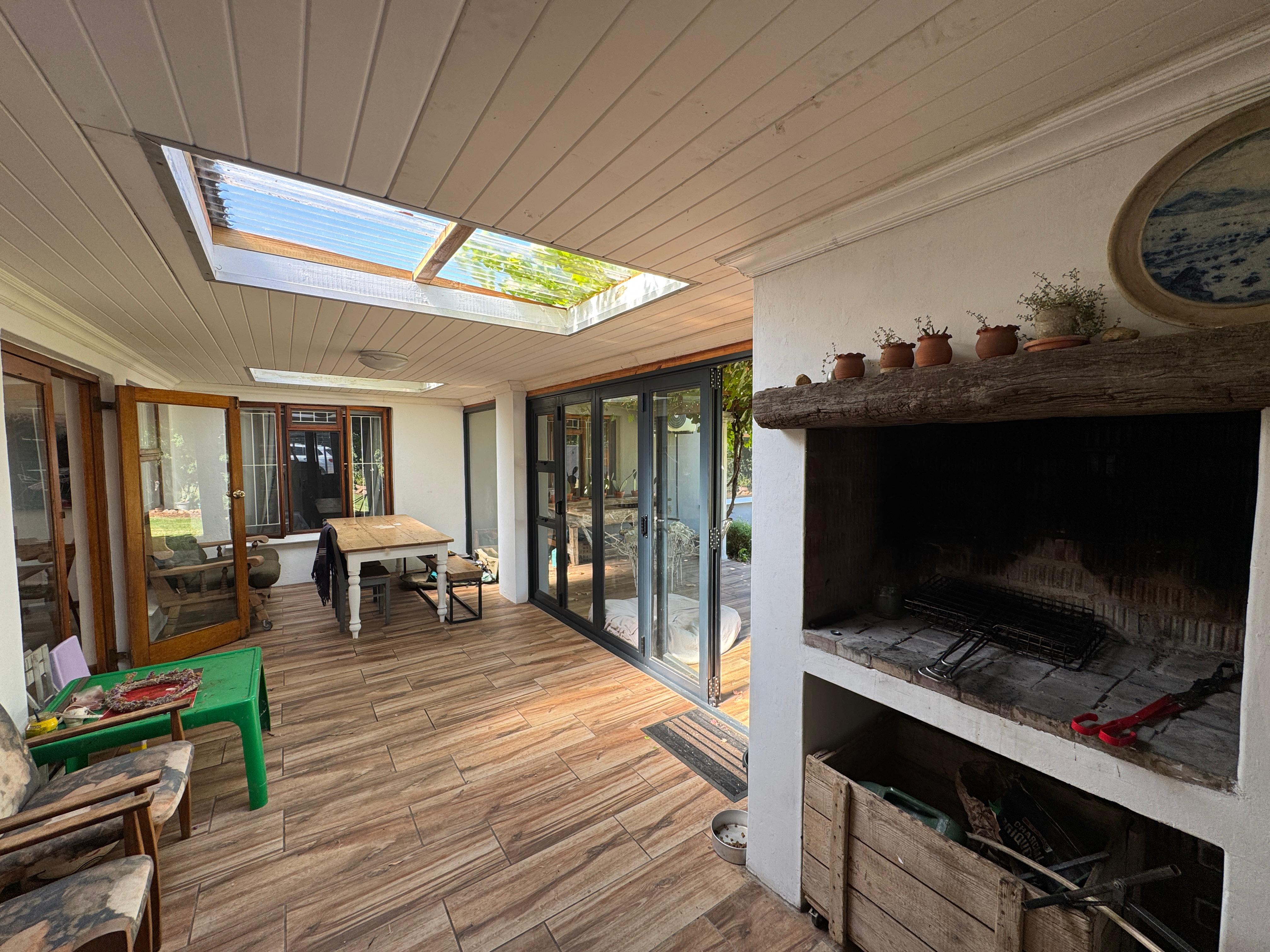 The main lounge is warm and welcoming, featuring a cosy fireplace for chilly winter evenings and air-conditioning for summer comfort. Wooden doors open onto a covered patio with a built-in braai and stacking doors, overlooking a private, established garden—perfect for long afternoons and memorable gatherings.