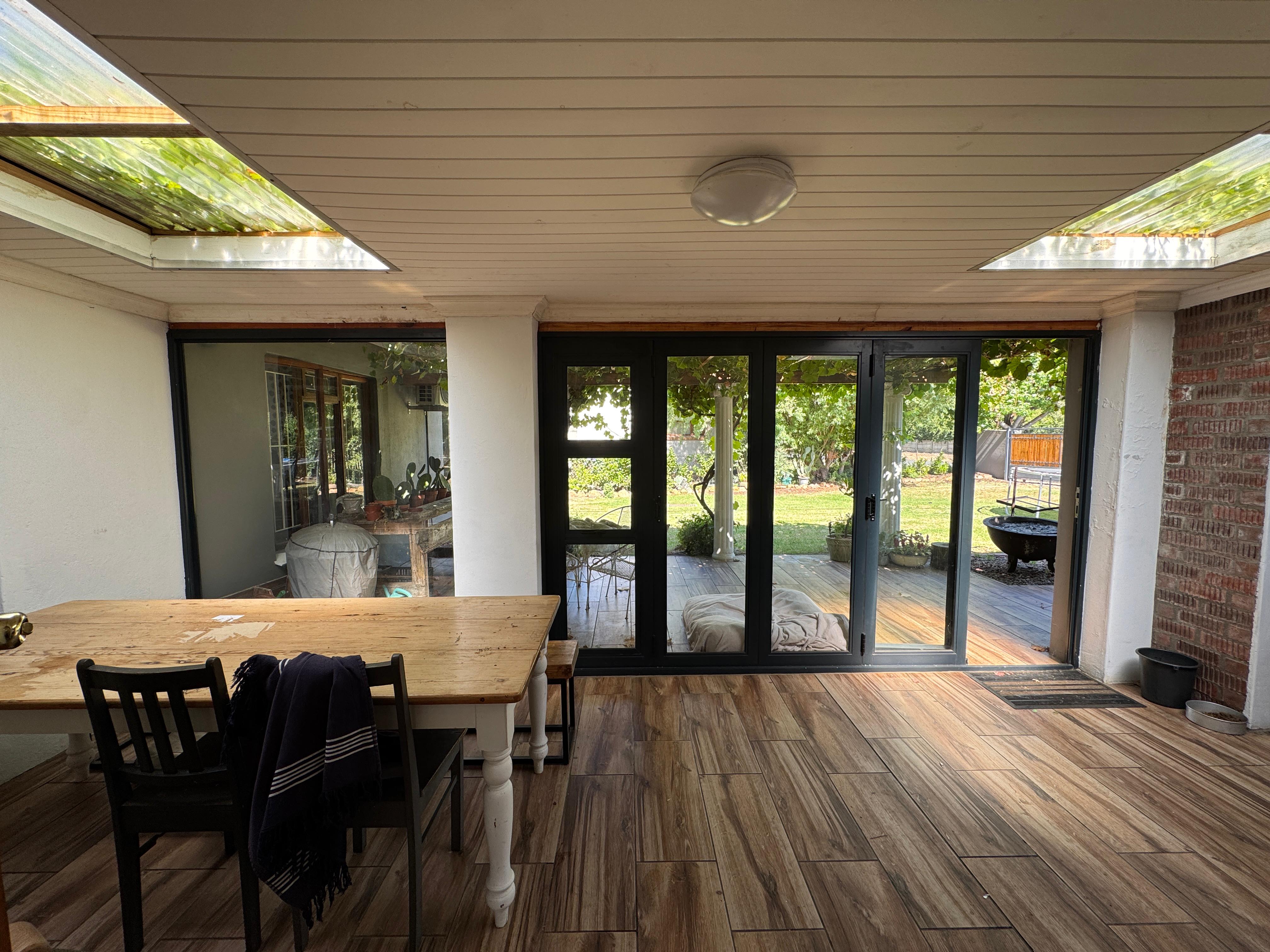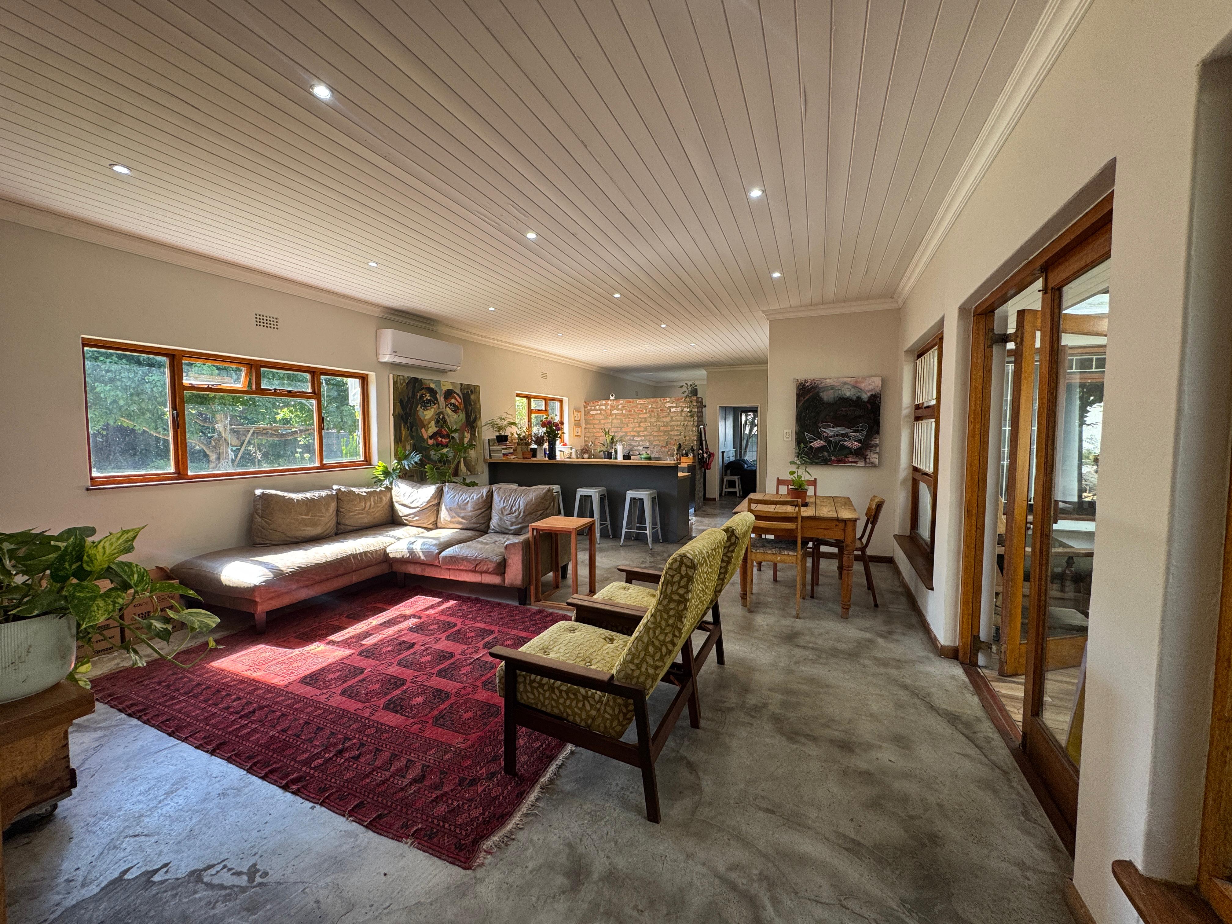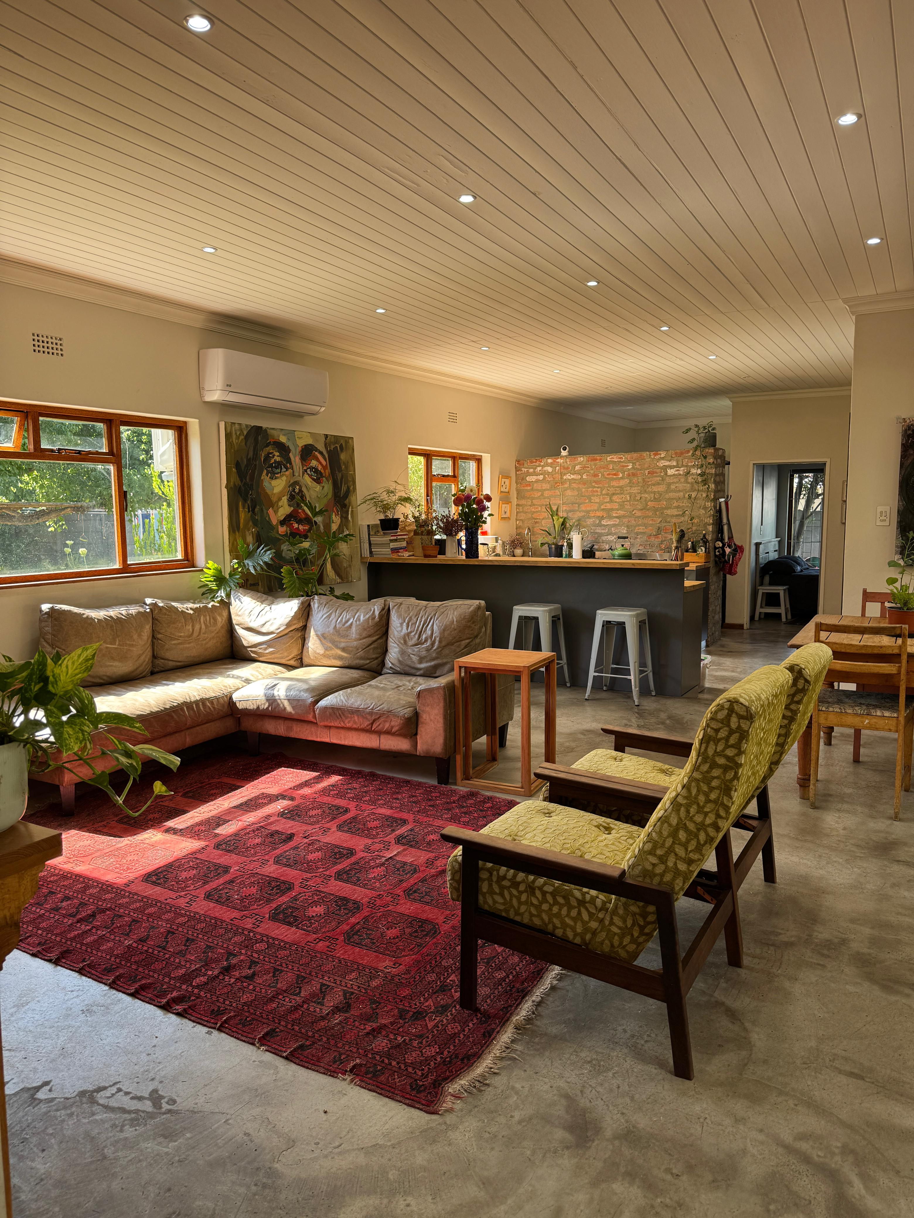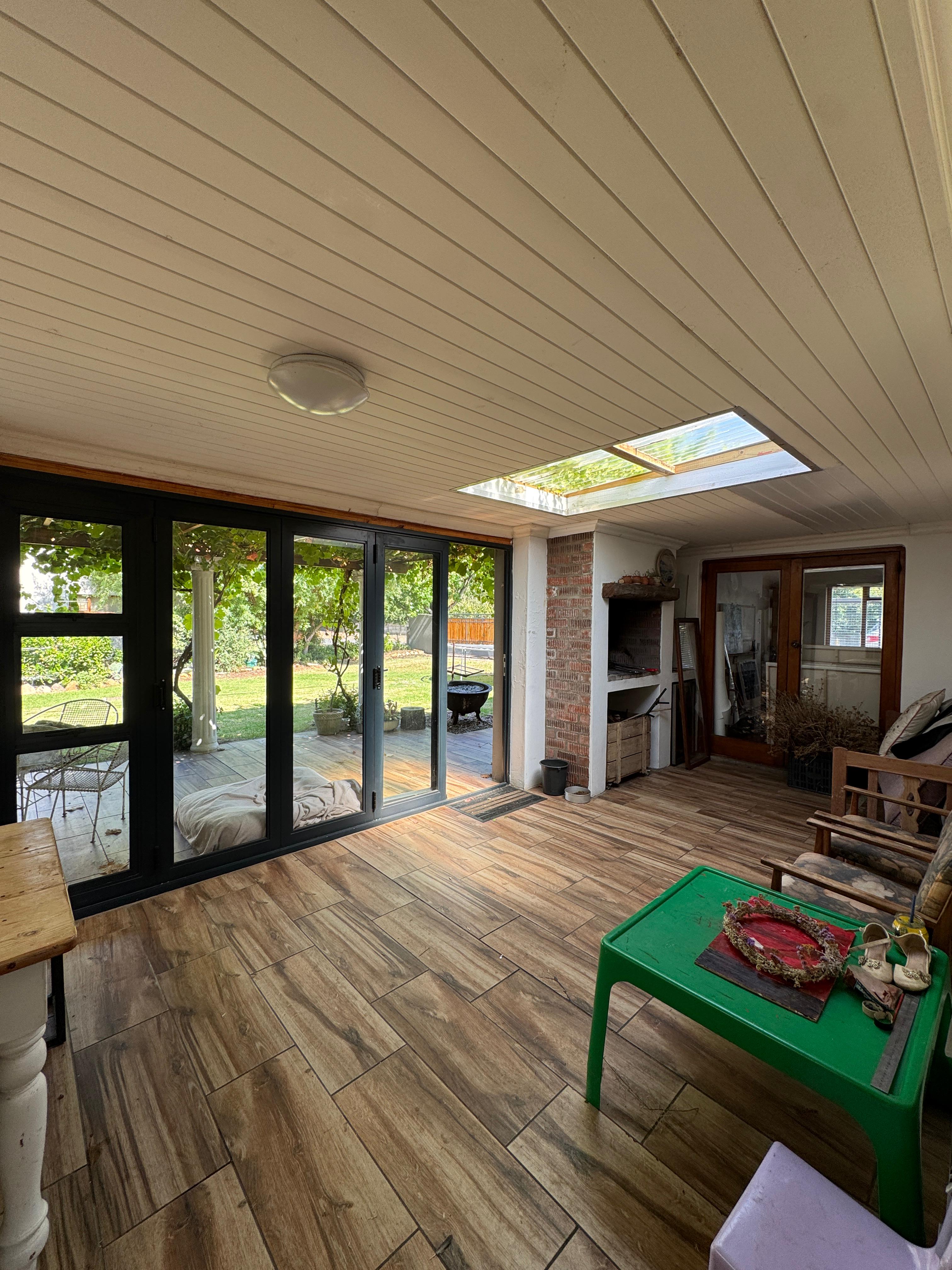 The main lounge is warm and welcoming, featuring a cosy fireplace for chilly winter evenings and air-conditioning for summer comfort. Wooden doors open onto a covered patio with a built-in braai and stacking doors, overlooking a private, established garden—perfect for long afternoons and memorable gatherings.