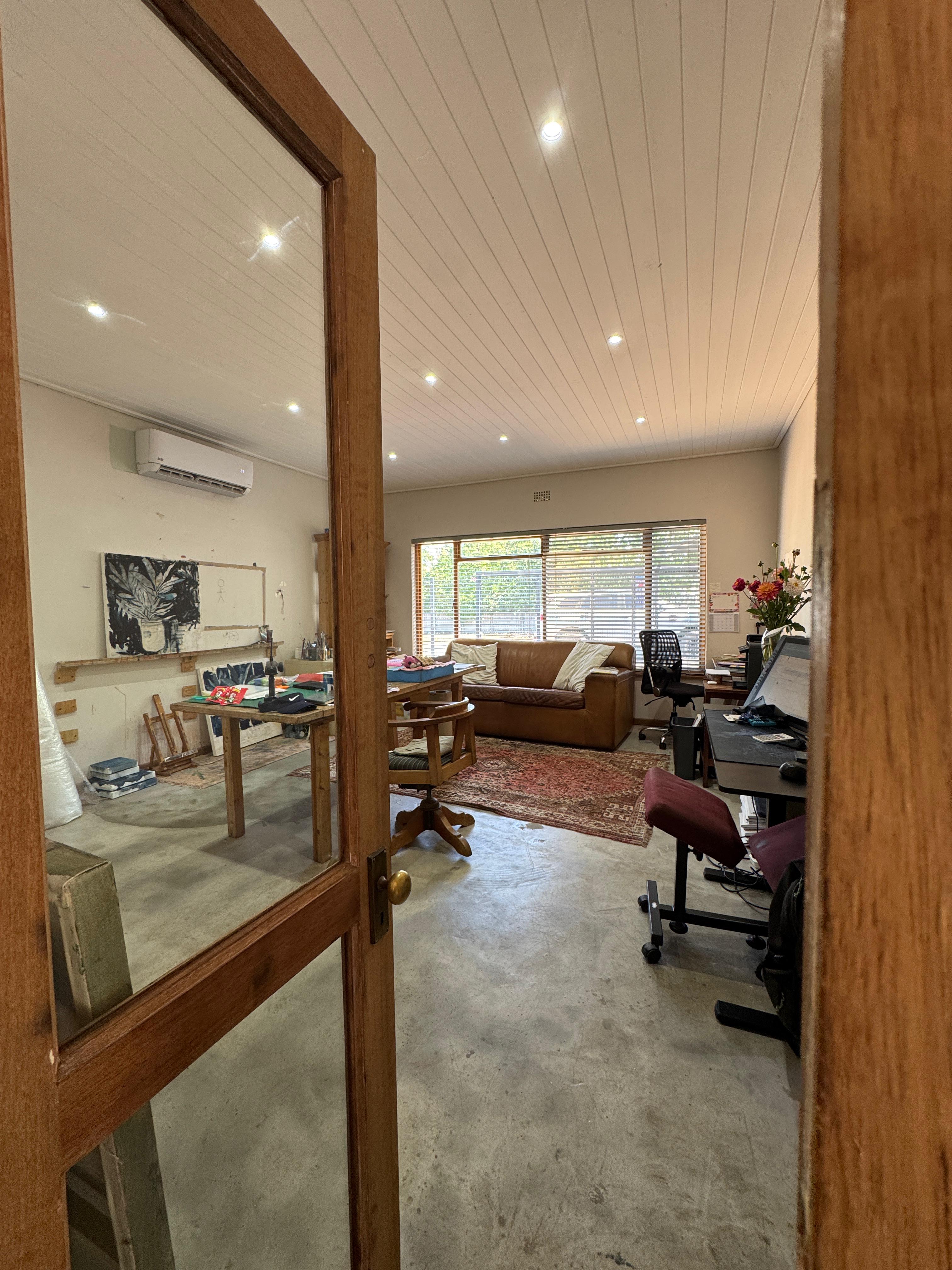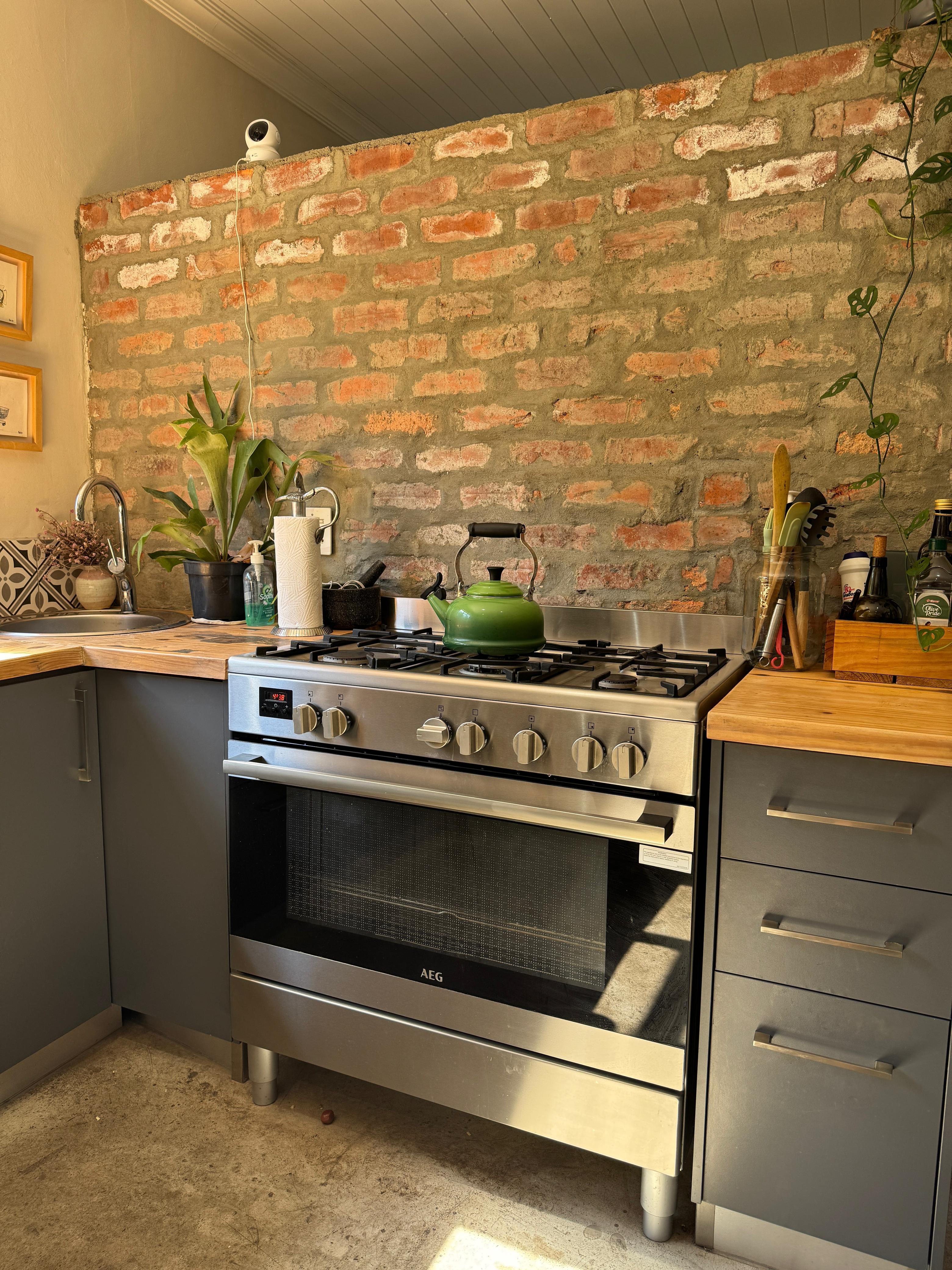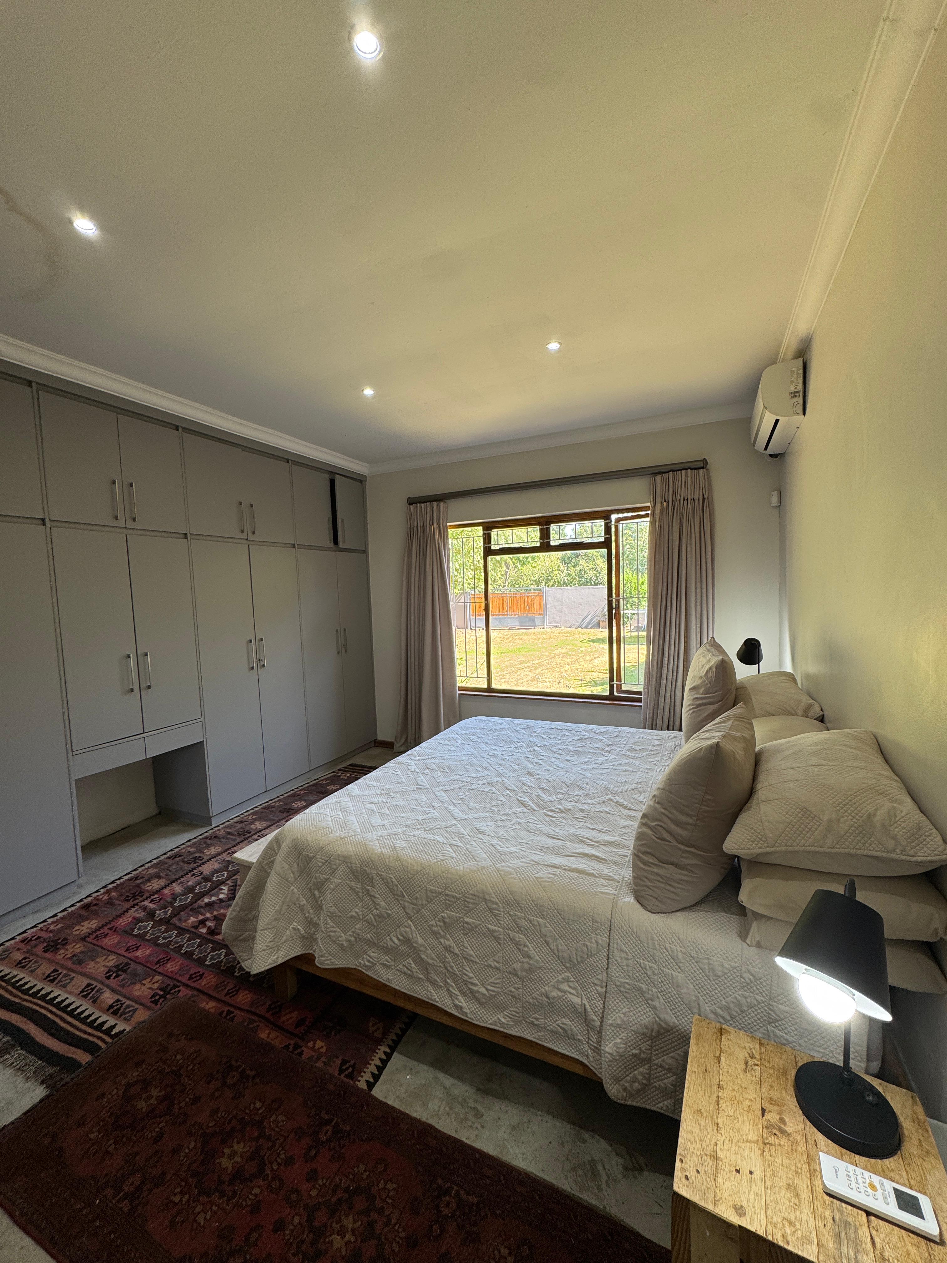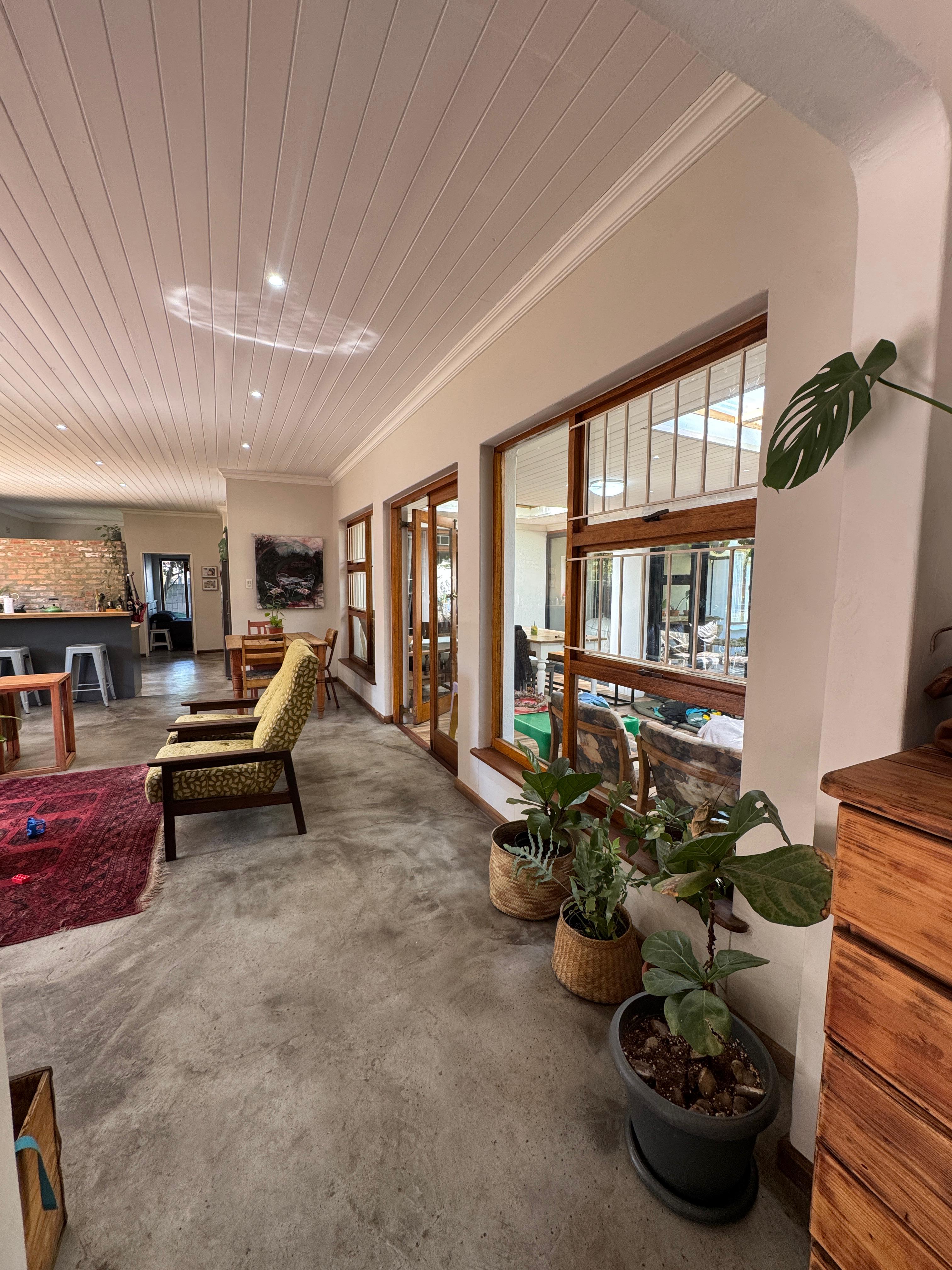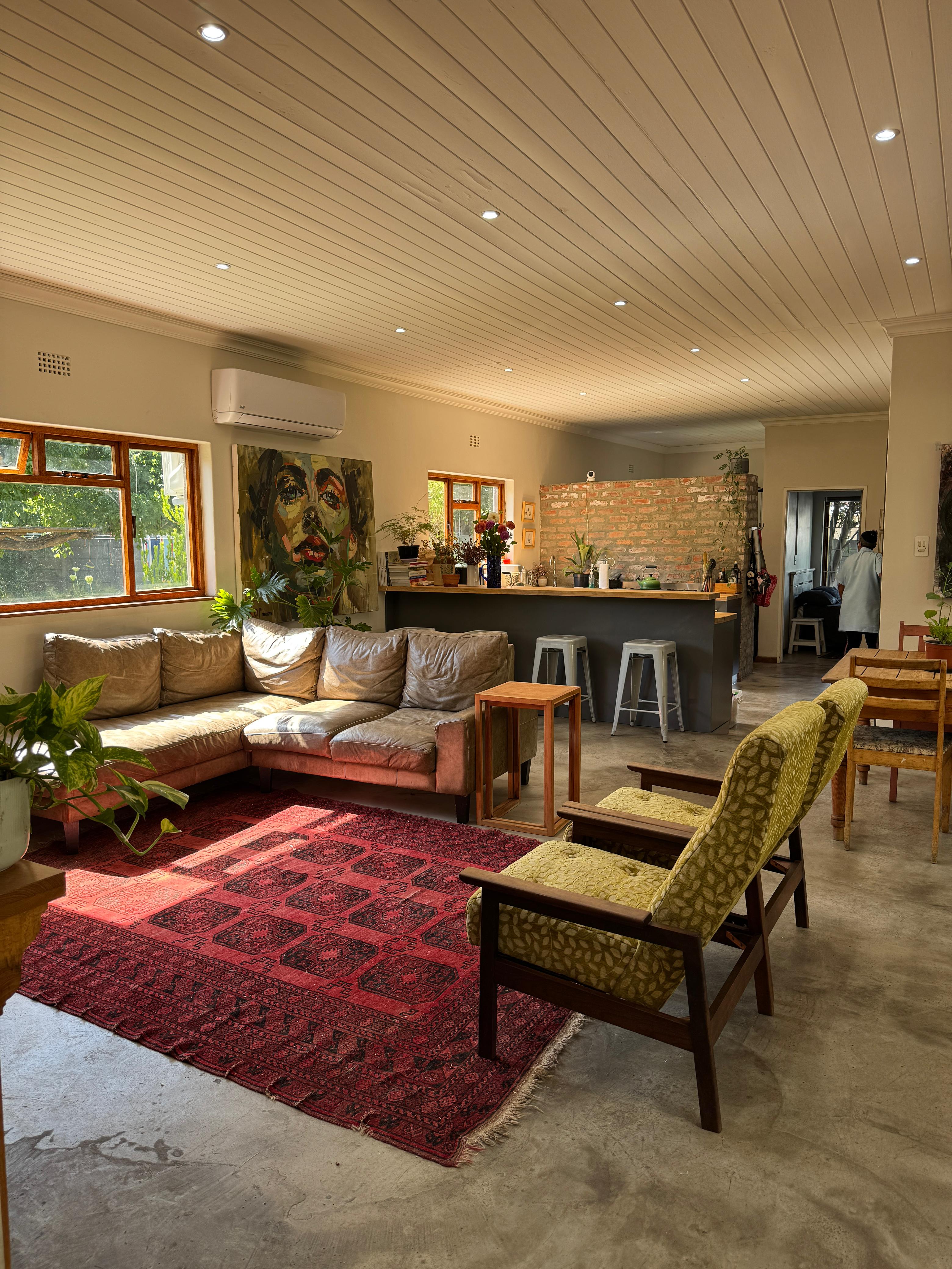 The main lounge is warm and welcoming, featuring a cosy fireplace for chilly winter evenings and air-conditioning for summer comfort. Wooden doors open onto a covered patio with a built-in braai and stacking doors, overlooking a private, established garden—perfect for long afternoons and memorable gatherings.