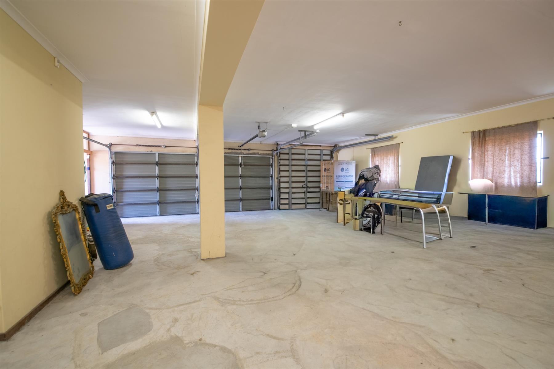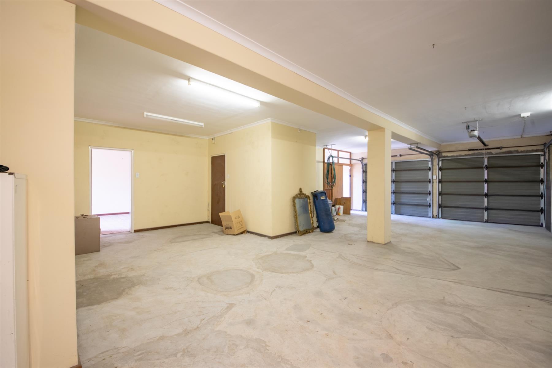 The ground floor can be accessed from the front, the back, or via the triple garage, which currently accommodates up to five vehicles. On the north side, there is a kitchenette, bedroom, and en-suite bathroom opening onto the outdoor braai area.