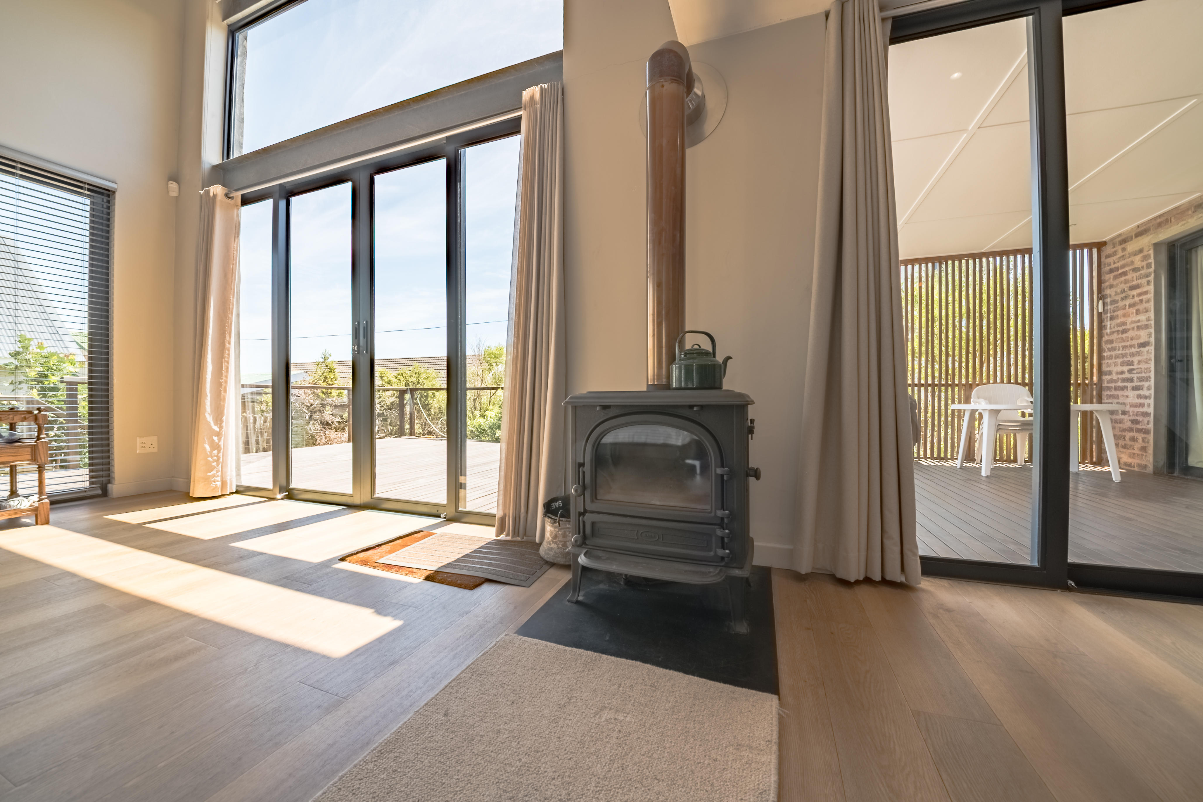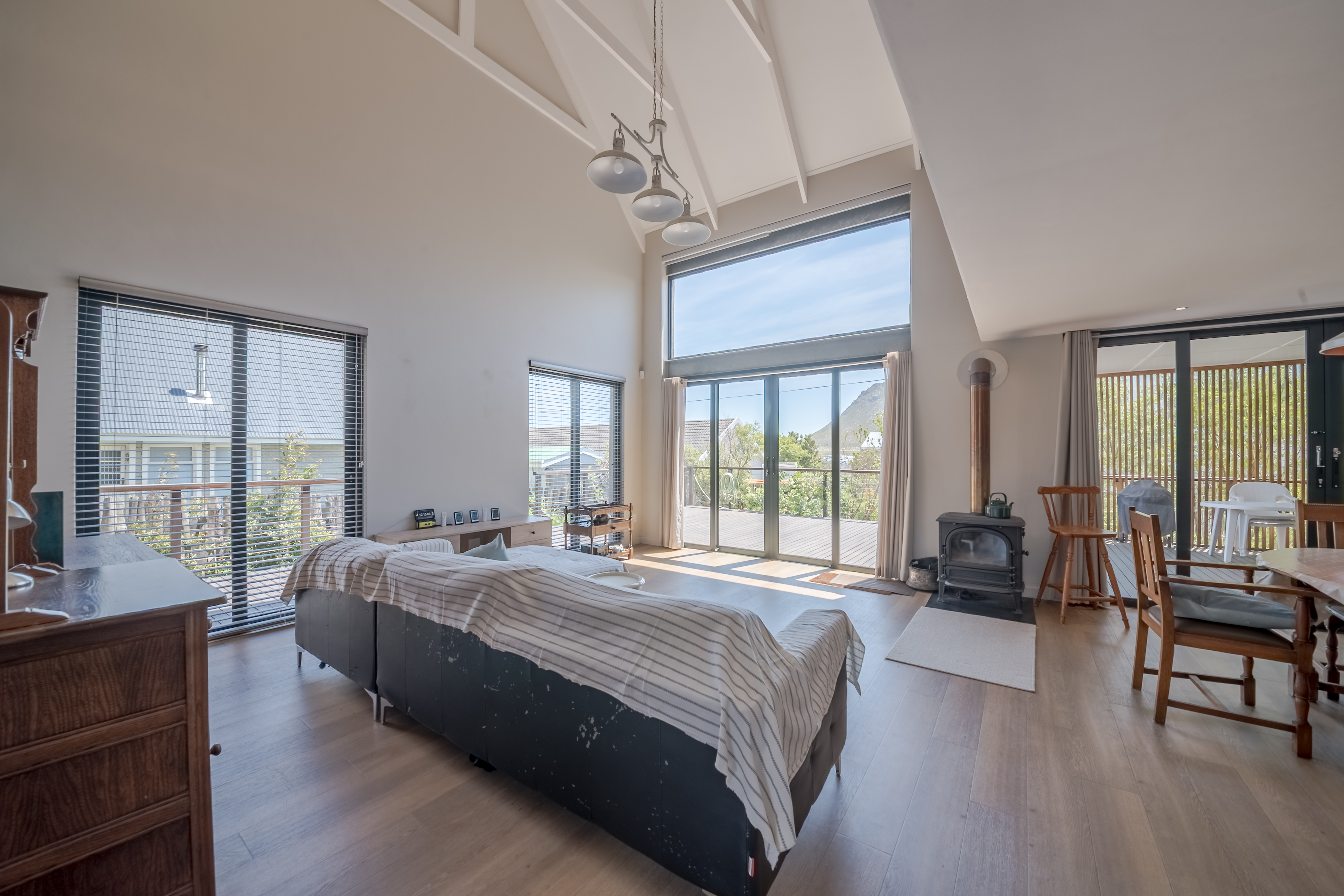 Inside, you’ll find three bedrooms — the main en-suite, a second bathroom serving the other two rooms, and one currently used as a study. The living areas are open-plan and welcoming, anchored by a fireplace that keeps winter evenings warm and cozy. The kitchen, dining, and lounge flow naturally onto a partially covered wooden deck, recently treated and good for the next few years — the perfect spot for morning coffees, lazy afternoons, and long chats with a mountain view.