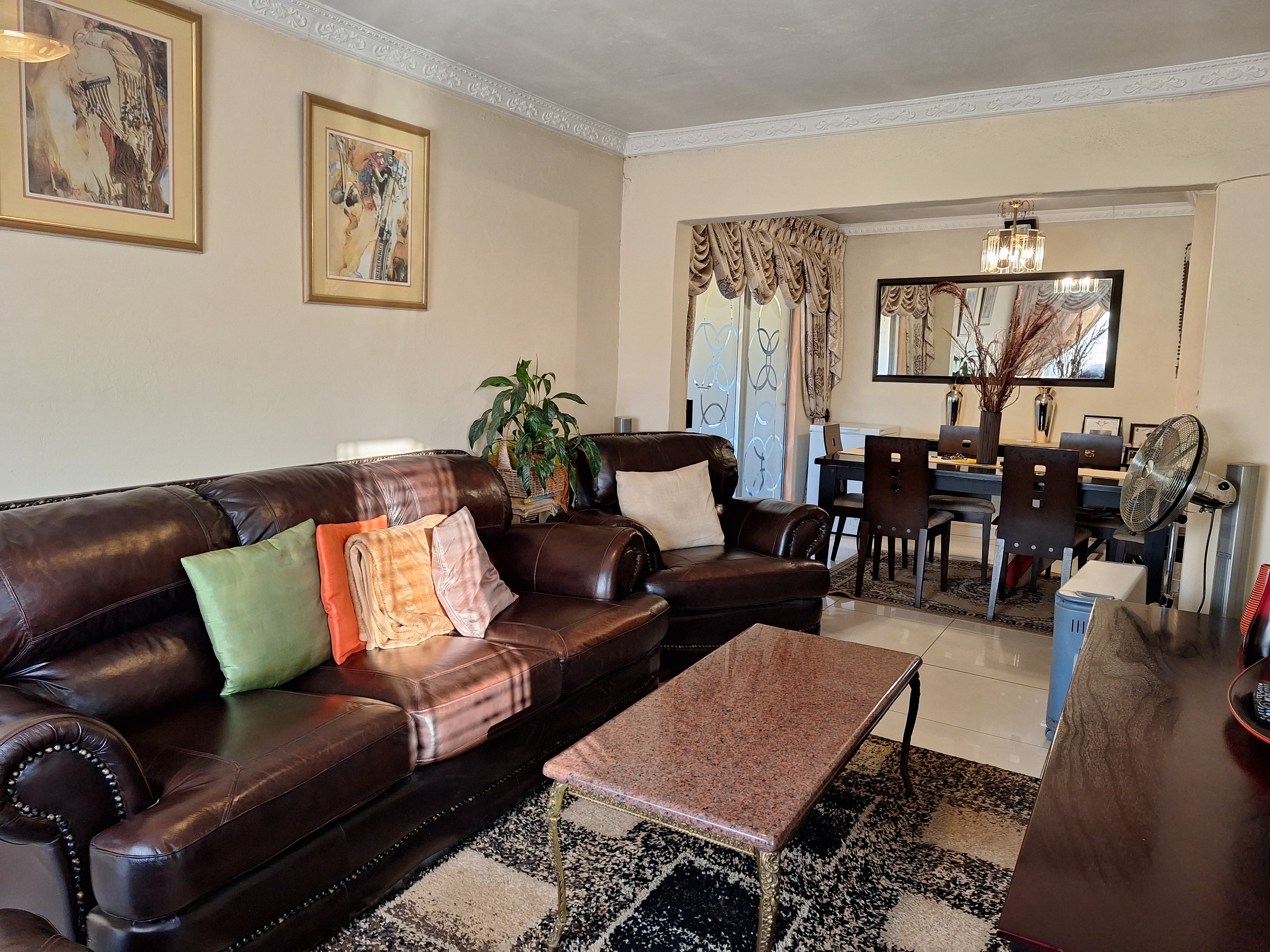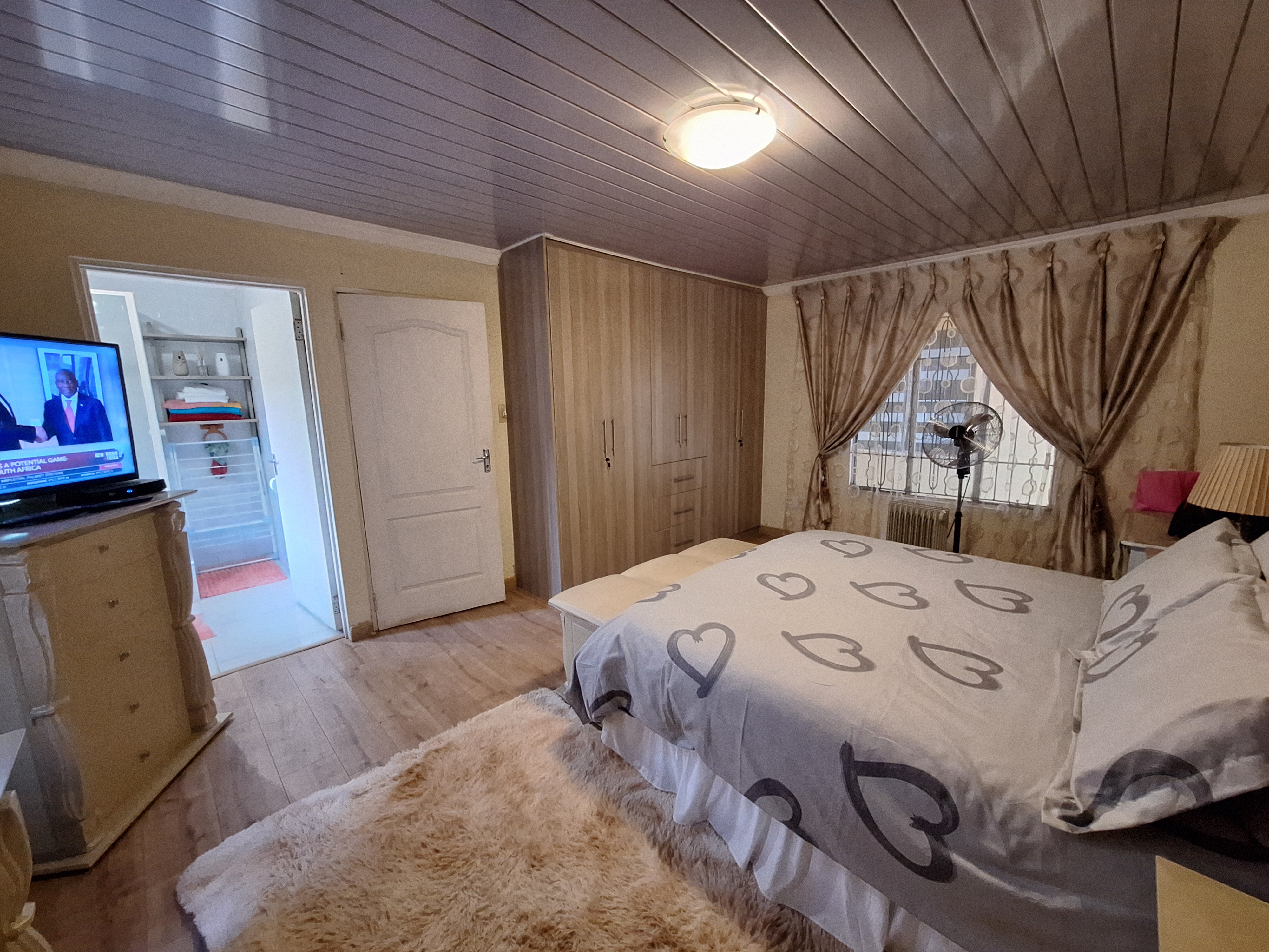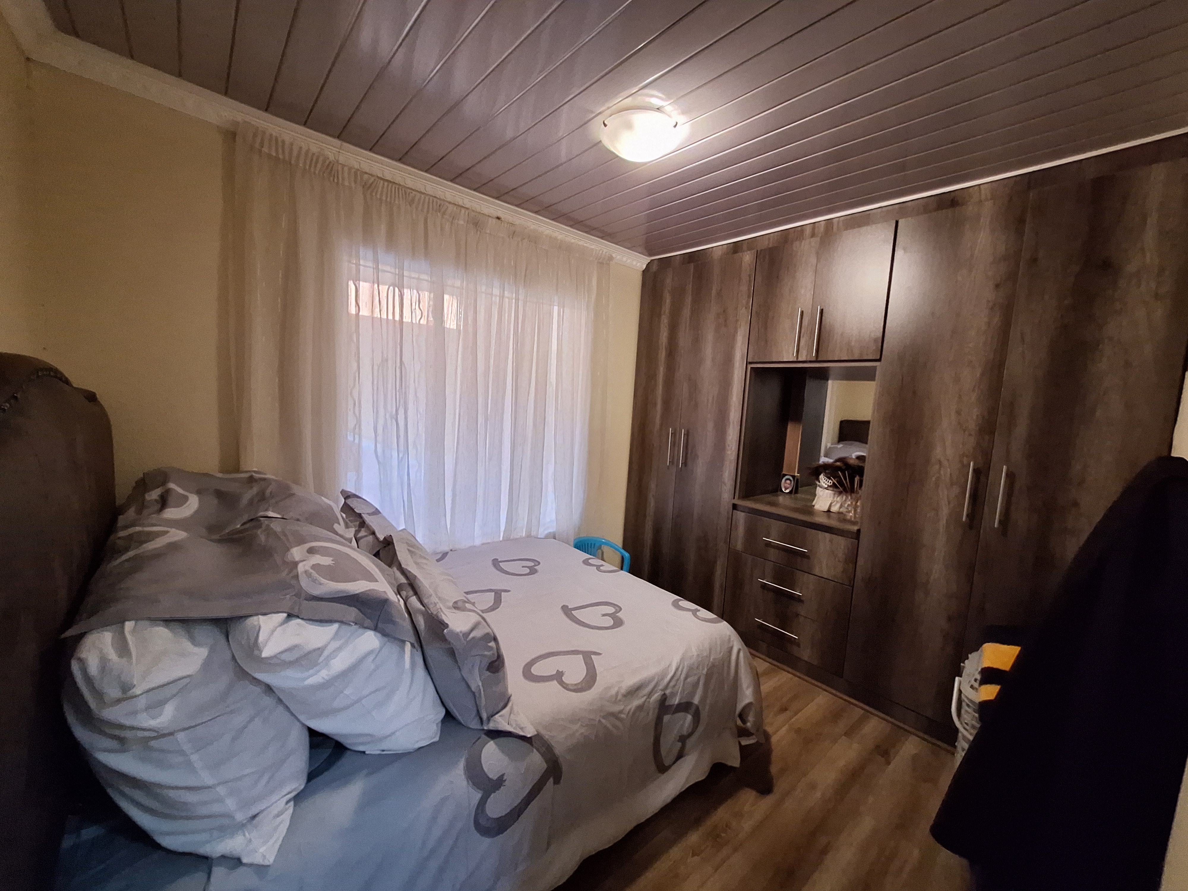 The first bedroom features laminated flooring and built in cupboards. The main bathroom includes a bath and basin, with a separate toilet for added convenience. The main bedroom is generously sized with plenty of built in cupboards and an en suite bathroom with a shower.