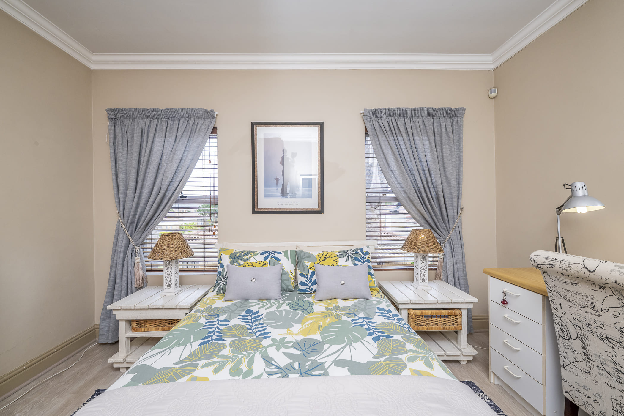 The second bedroom is spacious enough to be used as the main bedroom and offers laminated flooring, air-conditioning, downlights, blinds, built-in cupboards, and extra drawer storage. The alarm control is also located here.
