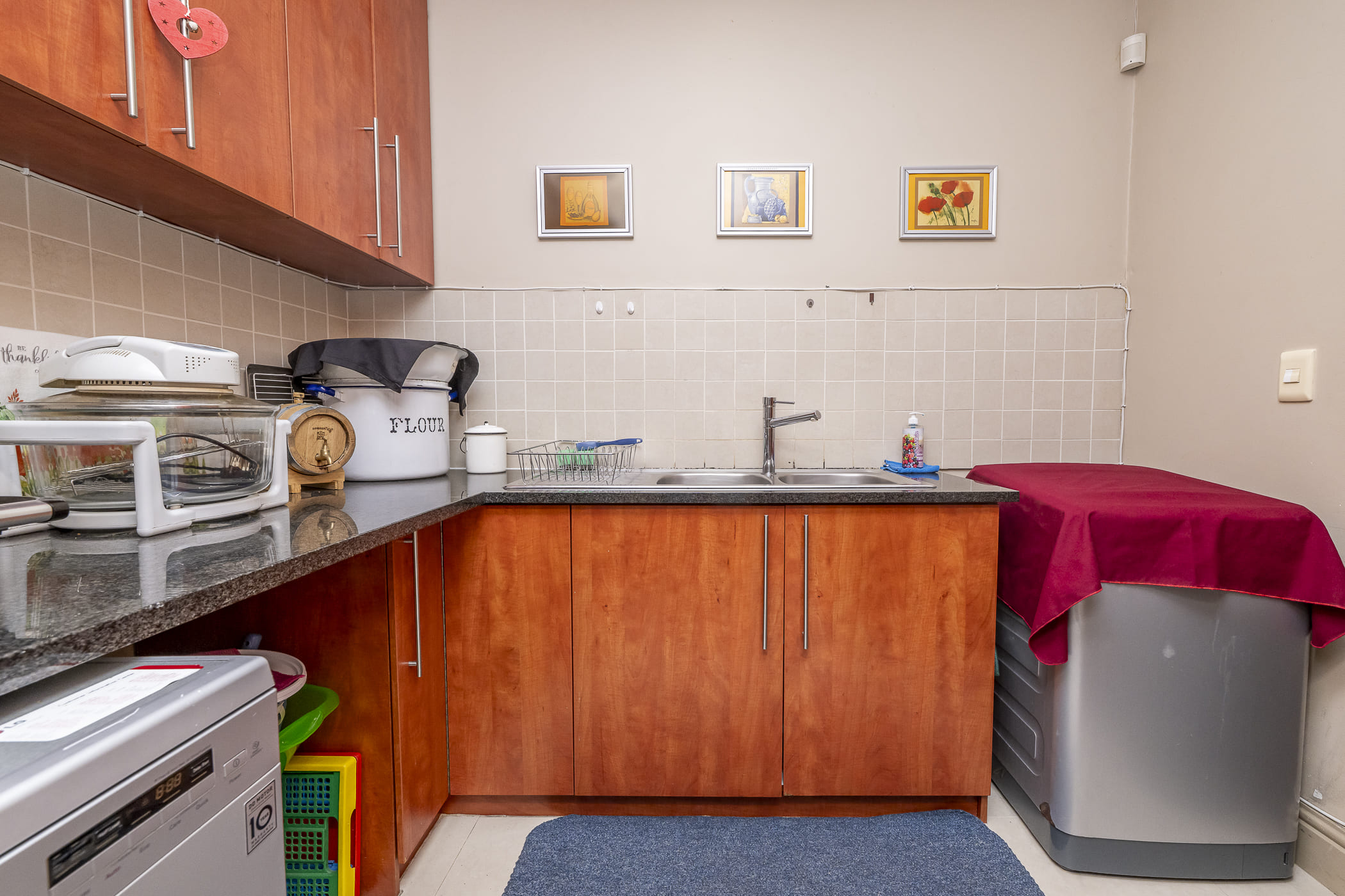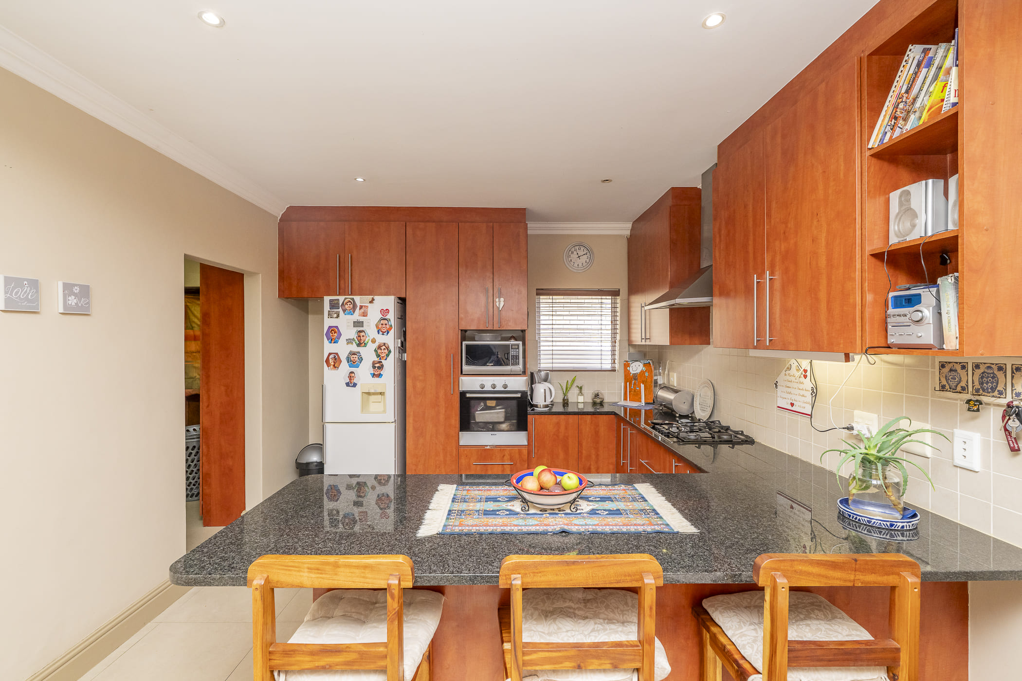 The kitchen is well equipped with granite counters, a breakfast nook, plenty of cupboards, a gas hob with one electric plate, extractor fan, eye-level oven, and space for a double-door fridge. The scullery offers extra cupboards, two water points (for a washing machine and dishwasher), and a back door leading to the washing line area