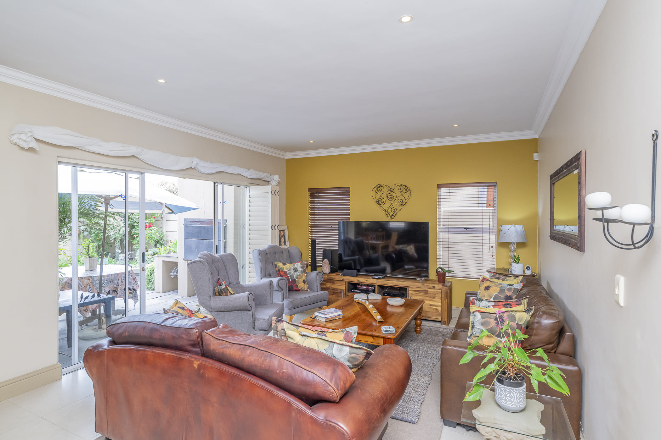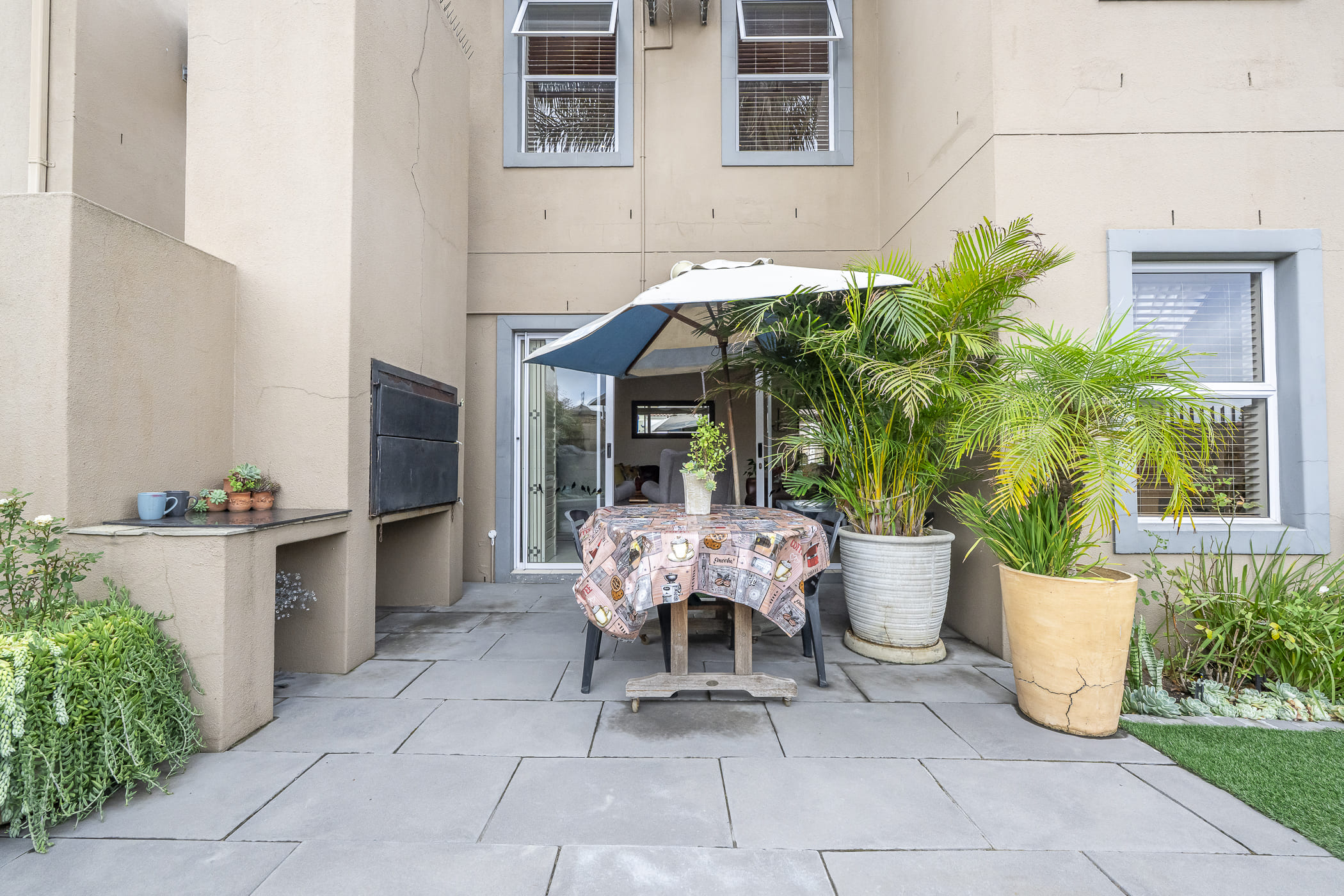 The heart of the home is the open-plan living, dining, and kitchen area, all tiled for easy living. Sliding doors with security stacker shutters open onto a private, low-maintenance garden with an outside built-in braai — perfect for relaxed weekends and entertaining. The garden features flower boxes and artificial lawn, so it always looks good with minimal effort.