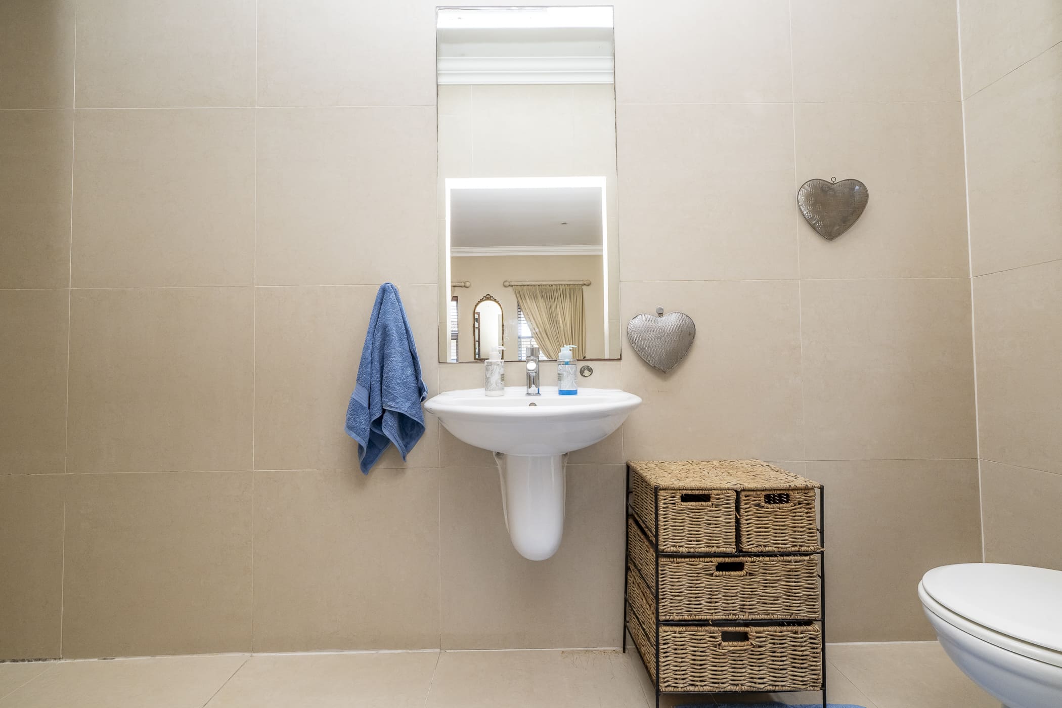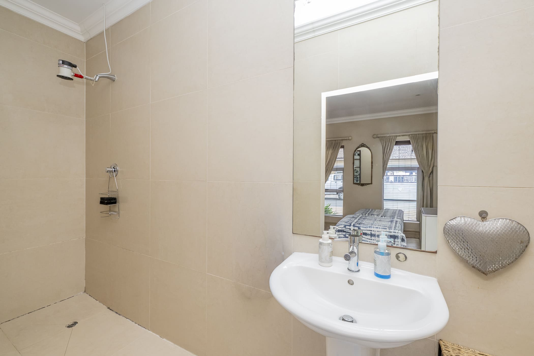 To the right, you’ll find a spacious bedroom with laminated flooring — perfect as a main bedroom or guest room. It has built-in cupboards, blinds, a wall heater, and a neat en-suite bathroom with a walk-in shower, basin, toilet, and extractor fan.