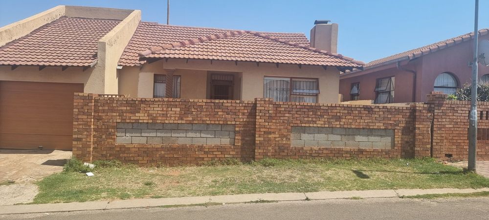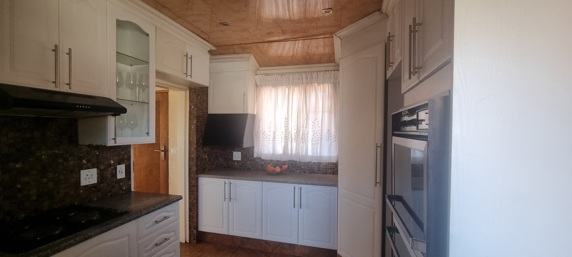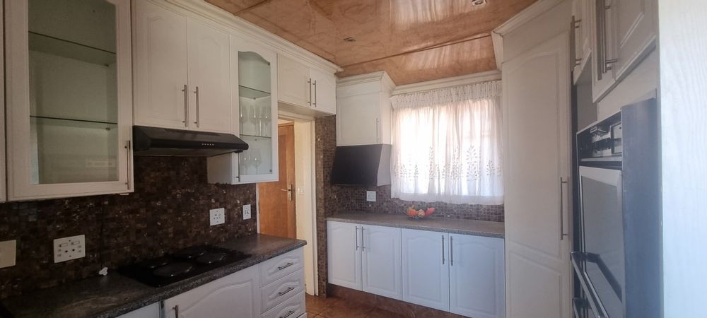 This home welcomes you with a tiled kitchen with built in cupboards which leads to a tiled