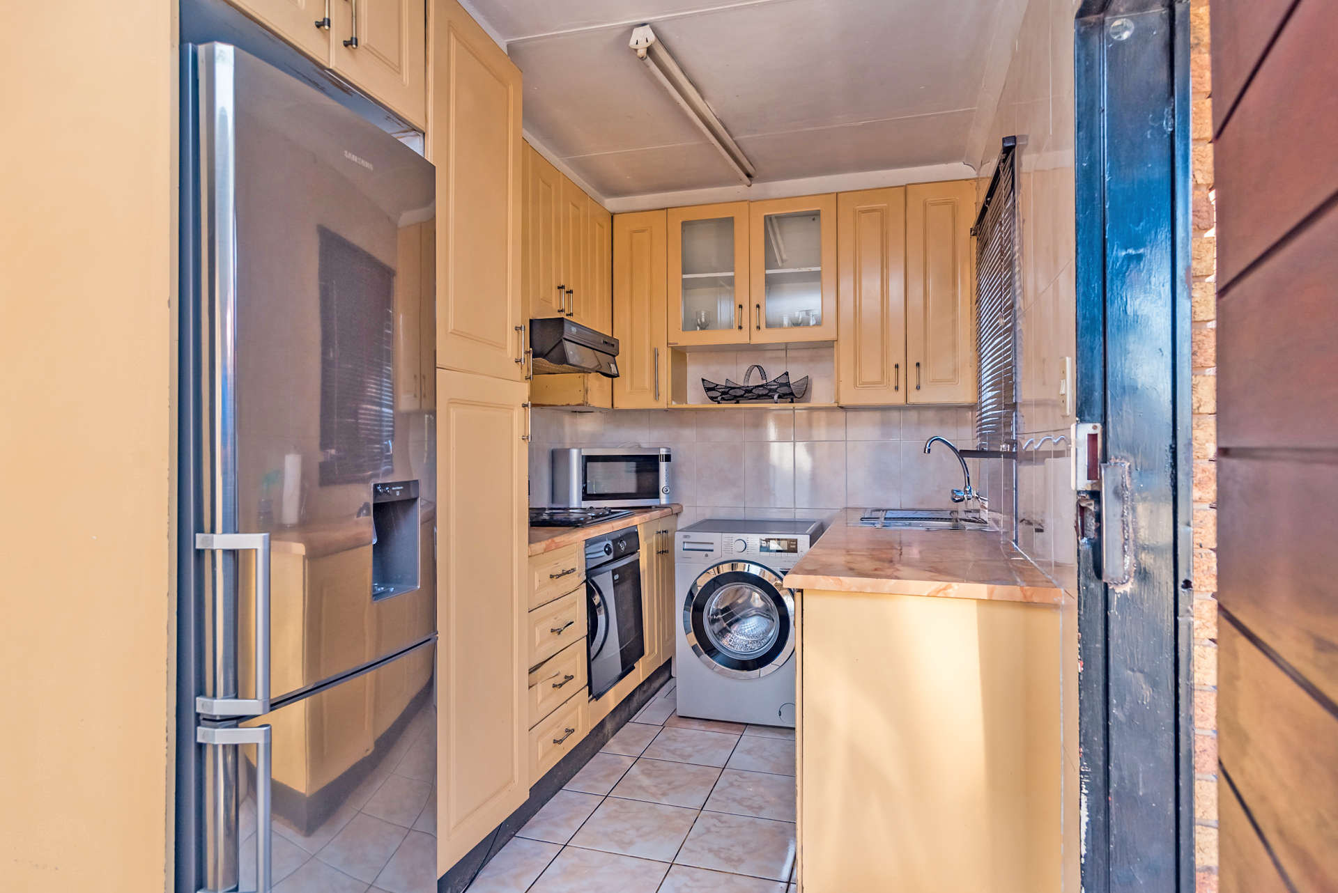 - Fitted kitchen with stove, oven, and hob, tiled floors and walls