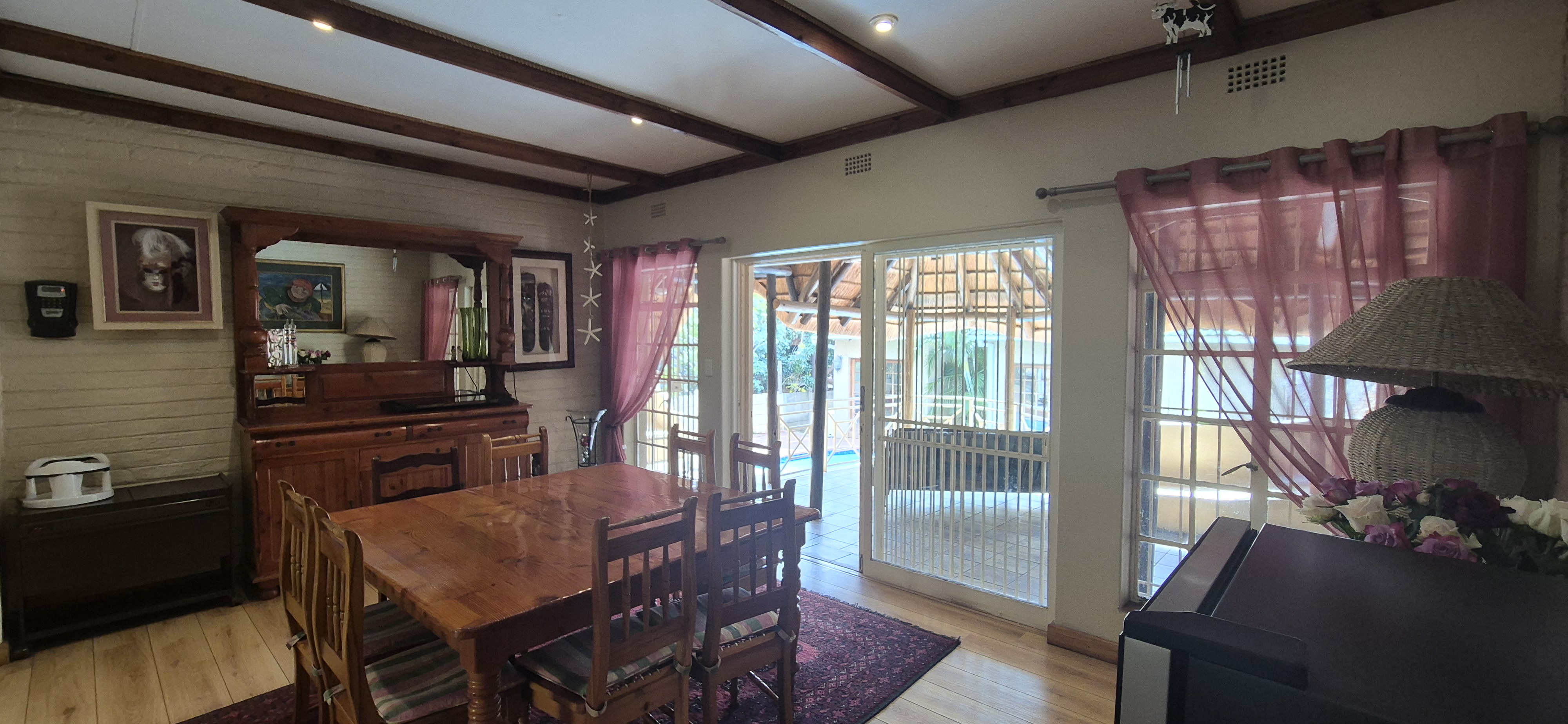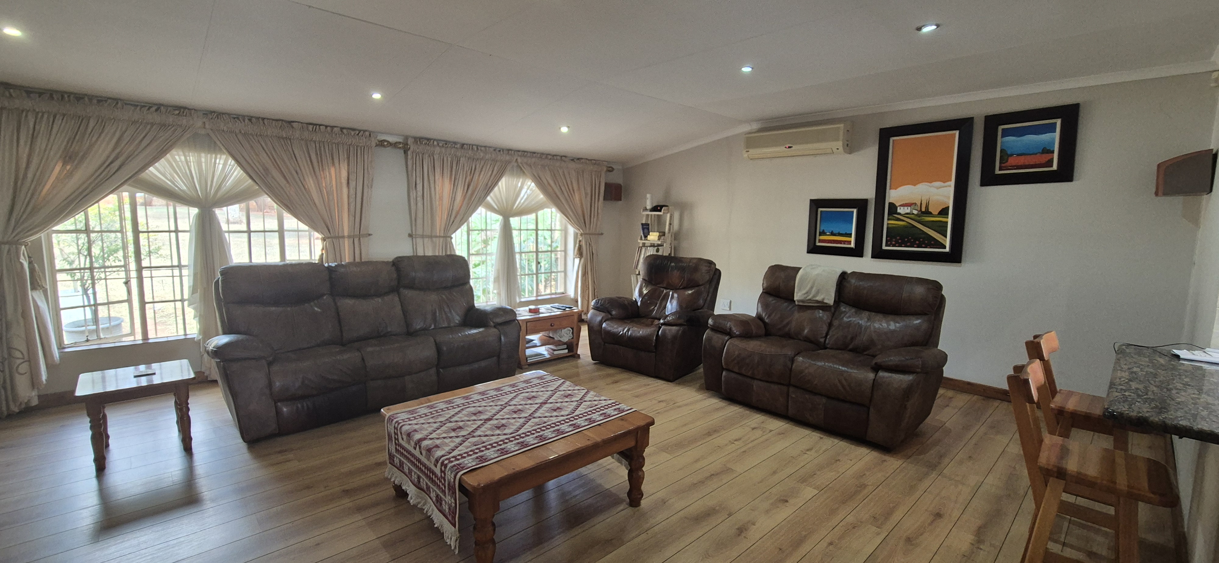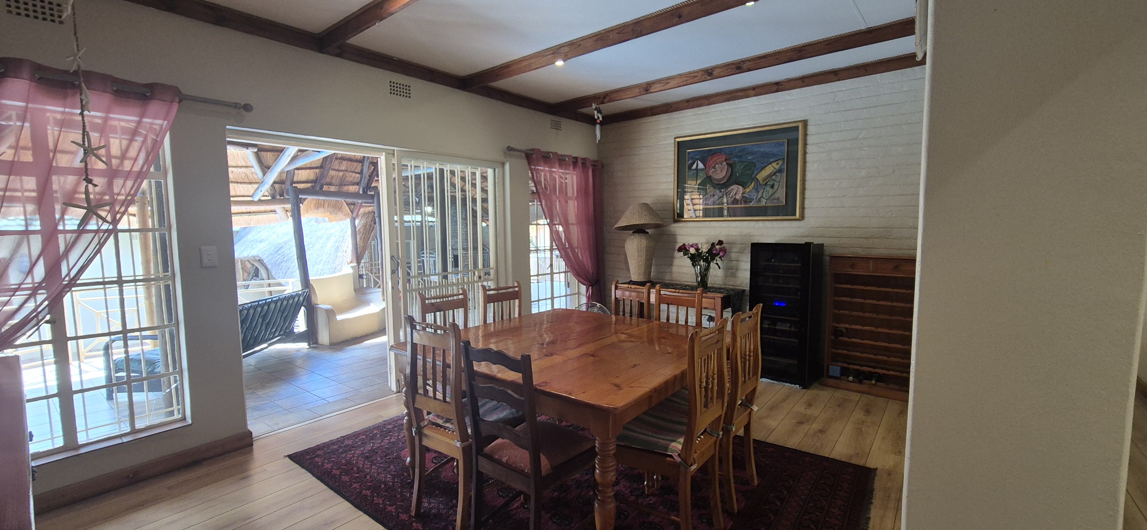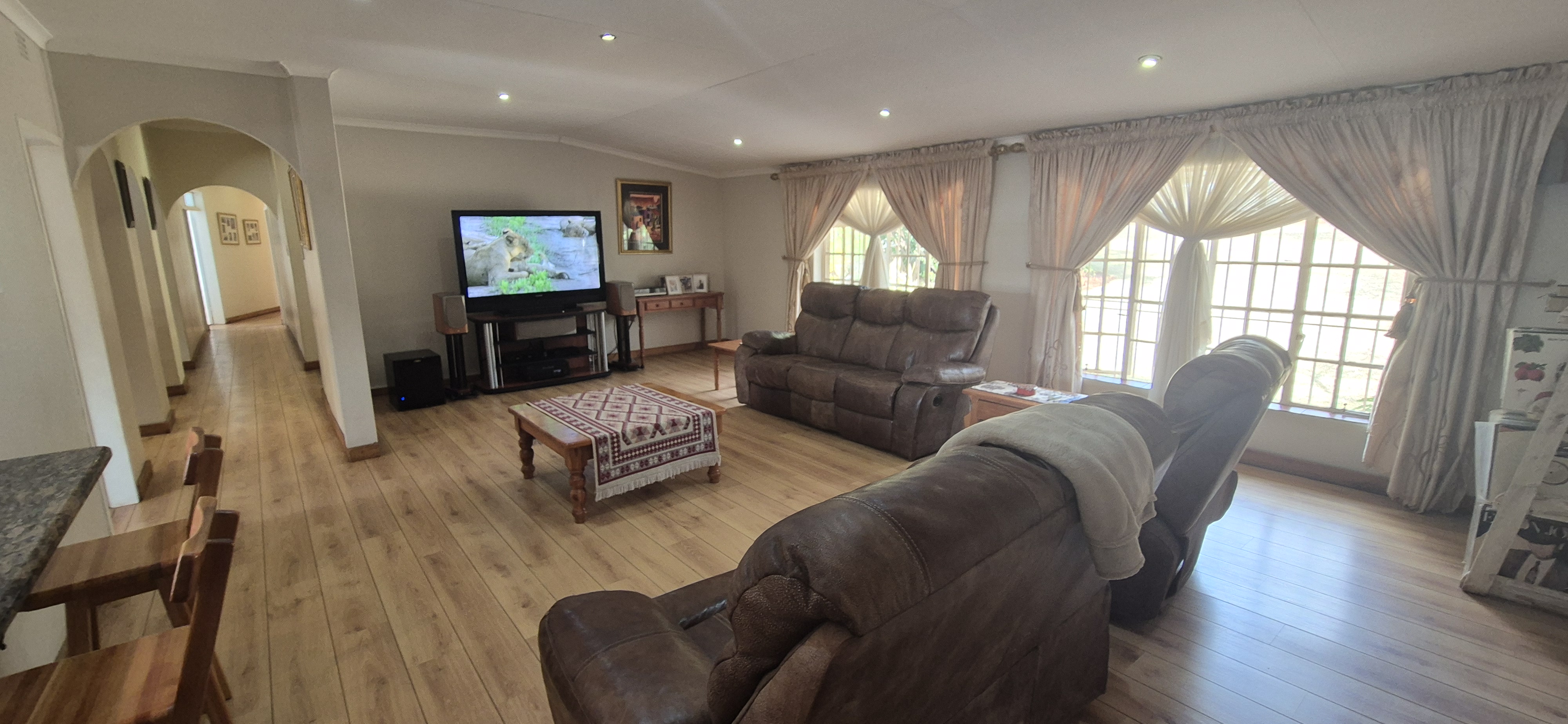 Outdoors, enjoy all year round entertainment with a sparkling pool, lapa covered patio with built-in braai leading to an airconditioned entertainment area and bar creating the perfect indoor hosting space.
