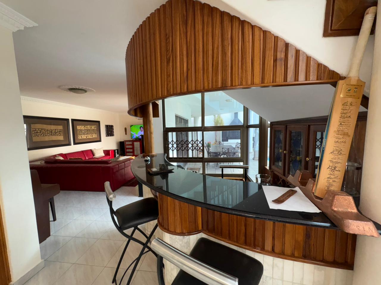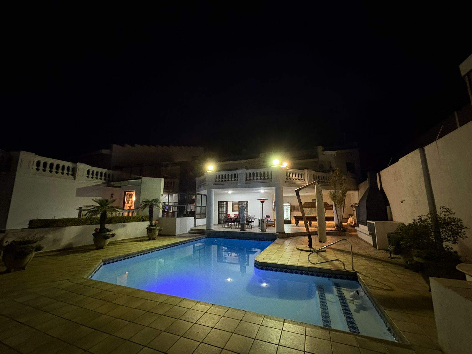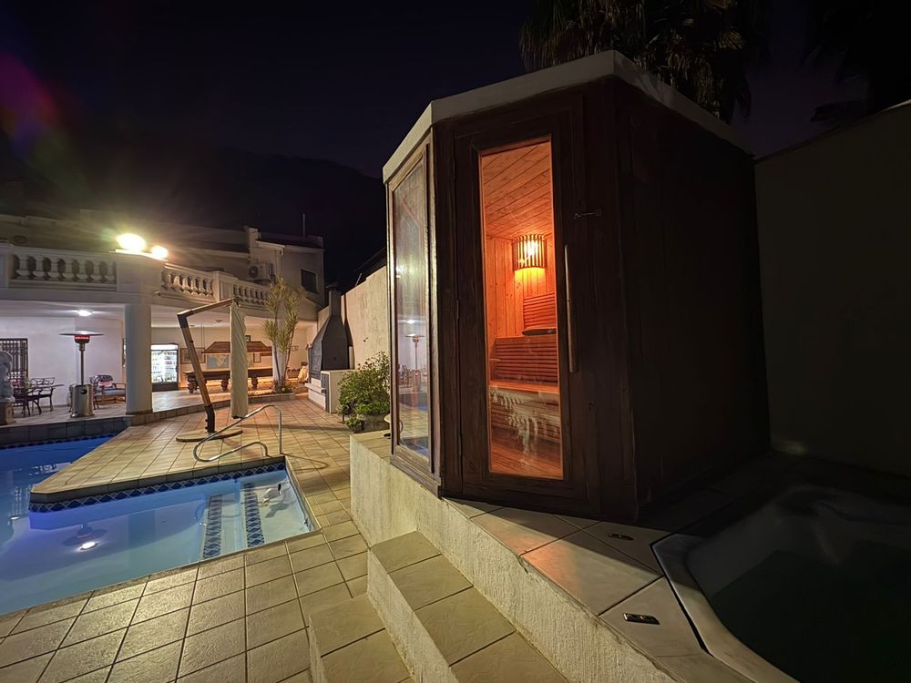 A cozy TV room flows seamlessly into an entertainment area featuring a built-in braai, swimming pool, sauna, and Jacuzzi — ideal for hosting guests or relaxing in total comfort.