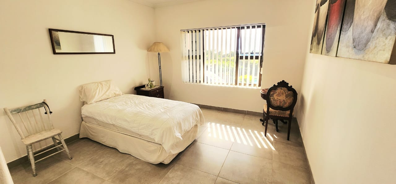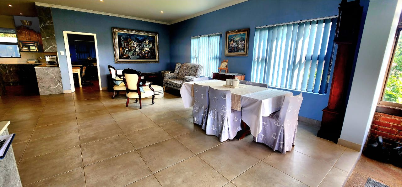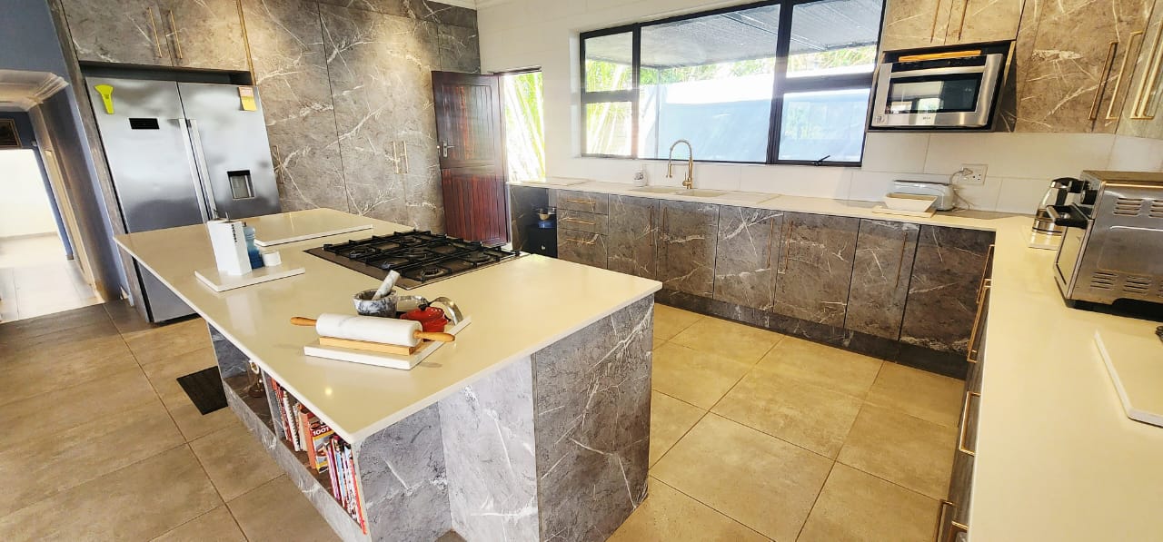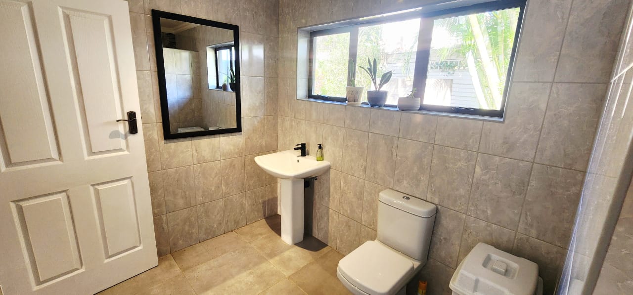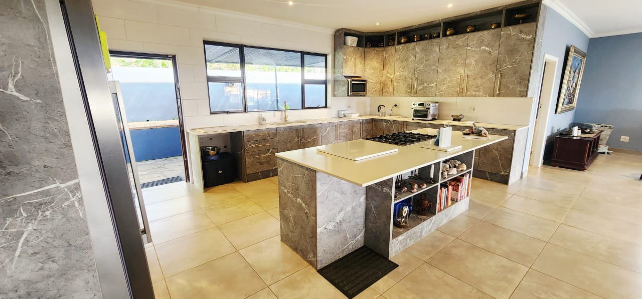 Set on a flat stand, only 200m from the beach and the local superette a short walk, a safe and secure area where the locals form a tight community. This immaculate home has been completely refurbished from floor to ceiling, electrical to plumbing. Stunning tiles throughout with modern kitchen and magical bathrooms. Enter into the long sunroom with lovely ocean views, this opens to the expansive open plan lounge, dining and kitchen areas with enough space to accommodate an intimate seating area. Off this area is a bedroom or study with its own ensuite consisting of toilet, basin and shower (perfect guest bedroom) On the opposite side of the home are 4 large bedrooms and a family bathroom (shower, basin and toilet), the main bedroom is huge and has a separate dressing room and a stunning ensuite, also with shower, basin and toilet. There is an outside laundry and a small workshop attached to the home, a single garage with a shadeport attached, the property is fully walled and secure with alarm and beams. The gardens are immaculate, with towering palms lining the driveway, rolling lawns and a swimming pool. There is a 7,7kw, 14 panel solar system with inverter and back-up batteries, running 95% off the grid. Water storage tanks for the dry days, plumbed to the home and a solar geyser as well. Looking for a property that is move-in ready, then this is the one! Please contact us ANYTIME to chat further! Matriarch Real Estate powered by Mandate Property Group (Pty)Ltd