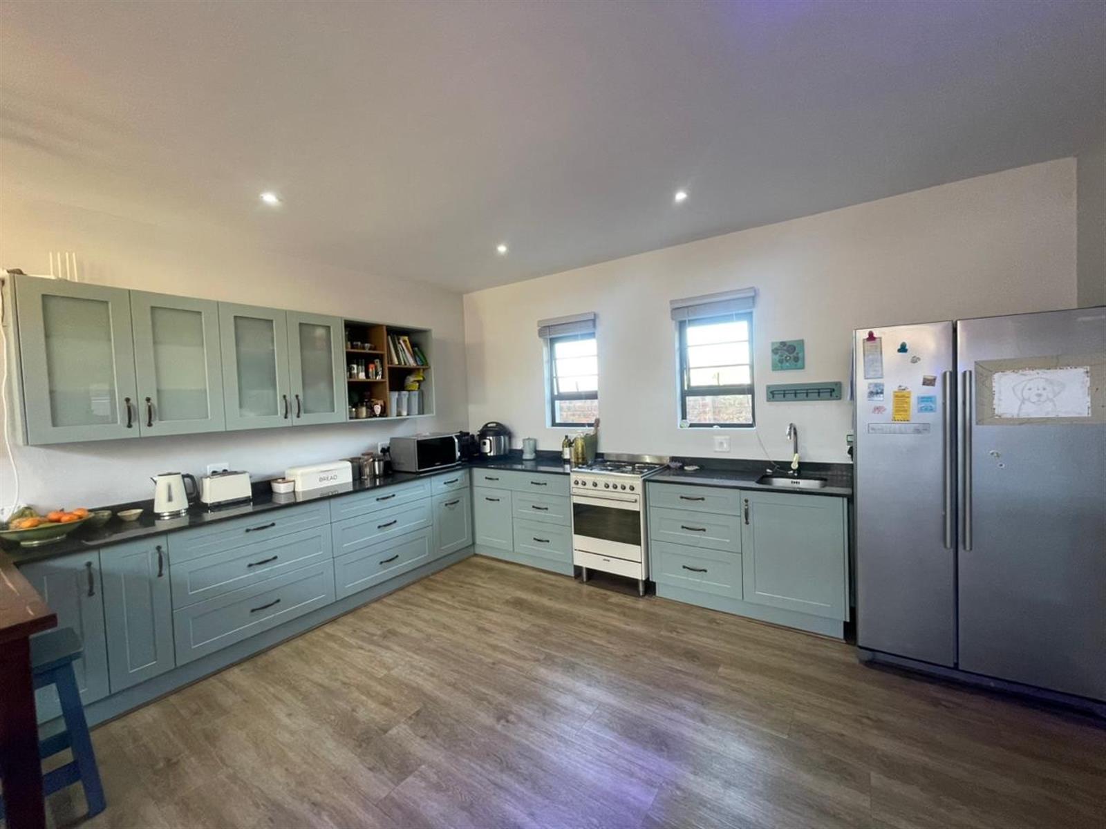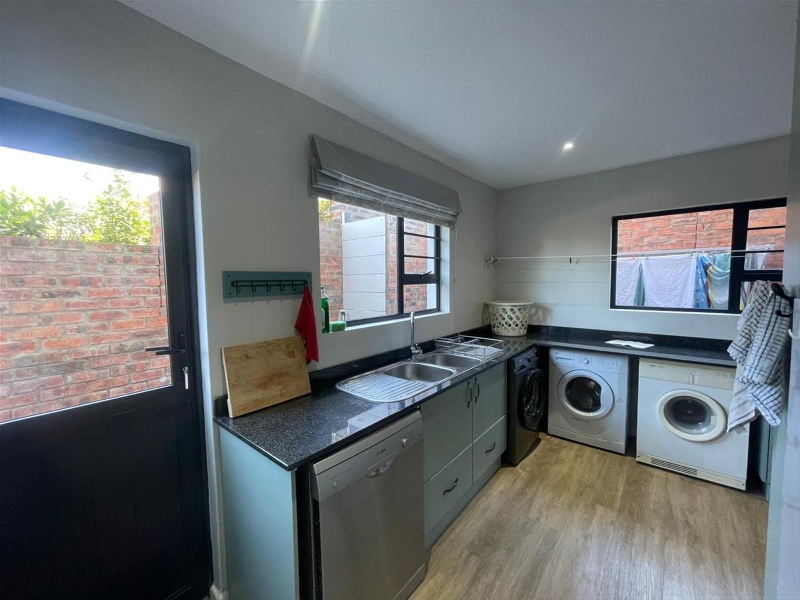 Inside, the home has a warm, open plan feel. The kitchen is stylish and practical, fitted with light blue/sage cupboards, lots of counter space, and an island. The natural light, and clean layout make this kitchen a real standout. A full laundry room/scullery with a double sink, dishwasher, washing machine, and dryer connections add great convenience to the home.