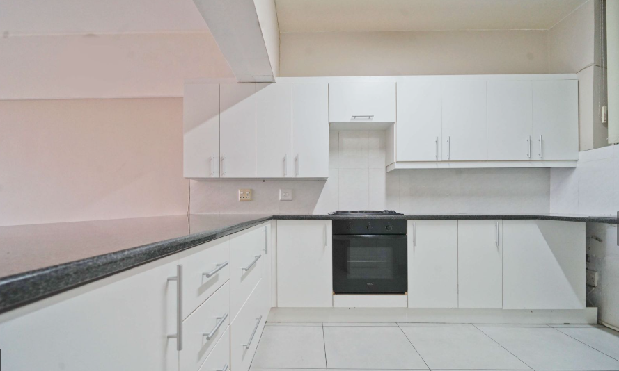 Modern melamine kitchen fitted with granite countertops and an under-counter oven