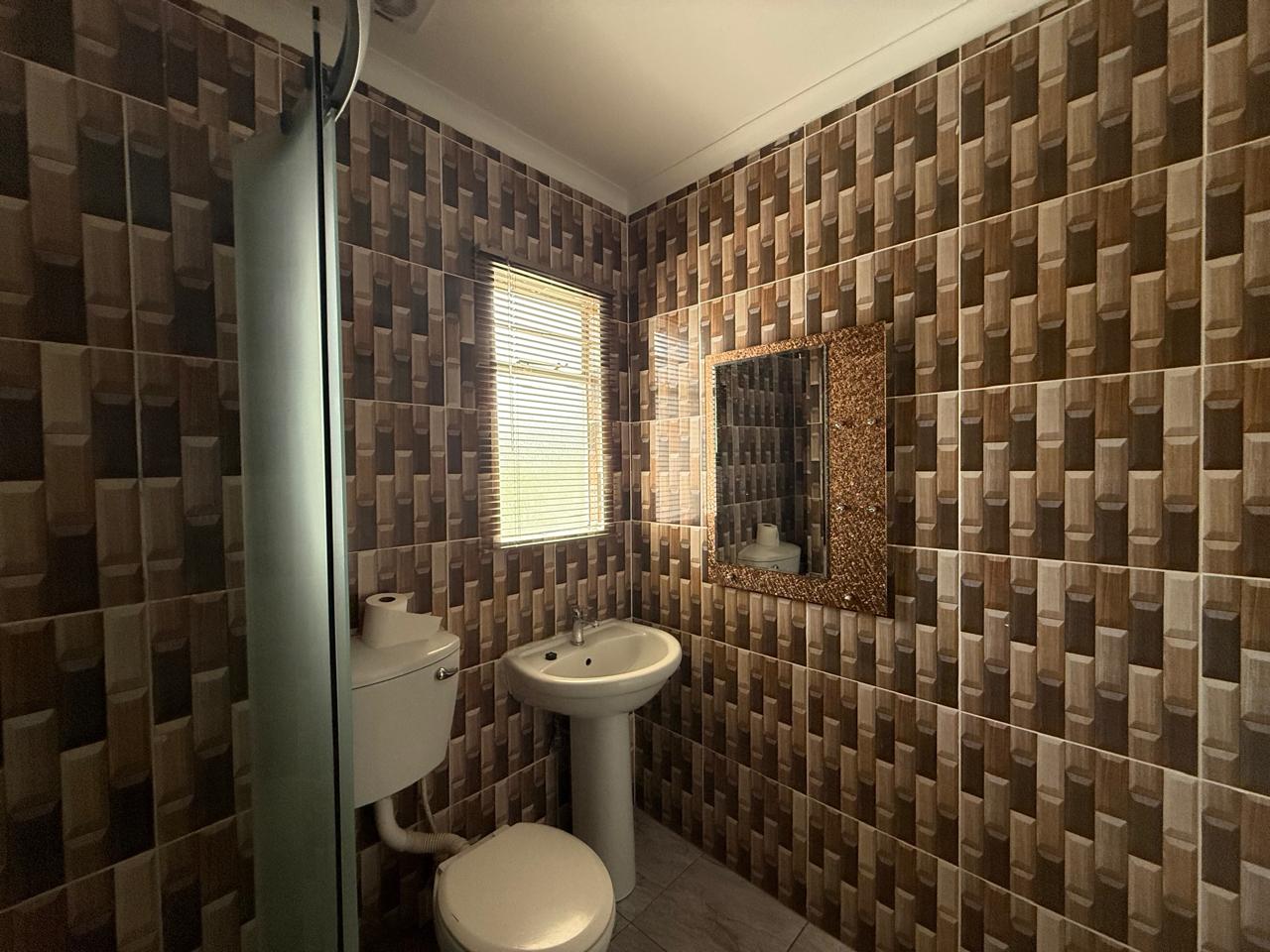 1 neat bathroom, tiled floors, blinds, shower, toilet and basin