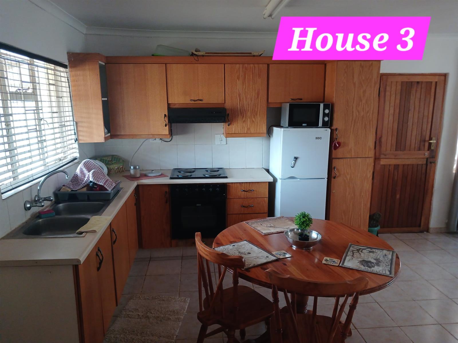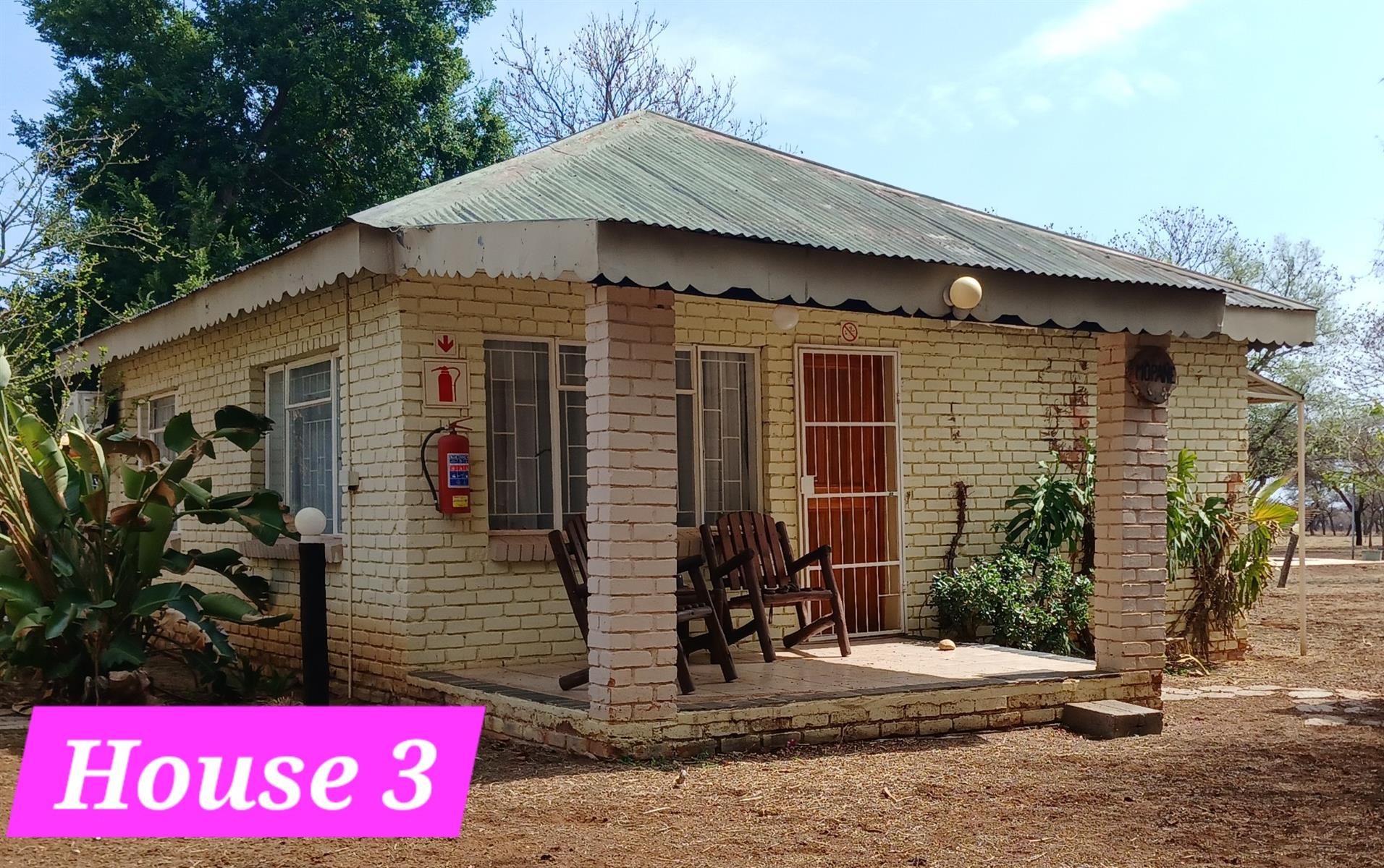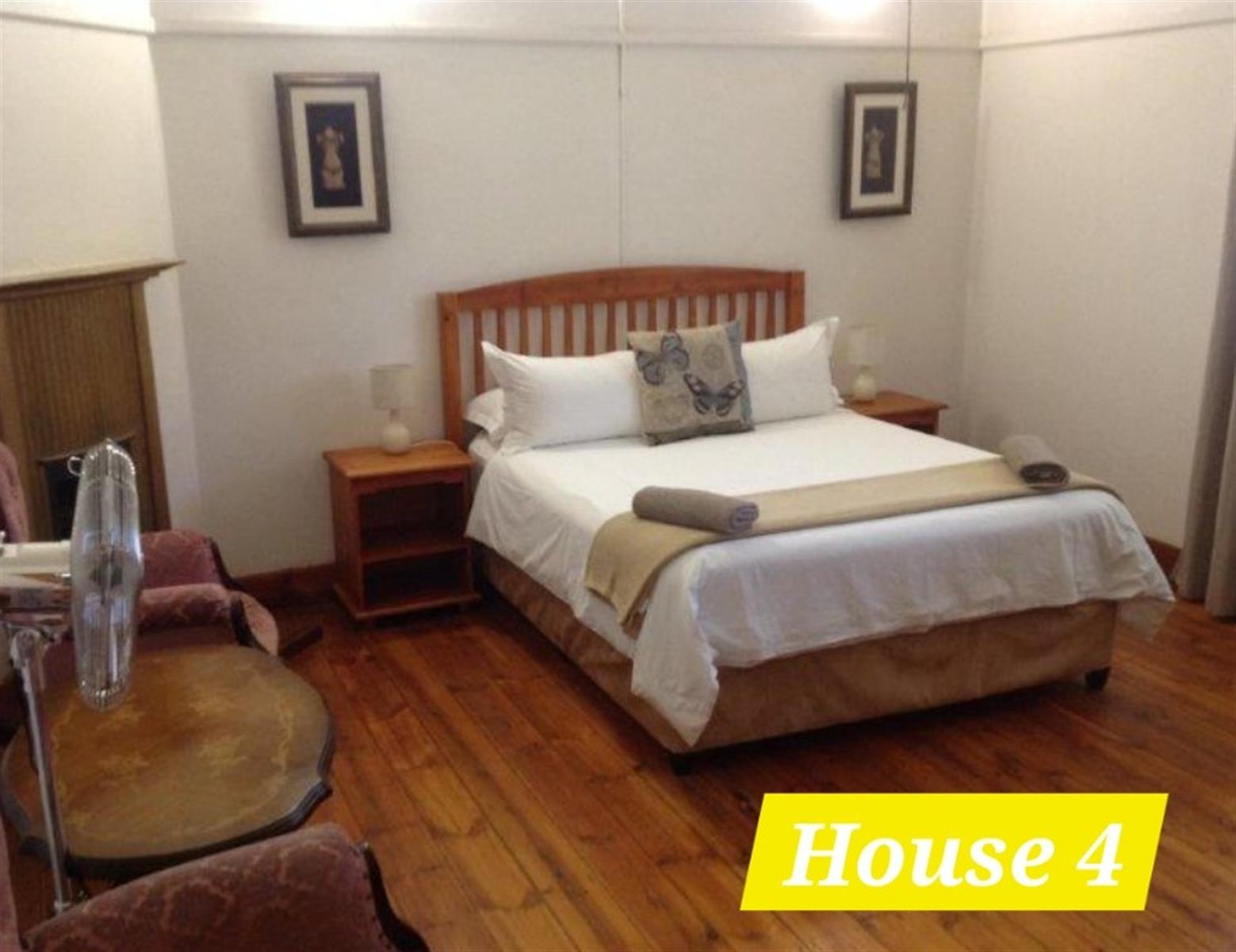 House 4: 4 bedrooms, braai room, 2 kitchens, lounge with fireplace, 2 bathrooms (1 en-suite), and wrap-around veranda