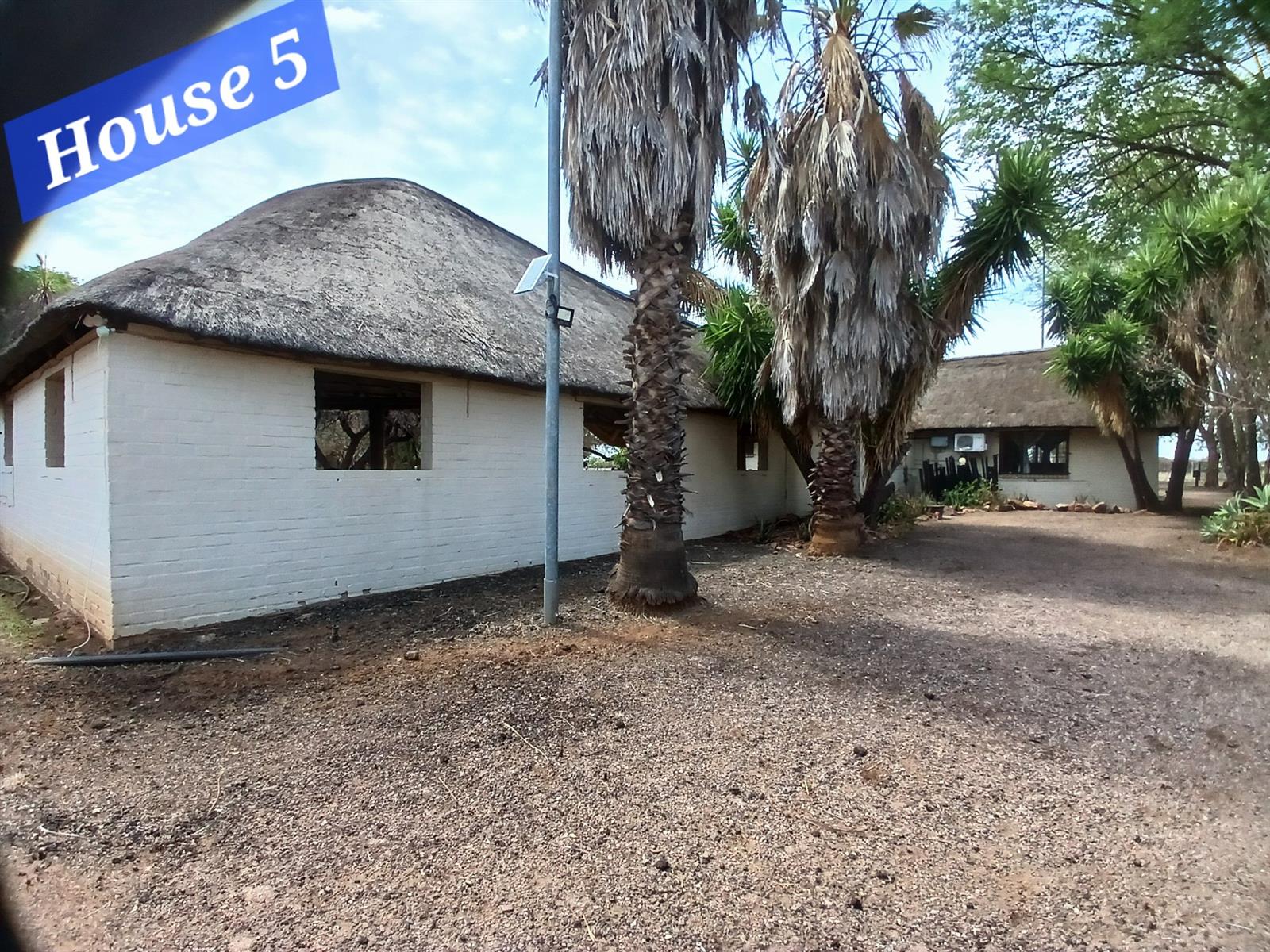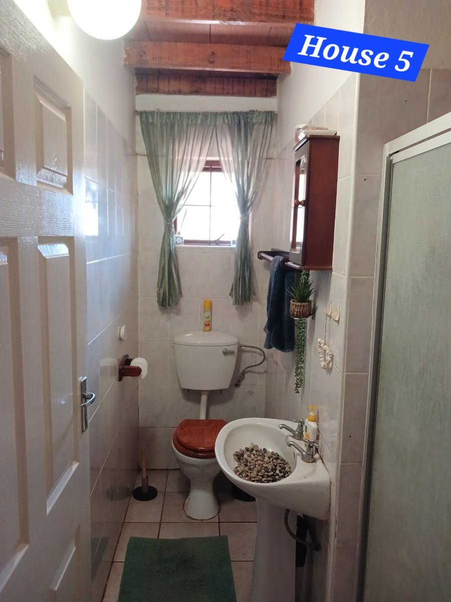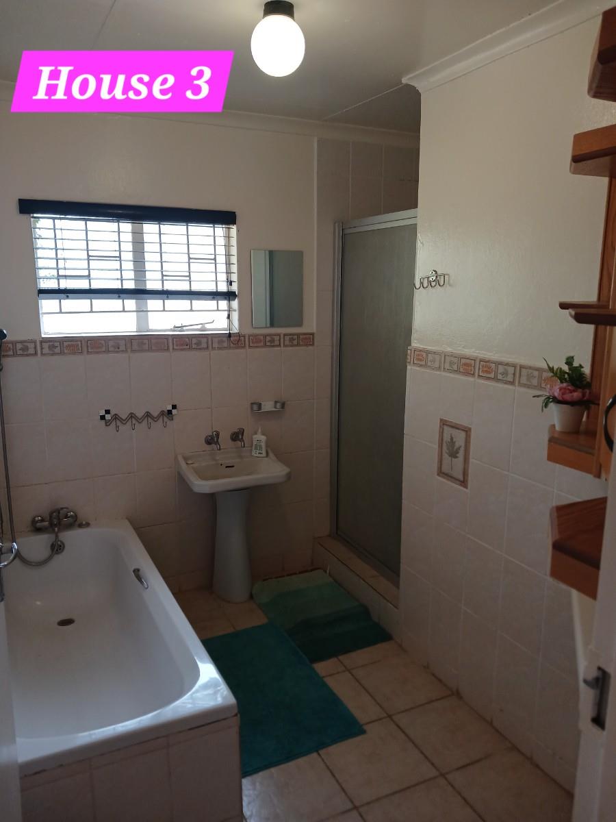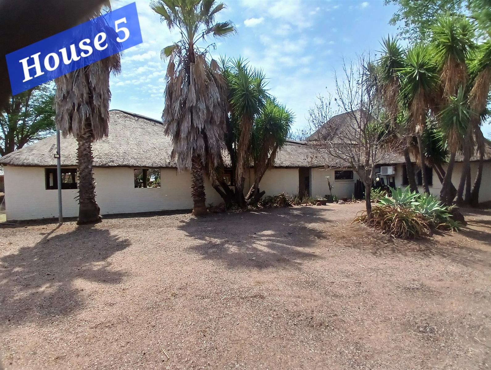 House 4: 4 bedrooms, braai room, 2 kitchens, lounge with fireplace, 2 bathrooms (1 en-suite), and wrap-around veranda