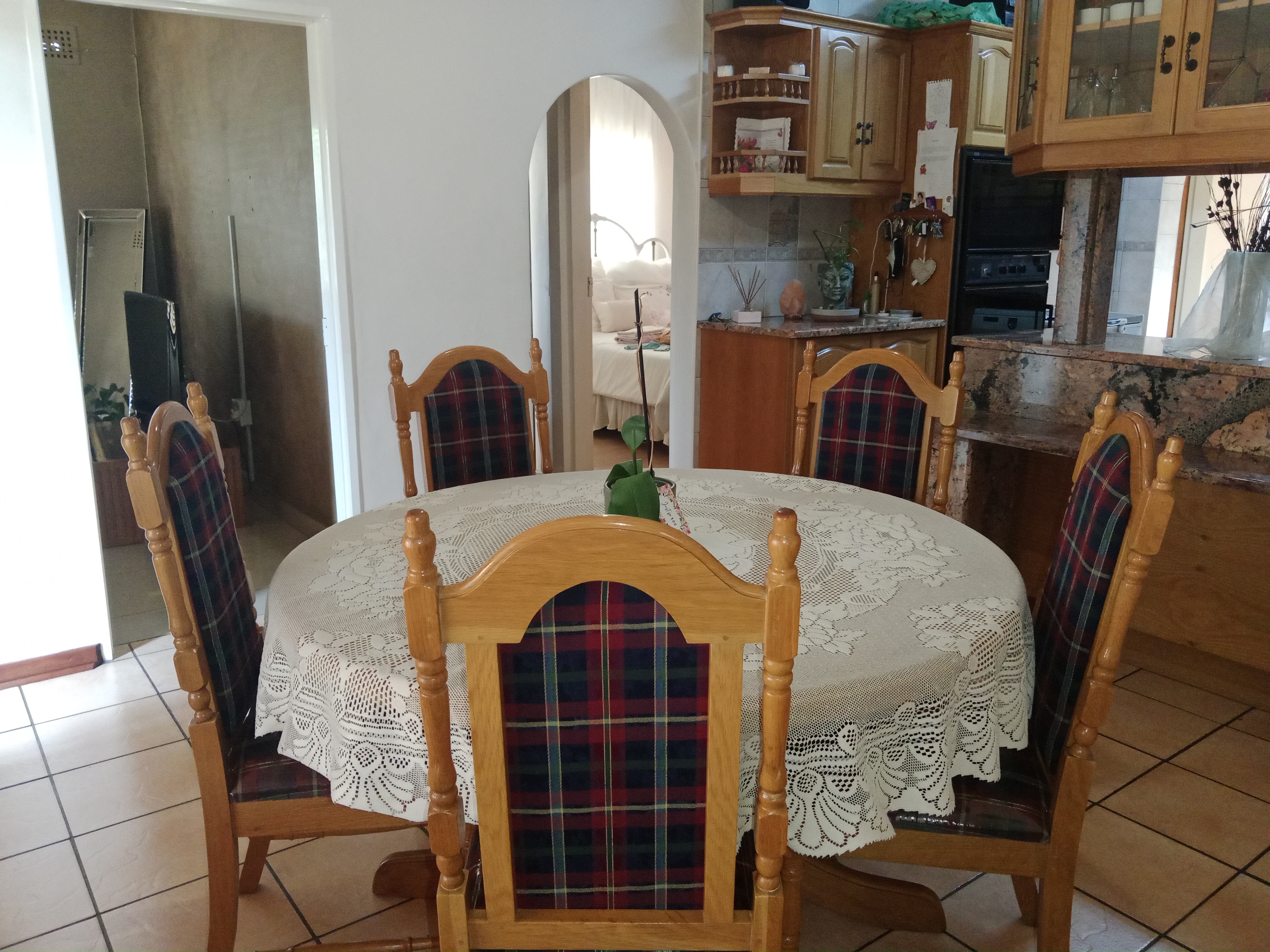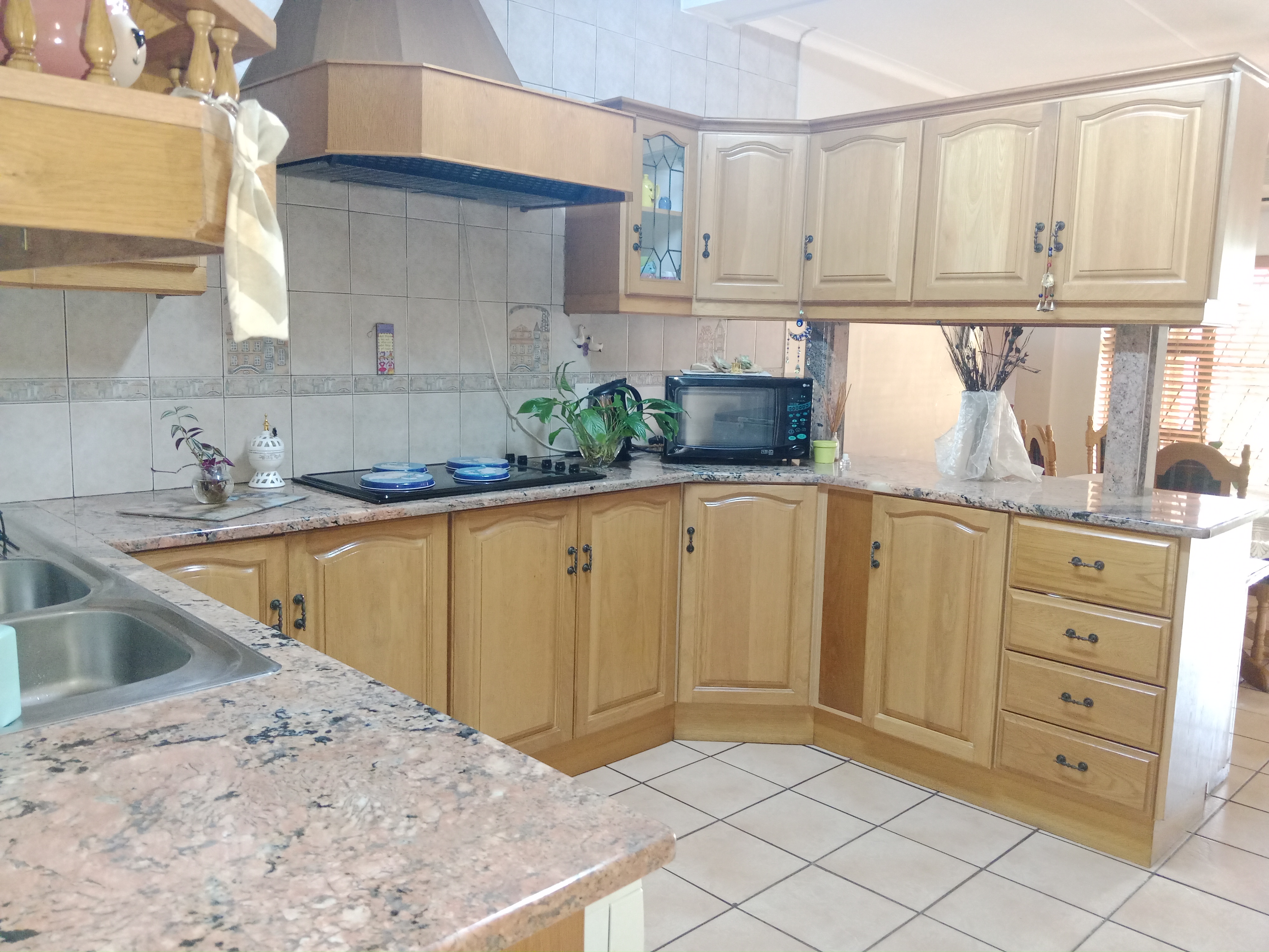 Inside, the living spaces are designed for comfort and connection. The lounge features a striking accent wall and opens seamlessly onto the outdoors through wide sliding doors, filling the area with natural light. The dining room and air-conditioned kitchen flow together perfectly—ideal for families and entertainers alike. With solid wood cupboards, gleaming granite countertops, and plenty of workspace, the kitchen is both practical and luxurious.