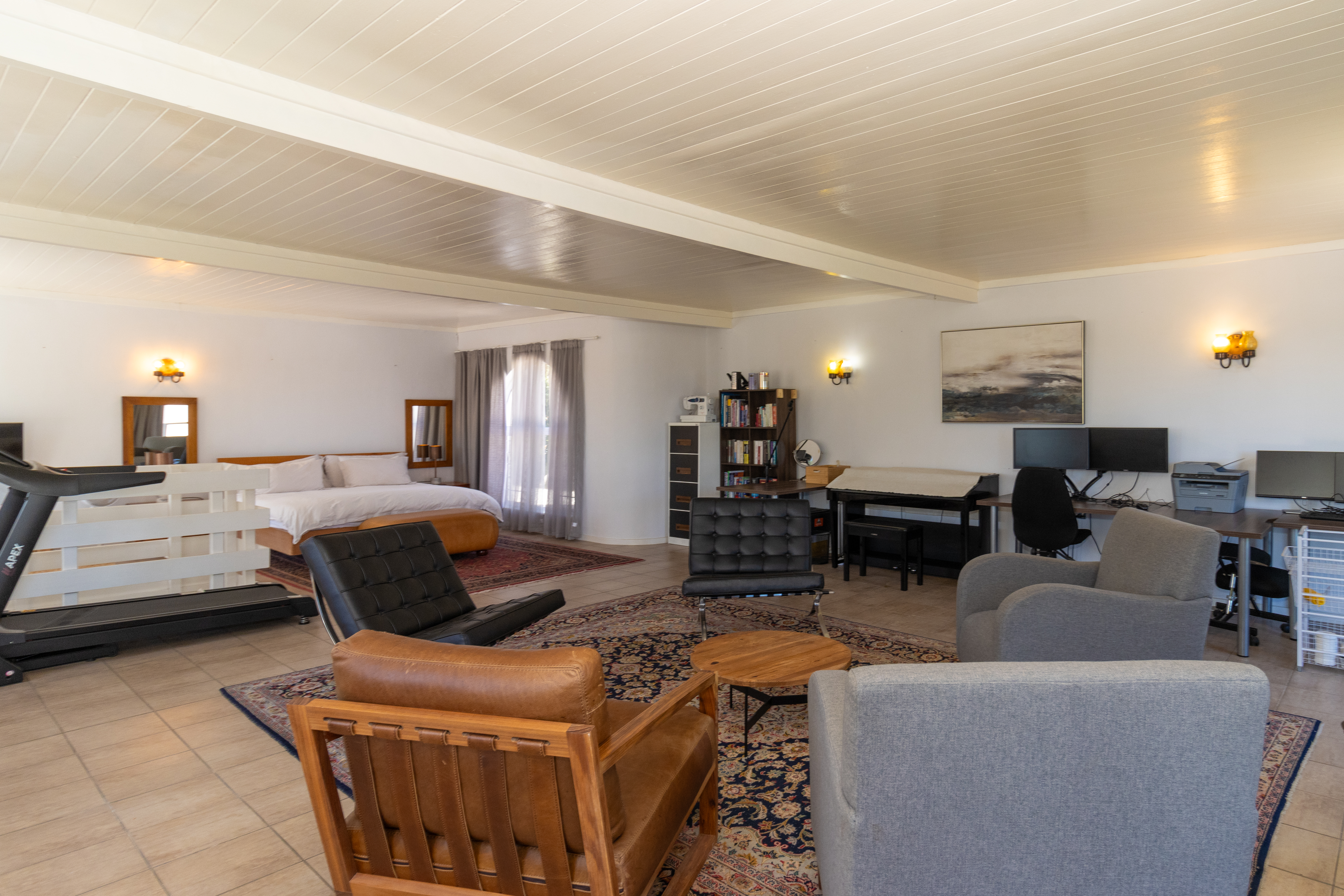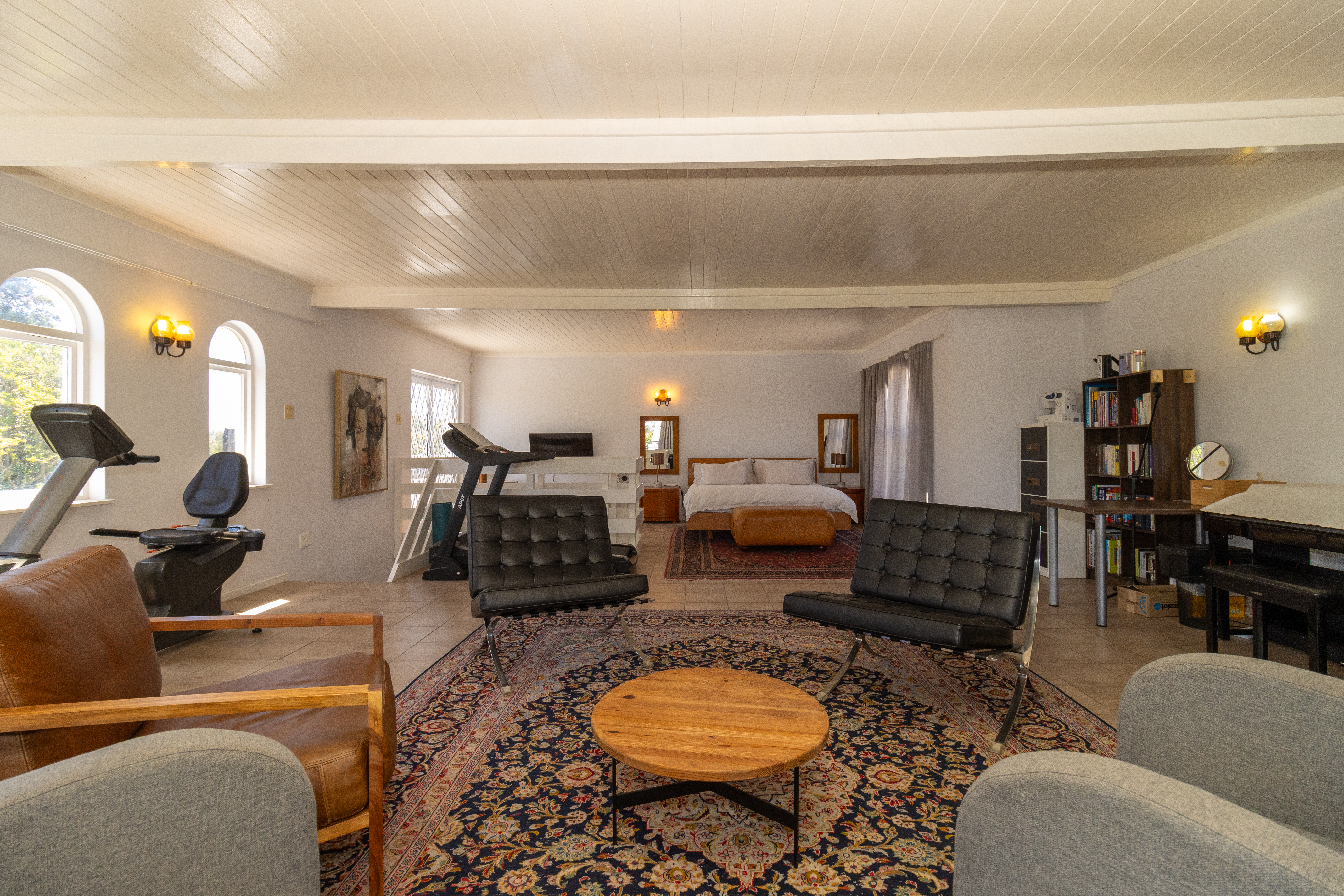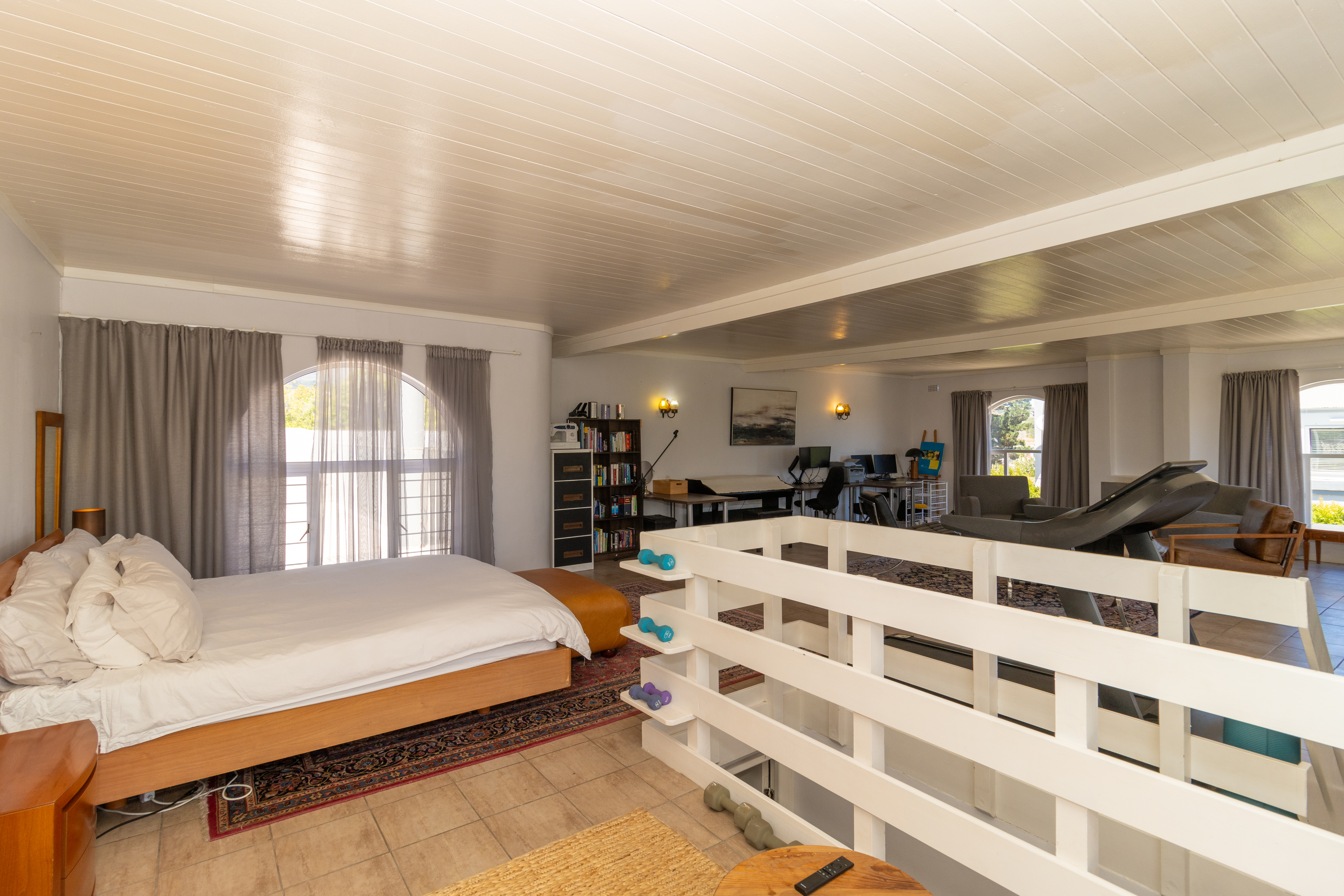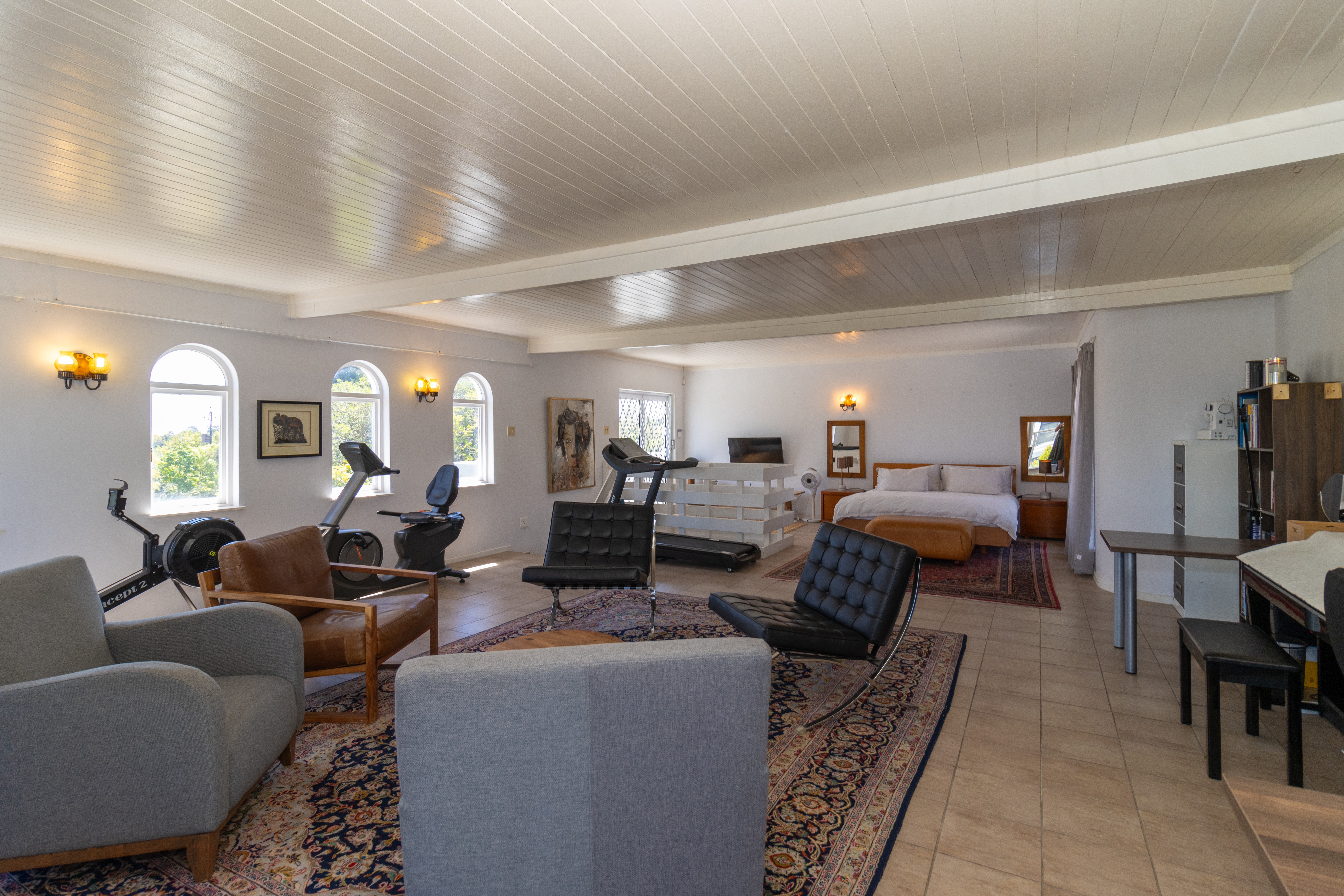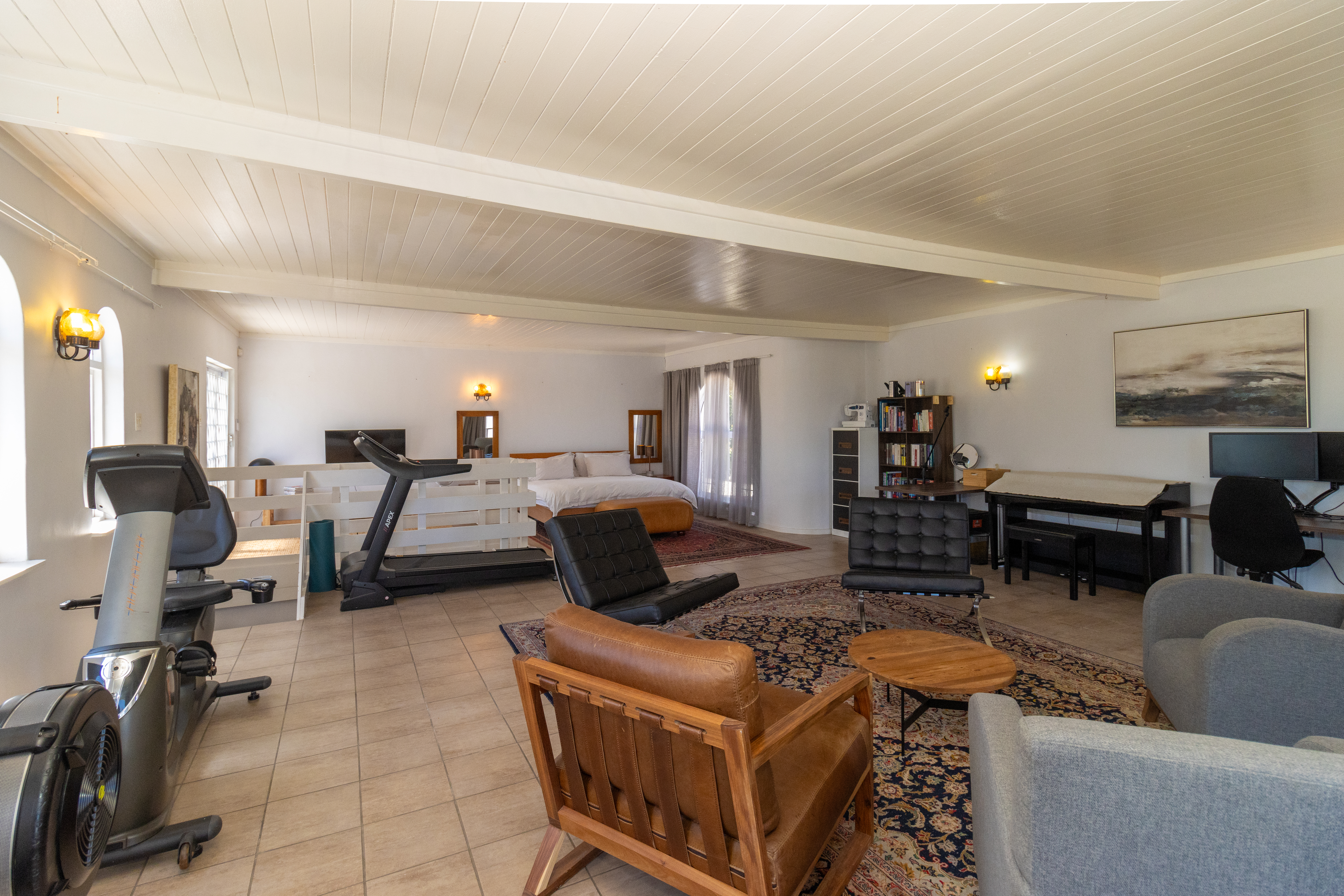 Upstairs gym with a separate open-plan bedroom