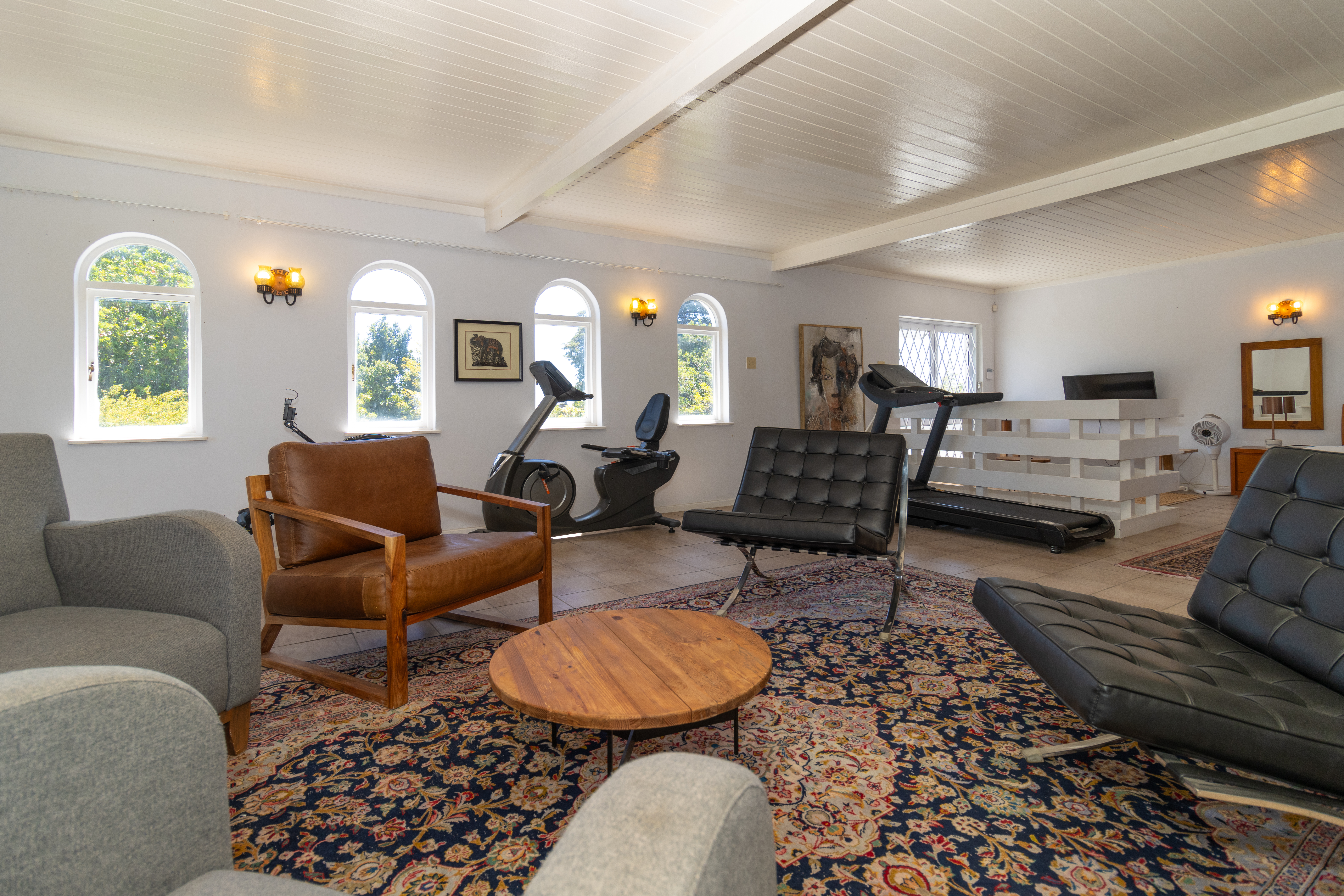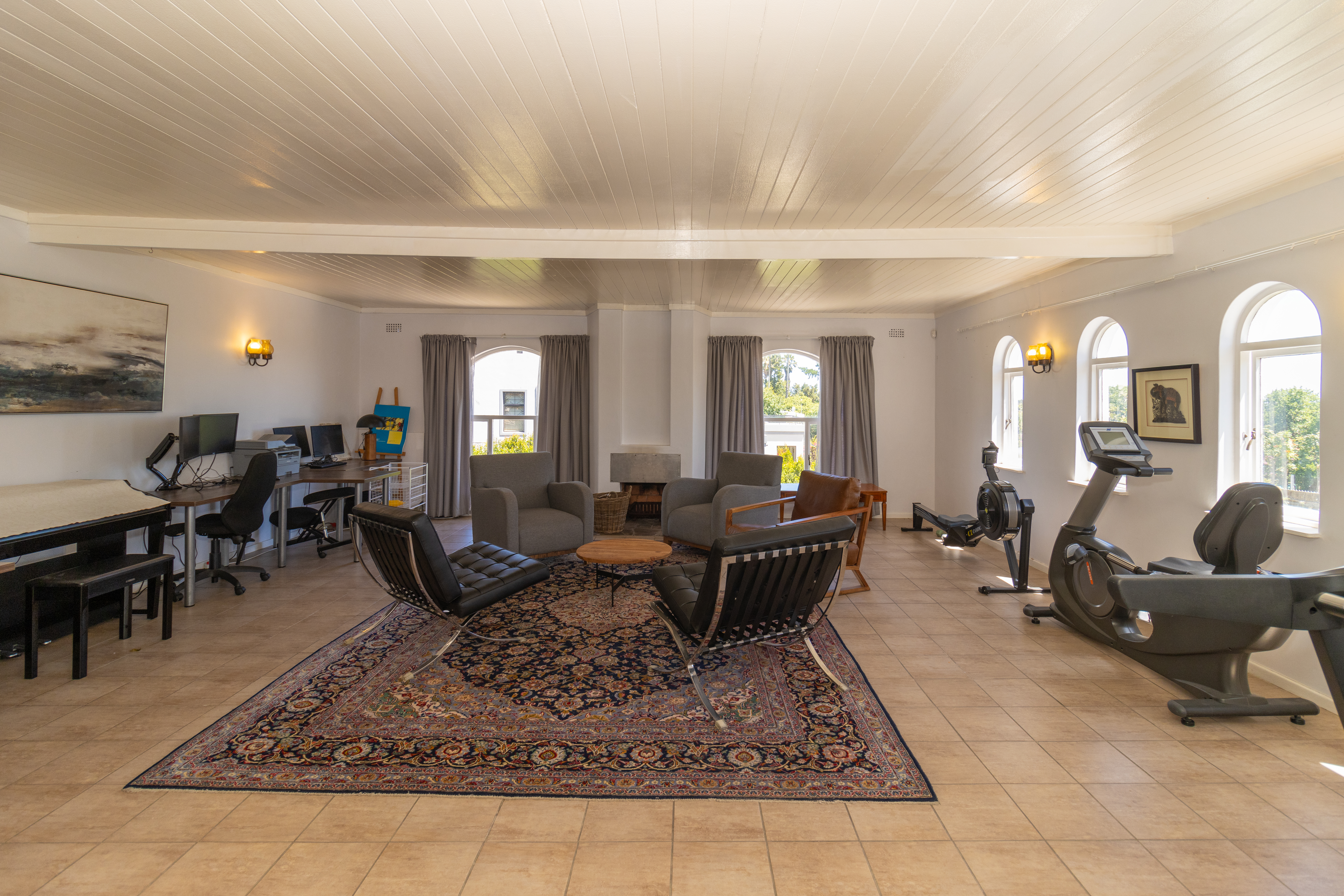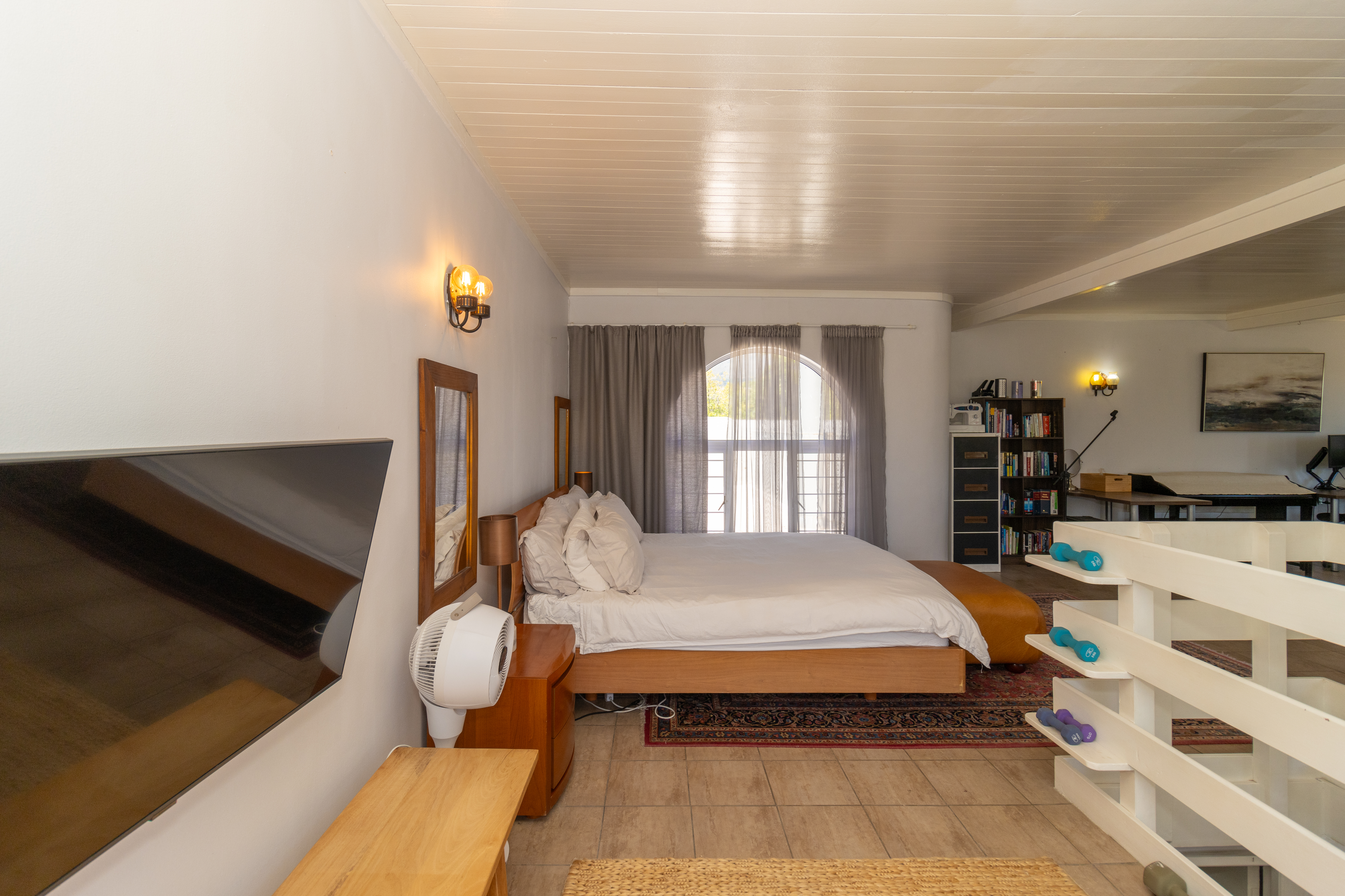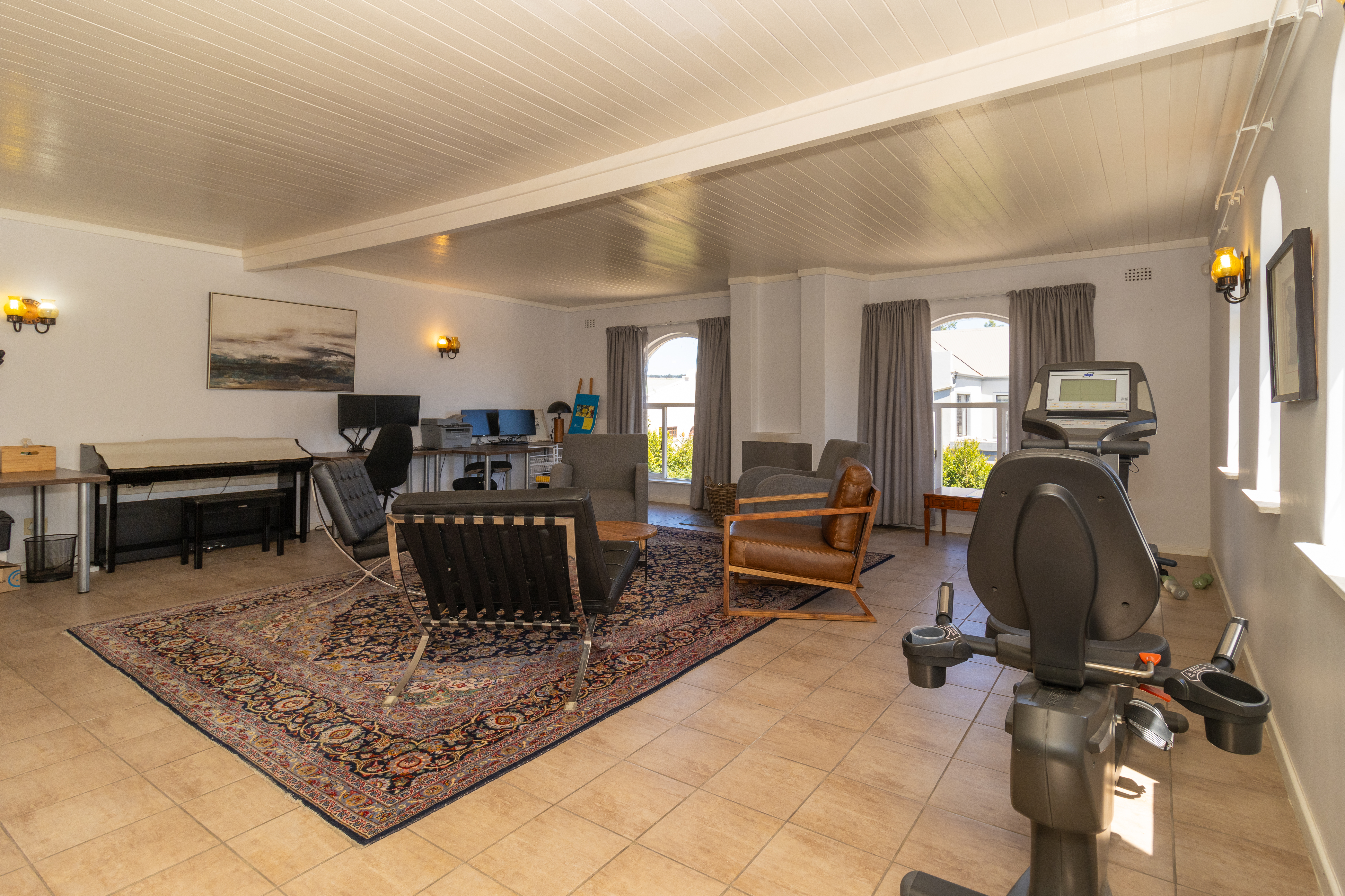 Upstairs gym with a separate open-plan bedroom